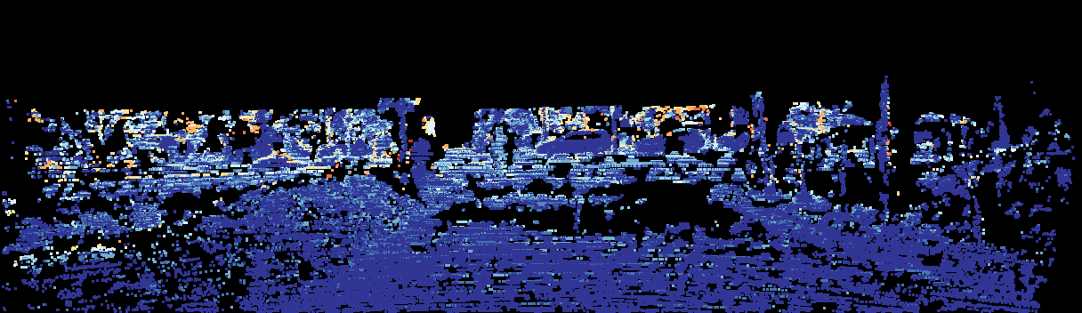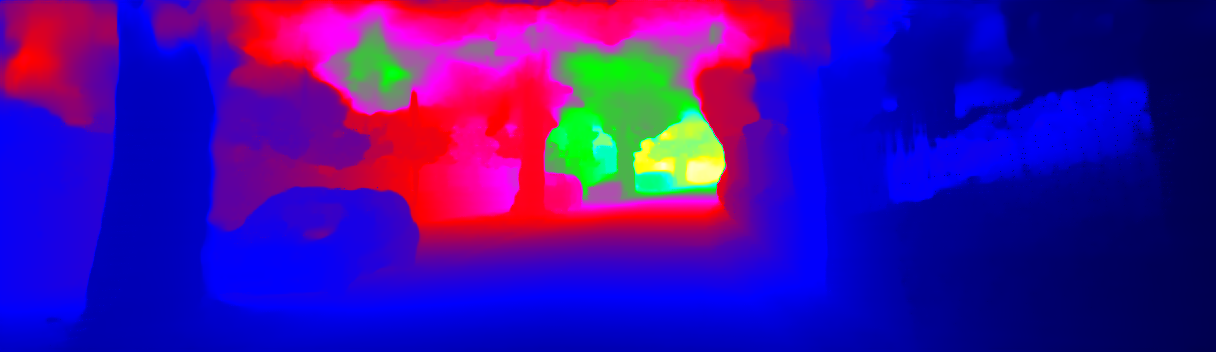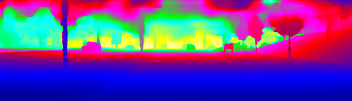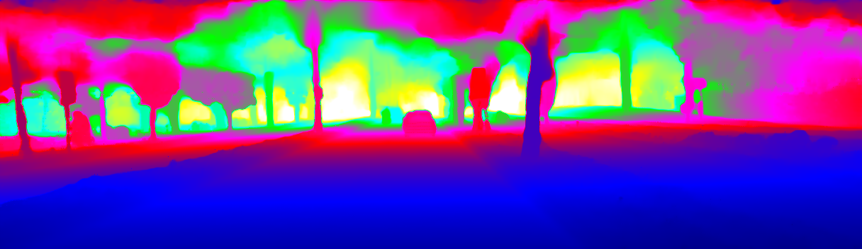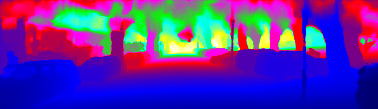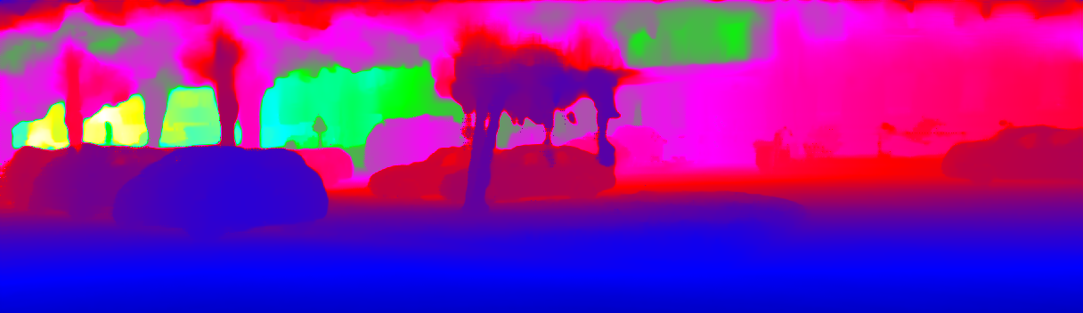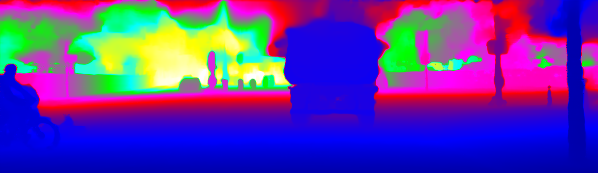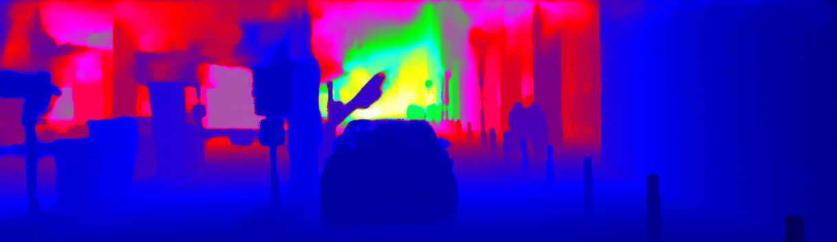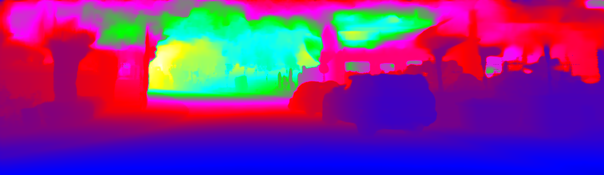 This page provides detailed results for the method(s) selected. For the first 20 test images, the percentage of erroneous pixels is depicted in the table. We use the error metric described in Sparsity Invariant CNNs (THREEDV 2017), which considers a pixel to be correctly estimated if the disparity or flow end-point error is <3px or <5% (for scene flow this criterion needs to be fulfilled for both disparity maps and the flow map). Underneath, the left input image, the estimated results and the error maps are shown (for disp_0/disp_1/flow/scene_flow, respectively). The error map uses the log-color scale described in Sparsity Invariant CNNs (THREEDV 2017), depicting correct estimates (<3px or <5% error) in blue and wrong estimates in red color tones. Dark regions in the error images denote the occluded pixels which fall outside the image boundaries. The false color maps of the results are scaled to the largest ground truth disparity values / flow magnitudes.
