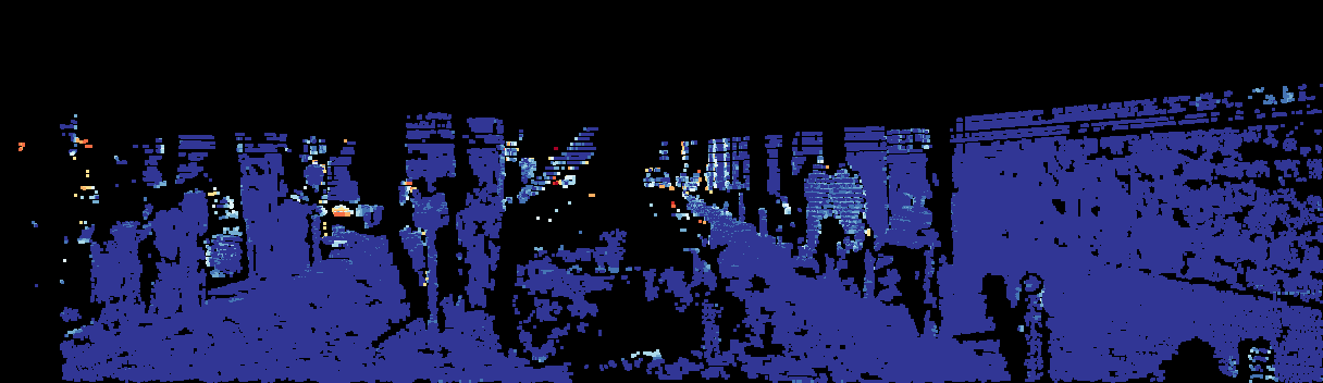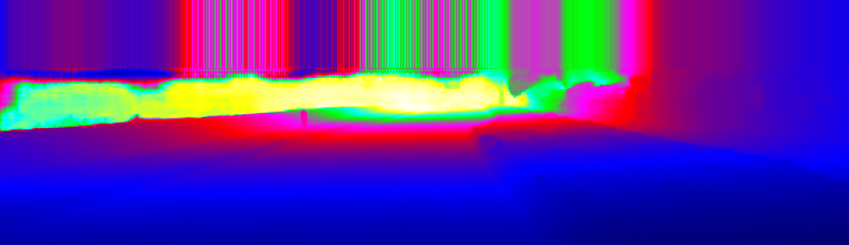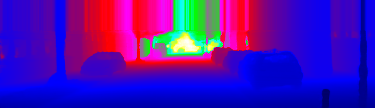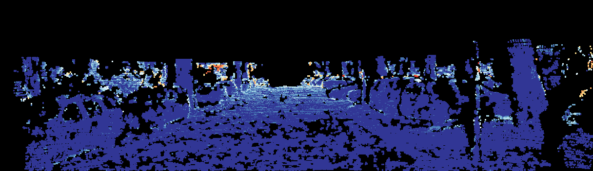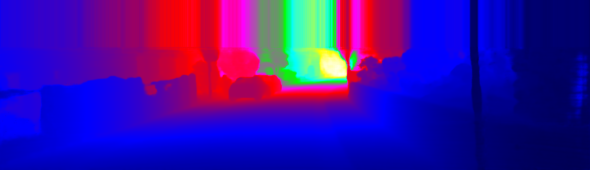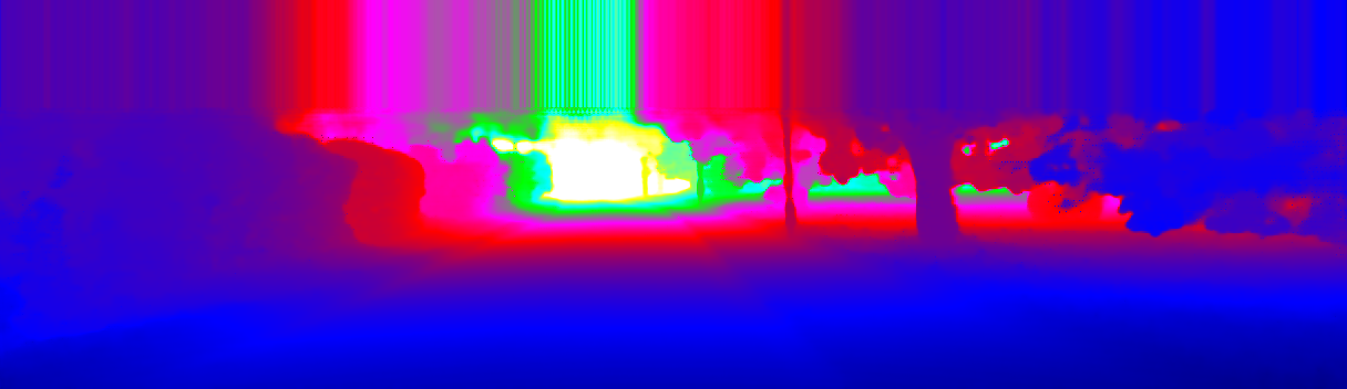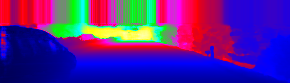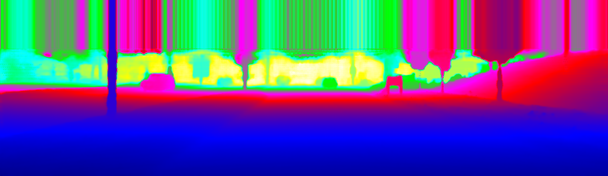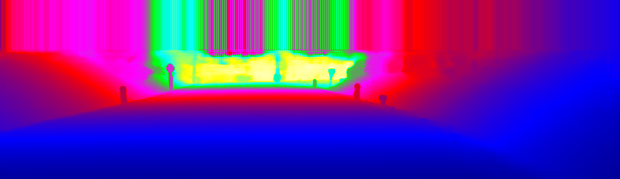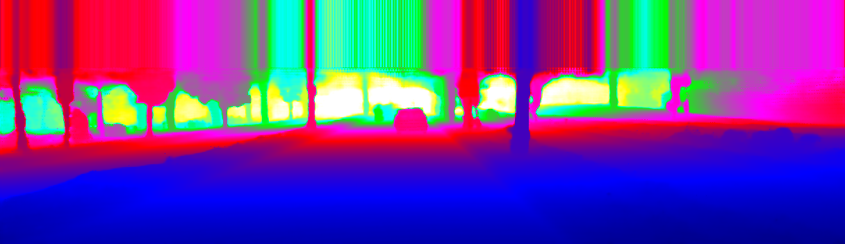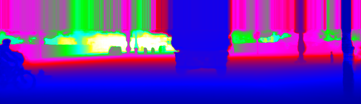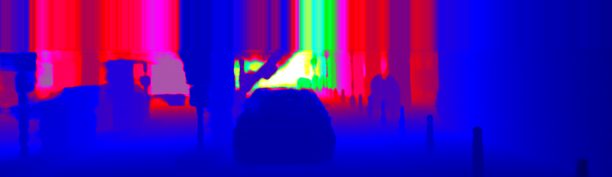 This page provides detailed results for the method(s) selected. For the first 20 test images, the percentage of erroneous pixels is depicted in the table. We use the error metric described in Sparsity Invariant CNNs (THREEDV 2017), which considers a pixel to be correctly estimated if the disparity or flow end-point error is <3px or <5% (for scene flow this criterion needs to be fulfilled for both disparity maps and the flow map). Underneath, the left input image, the estimated results and the error maps are shown (for disp_0/disp_1/flow/scene_flow, respectively). The error map uses the log-color scale described in Sparsity Invariant CNNs (THREEDV 2017), depicting correct estimates (<3px or <5% error) in blue and wrong estimates in red color tones. Dark regions in the error images denote the occluded pixels which fall outside the image boundaries. The false color maps of the results are scaled to the largest ground truth disparity values / flow magnitudes.