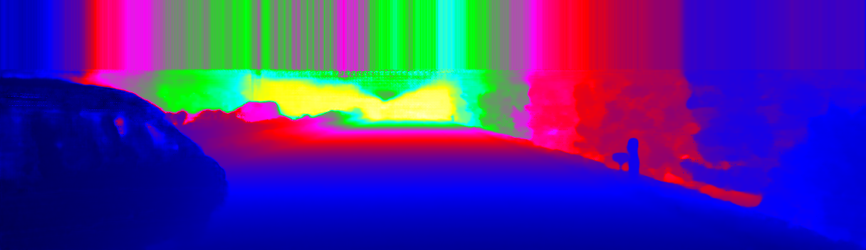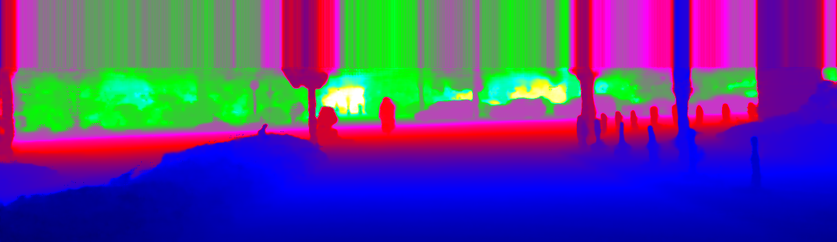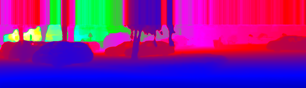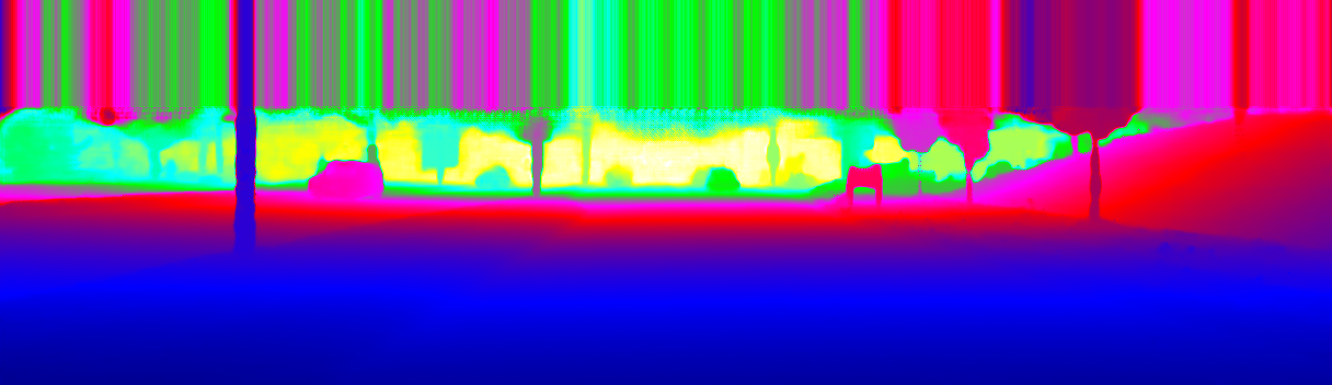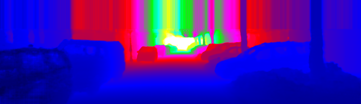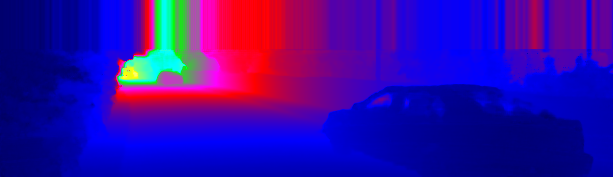 This page provides detailed results for the method(s) selected. For the first 20 test images, the percentage of erroneous pixels is depicted in the table. We use the error metric described in Sparsity Invariant CNNs (THREEDV 2017), which considers a pixel to be correctly estimated if the disparity or flow end-point error is <3px or <5% (for scene flow this criterion needs to be fulfilled for both disparity maps and the flow map). Underneath, the left input image, the estimated results and the error maps are shown (for disp_0/disp_1/flow/scene_flow, respectively). The error map uses the log-color scale described in Sparsity Invariant CNNs (THREEDV 2017), depicting correct estimates (<3px or <5% error) in blue and wrong estimates in red color tones. Dark regions in the error images denote the occluded pixels which fall outside the image boundaries. The false color maps of the results are scaled to the largest ground truth disparity values / flow magnitudes.