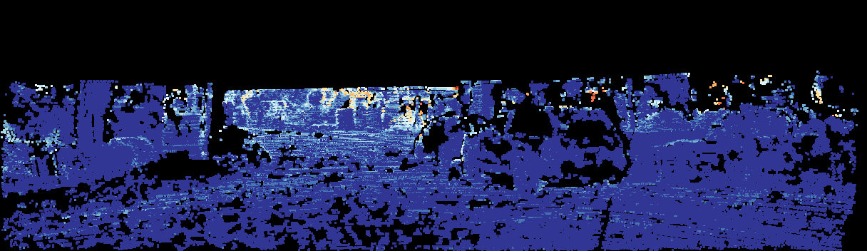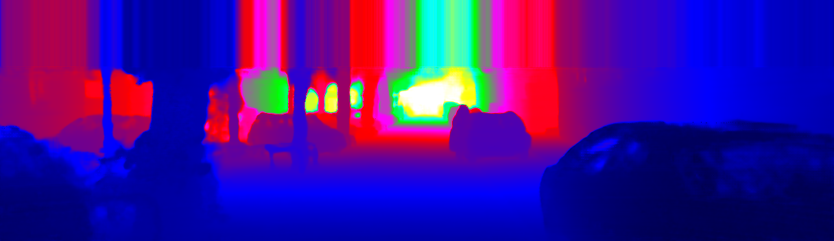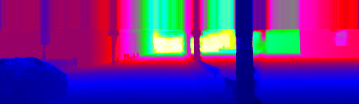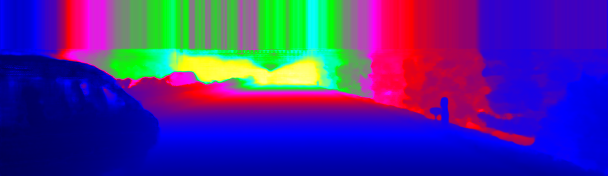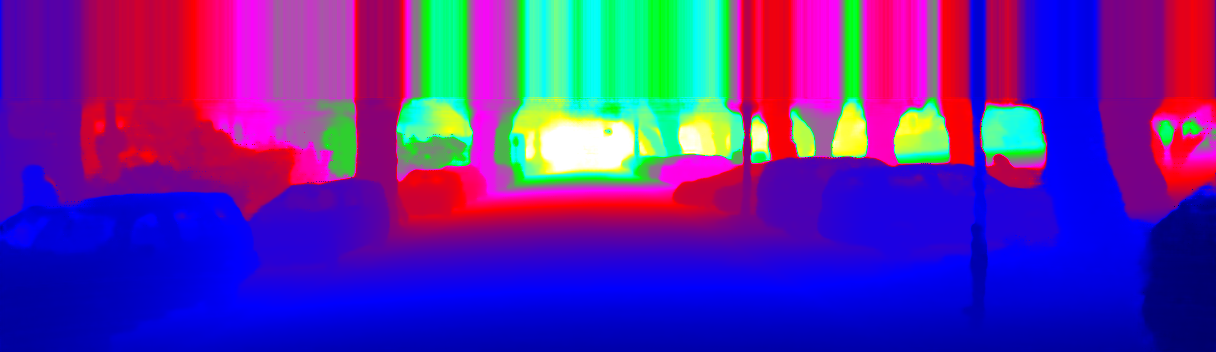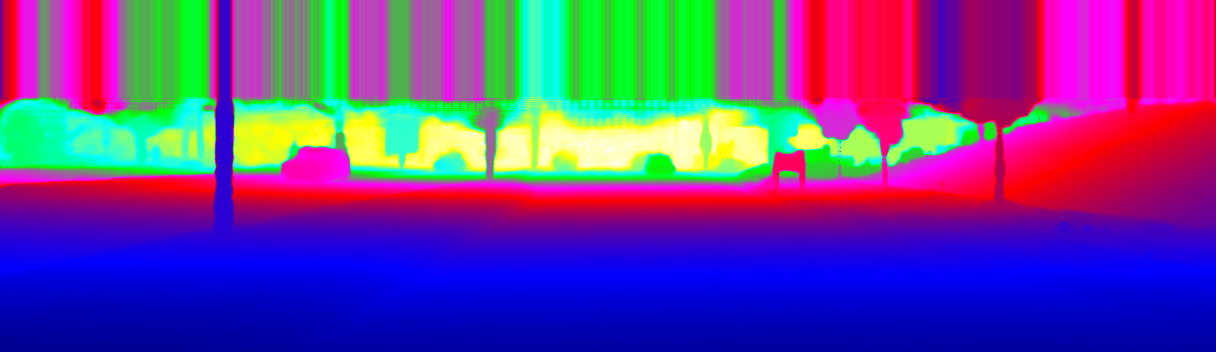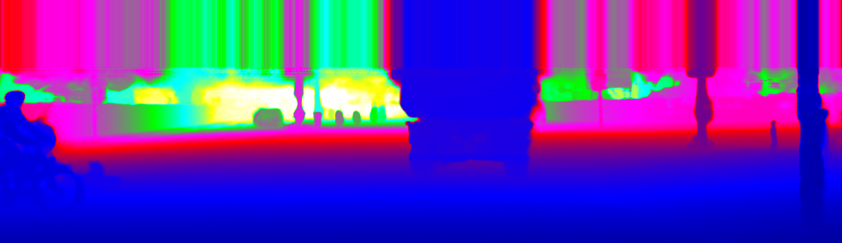 This page provides detailed results for the method(s) selected. For the first 20 test images, the percentage of erroneous pixels is depicted in the table. We use the error metric described in Sparsity Invariant CNNs (THREEDV 2017), which considers a pixel to be correctly estimated if the disparity or flow end-point error is <3px or <5% (for scene flow this criterion needs to be fulfilled for both disparity maps and the flow map). Underneath, the left input image, the estimated results and the error maps are shown (for disp_0/disp_1/flow/scene_flow, respectively). The error map uses the log-color scale described in Sparsity Invariant CNNs (THREEDV 2017), depicting correct estimates (<3px or <5% error) in blue and wrong estimates in red color tones. Dark regions in the error images denote the occluded pixels which fall outside the image boundaries. The false color maps of the results are scaled to the largest ground truth disparity values / flow magnitudes.