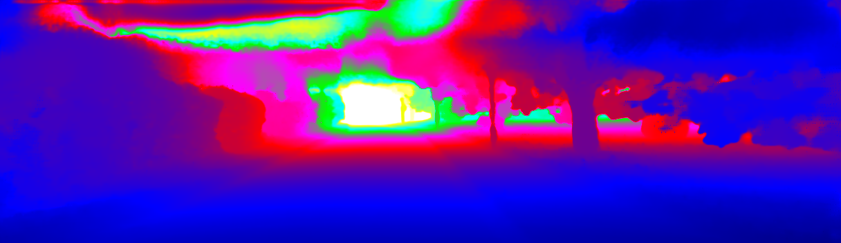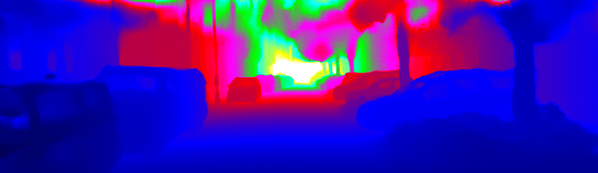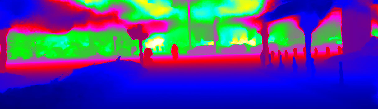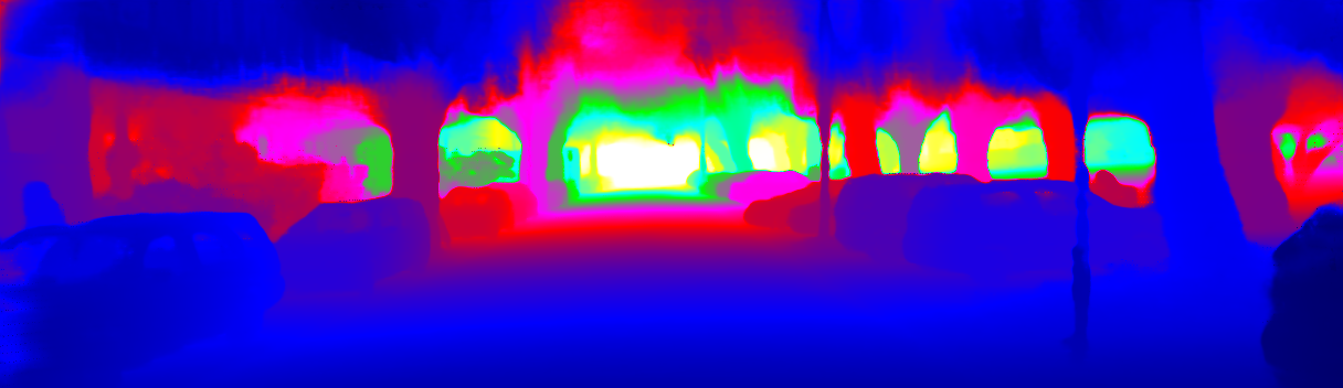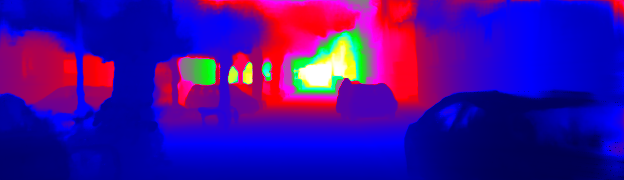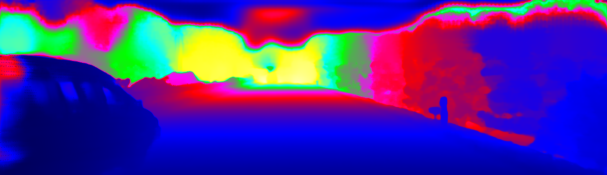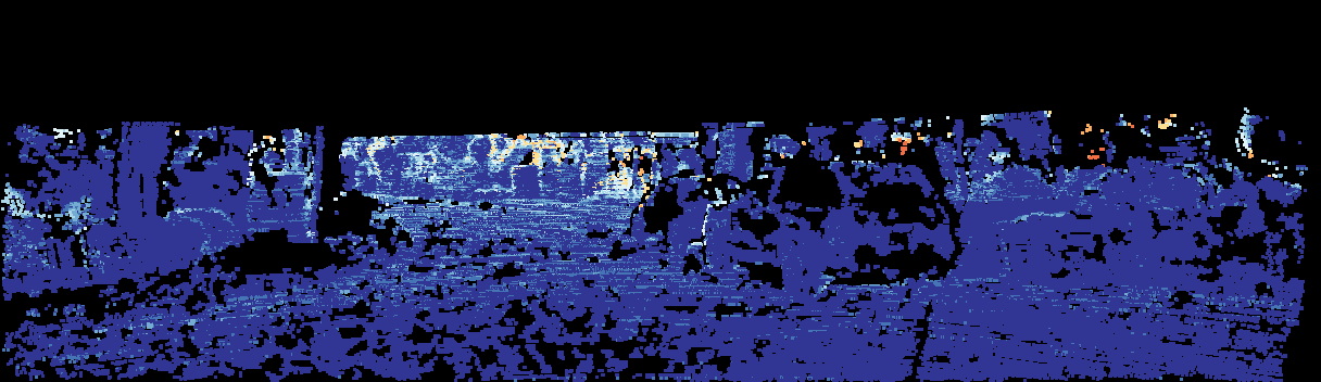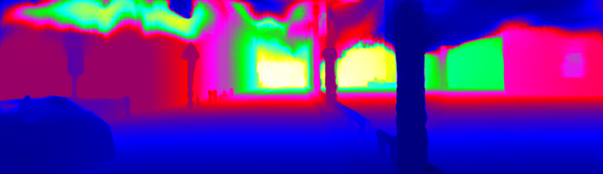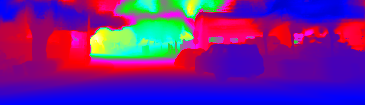 This page provides detailed results for the method(s) selected. For the first 20 test images, the percentage of erroneous pixels is depicted in the table. We use the error metric described in Sparsity Invariant CNNs (THREEDV 2017), which considers a pixel to be correctly estimated if the disparity or flow end-point error is <3px or <5% (for scene flow this criterion needs to be fulfilled for both disparity maps and the flow map). Underneath, the left input image, the estimated results and the error maps are shown (for disp_0/disp_1/flow/scene_flow, respectively). The error map uses the log-color scale described in Sparsity Invariant CNNs (THREEDV 2017), depicting correct estimates (<3px or <5% error) in blue and wrong estimates in red color tones. Dark regions in the error images denote the occluded pixels which fall outside the image boundaries. The false color maps of the results are scaled to the largest ground truth disparity values / flow magnitudes.