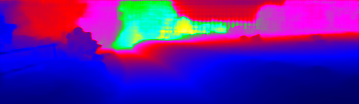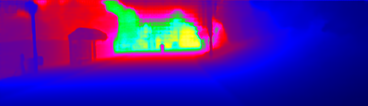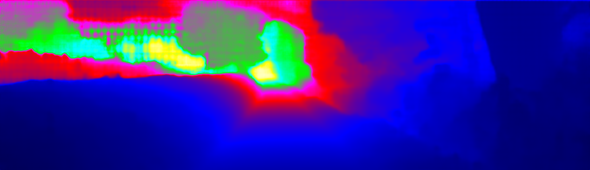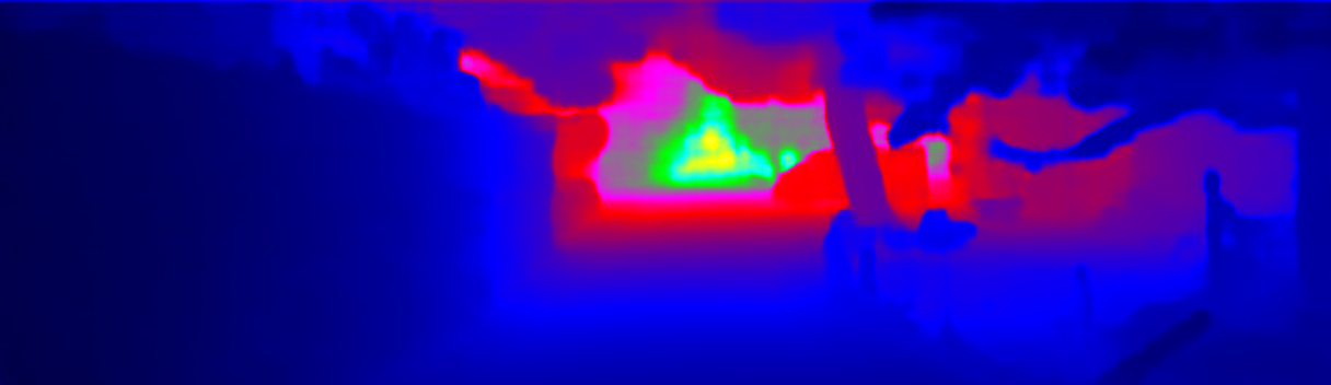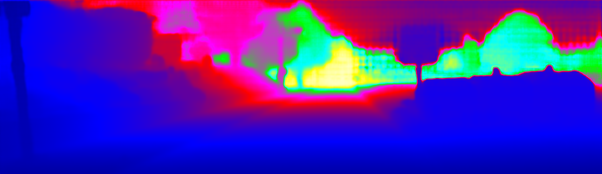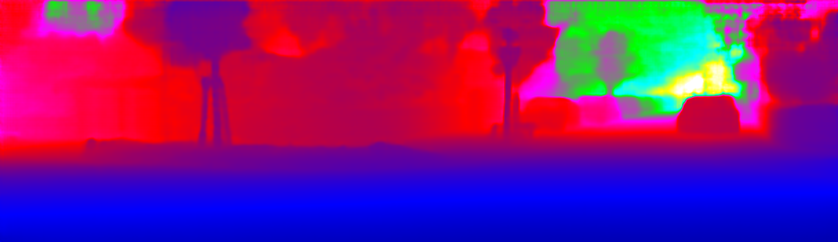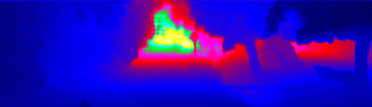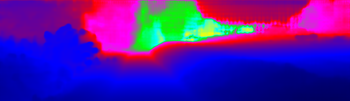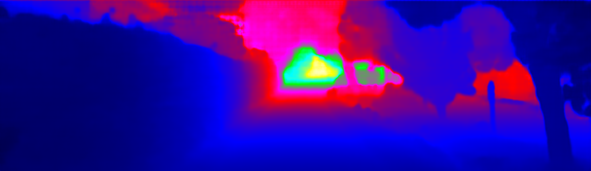 This page provides detailed results for the method(s) selected. For the first 20 test images, the percentage of erroneous pixels is depicted in the table. We use the error metric described in Sparsity Invariant CNNs (THREEDV 2017), which considers a pixel to be correctly estimated if the disparity or flow end-point error is <3px or <5% (for scene flow this criterion needs to be fulfilled for both disparity maps and the flow map). Underneath, the left input image, the estimated results and the error maps are shown (for disp_0/disp_1/flow/scene_flow, respectively). The error map uses the log-color scale described in Sparsity Invariant CNNs (THREEDV 2017), depicting correct estimates (<3px or <5% error) in blue and wrong estimates in red color tones. Dark regions in the error images denote the occluded pixels which fall outside the image boundaries. The false color maps of the results are scaled to the largest ground truth disparity values / flow magnitudes.