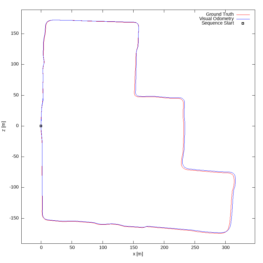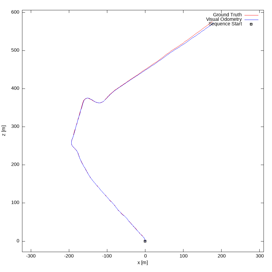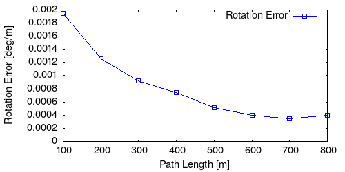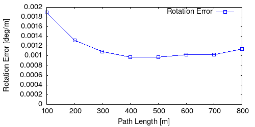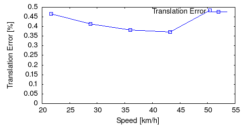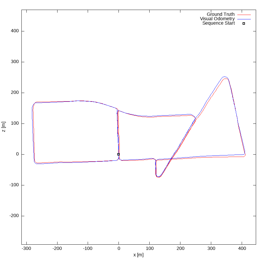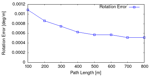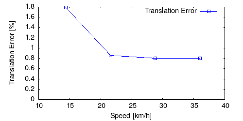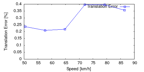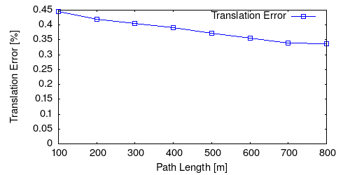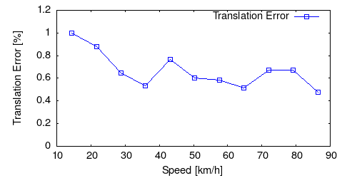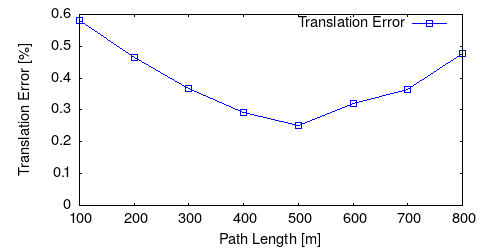From all test sequences (sequences 11-21), our benchmark computes translational and rotational errors for all possible subsequences of length (5,10,50,100,150,...,400) meters. Our evaluation ranks methods according to the average of those values, where errors are measured in percent (for translation) and in degrees per meter (for rotation). Details for different trajectory lengths and driving speeds can be found in the plots underneath. Furthermore, the first 5 test trajectories and error plots are shown below.