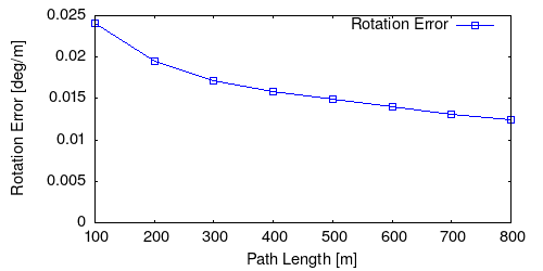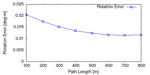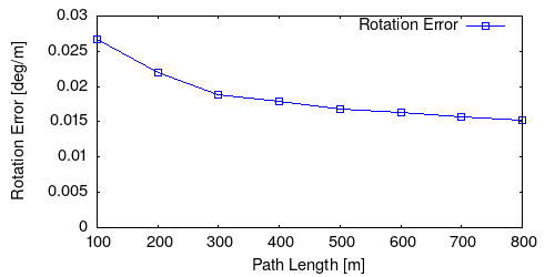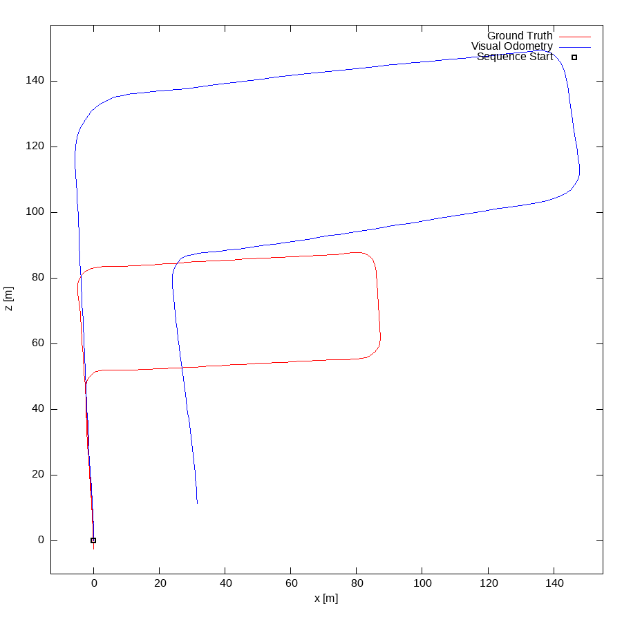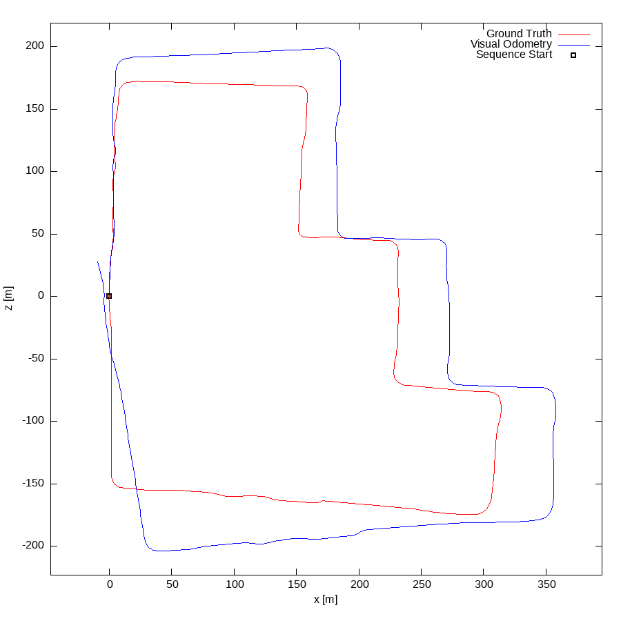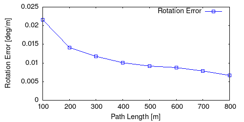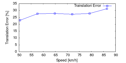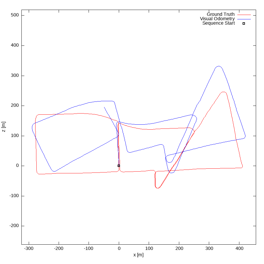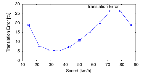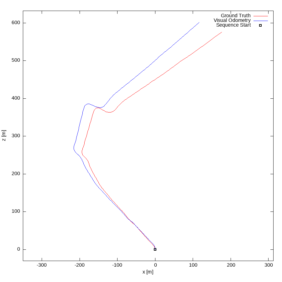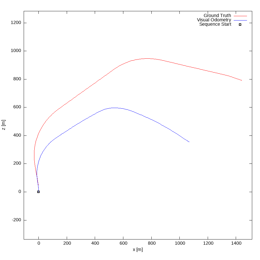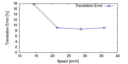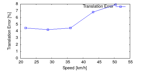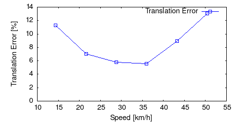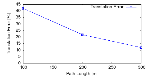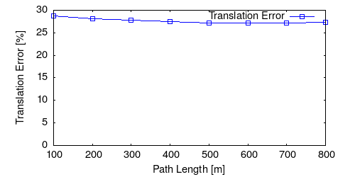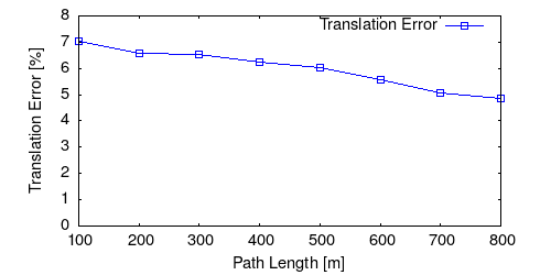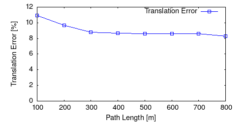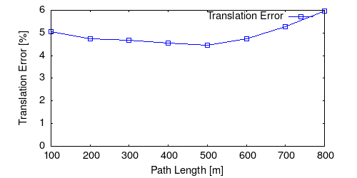 From all test sequences (sequences 11-21), our benchmark computes translational and rotational errors for all possible subsequences of length (5,10,50,100,150,...,400) meters. Our evaluation ranks methods according to the average of those values, where errors are measured in percent (for translation) and in degrees per meter (for rotation). Details for different trajectory lengths and driving speeds can be found in the plots underneath. Furthermore, the first 5 test trajectories and error plots are shown below.