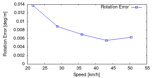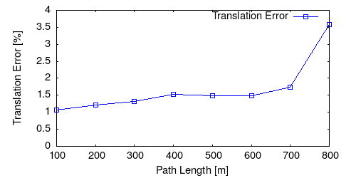 From all test sequences (sequences 11-21), our benchmark computes translational and rotational errors for all possible subsequences of length (5,10,50,100,150,...,400) meters. Our evaluation ranks methods according to the average of those values, where errors are measured in percent (for translation) and in degrees per meter (for rotation). Details for different trajectory lengths and driving speeds can be found in the plots underneath. Furthermore, the first 5 test trajectories and error plots are shown below.