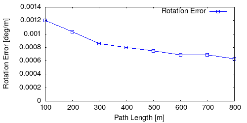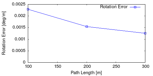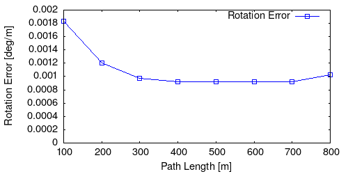 From all test sequences (sequences 11-21), our benchmark computes translational and rotational errors for all possible subsequences of length (5,10,50,100,150,...,400) meters. Our evaluation ranks methods according to the average of those values, where errors are measured in percent (for translation) and in degrees per meter (for rotation). Details for different trajectory lengths and driving speeds can be found in the plots underneath. Furthermore, the first 5 test trajectories and error plots are shown below.