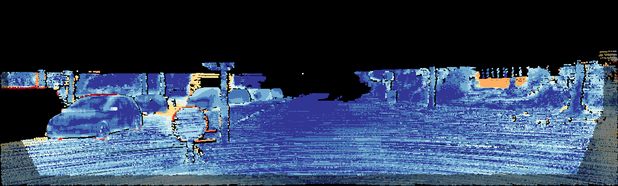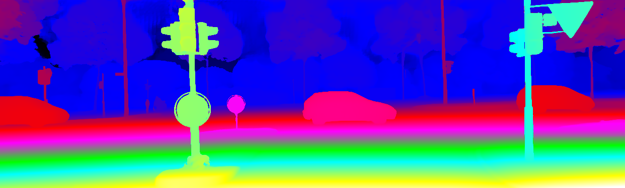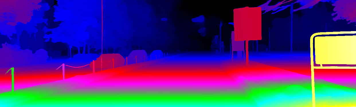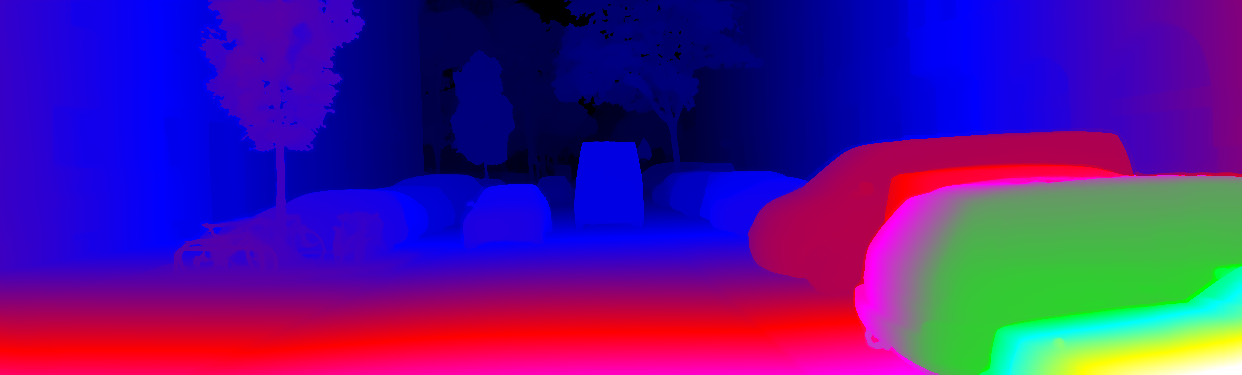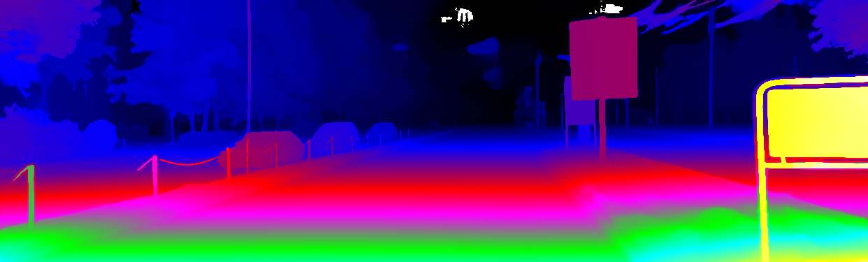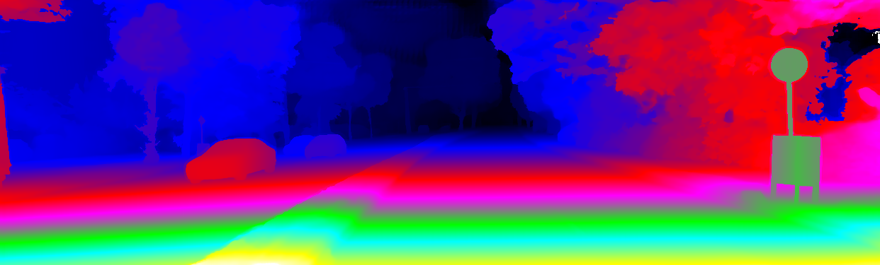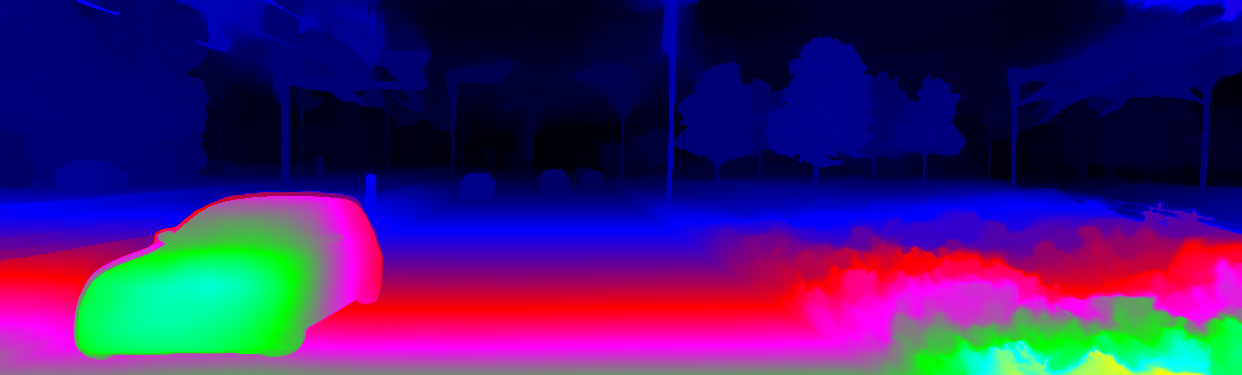 This page provides detailed results for the method(s) selected. For the first 20 test images, the percentage of erroneous pixels is depicted in the table. We use the error metric described in Object Scene Flow for Autonomous Vehicles (CVPR 2015), which considers a pixel to be correctly estimated if the disparity or flow end-point error is <3px or <5% (for scene flow this criterion needs to be fulfilled for both disparity maps and the flow map). Underneath, the left input image, the estimated results and the error maps are shown (for disp_0/disp_1/flow/scene_flow, respectively). The error map uses the log-color scale described in Object Scene Flow for Autonomous Vehicles (CVPR 2015), depicting correct estimates (<3px or <5% error) in blue and wrong estimates in red color tones. Dark regions in the error images denote the occluded pixels which fall outside the image boundaries. The false color maps of the results are scaled to the largest ground truth disparity values / flow magnitudes.