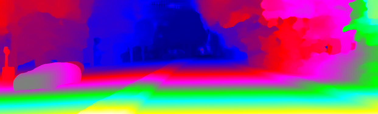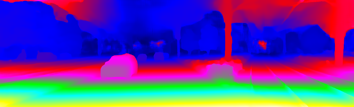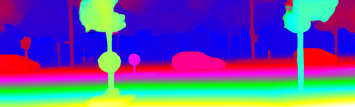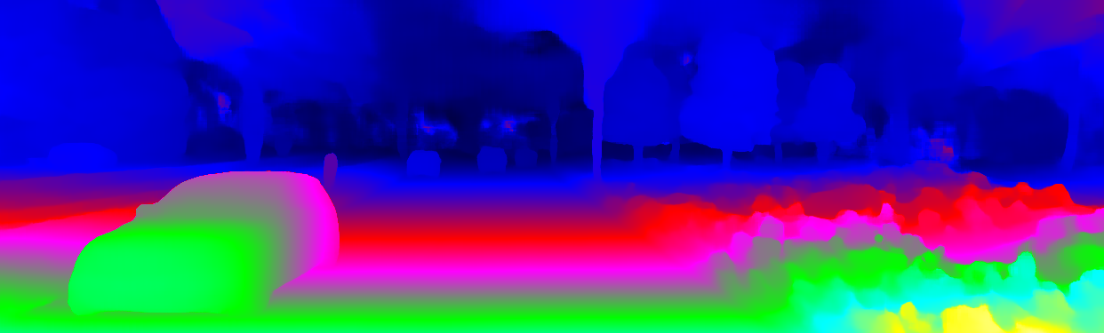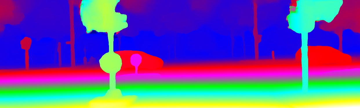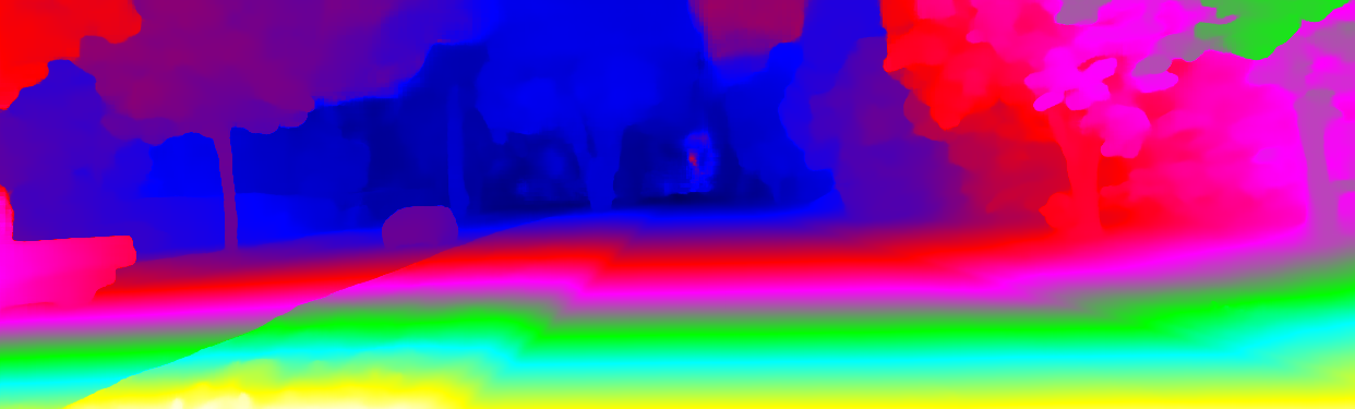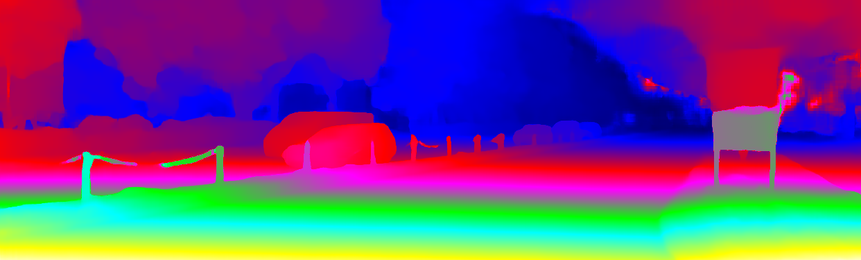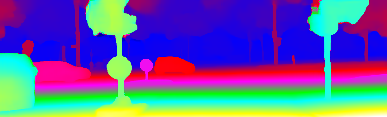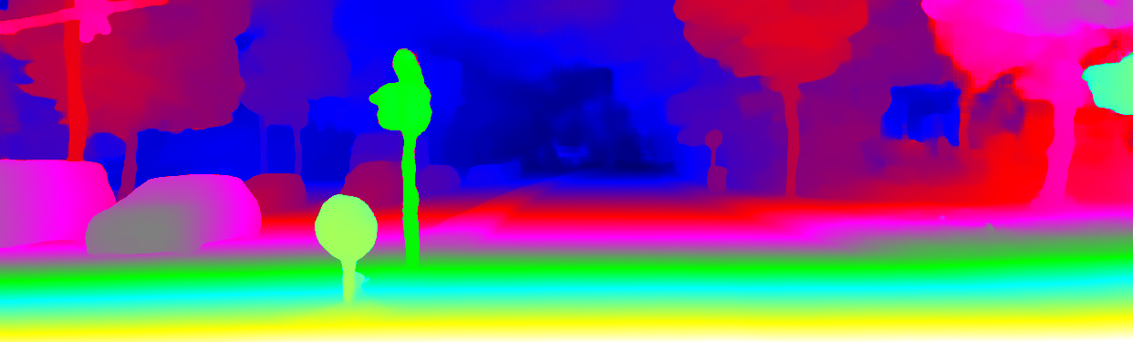 This page provides detailed results for the method(s) selected. For the first 20 test images, the percentage of erroneous pixels is depicted in the table. We use the error metric described in Object Scene Flow for Autonomous Vehicles (CVPR 2015), which considers a pixel to be correctly estimated if the disparity or flow end-point error is <3px or <5% (for scene flow this criterion needs to be fulfilled for both disparity maps and the flow map). Underneath, the left input image, the estimated results and the error maps are shown (for disp_0/disp_1/flow/scene_flow, respectively). The error map uses the log-color scale described in Object Scene Flow for Autonomous Vehicles (CVPR 2015), depicting correct estimates (<3px or <5% error) in blue and wrong estimates in red color tones. Dark regions in the error images denote the occluded pixels which fall outside the image boundaries. The false color maps of the results are scaled to the largest ground truth disparity values / flow magnitudes.