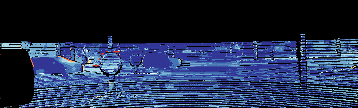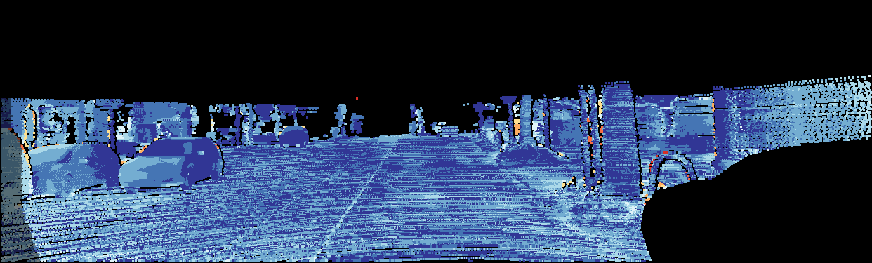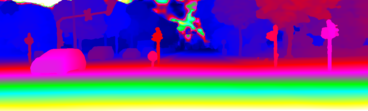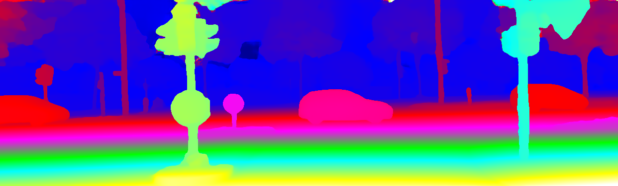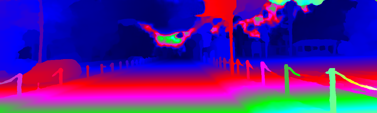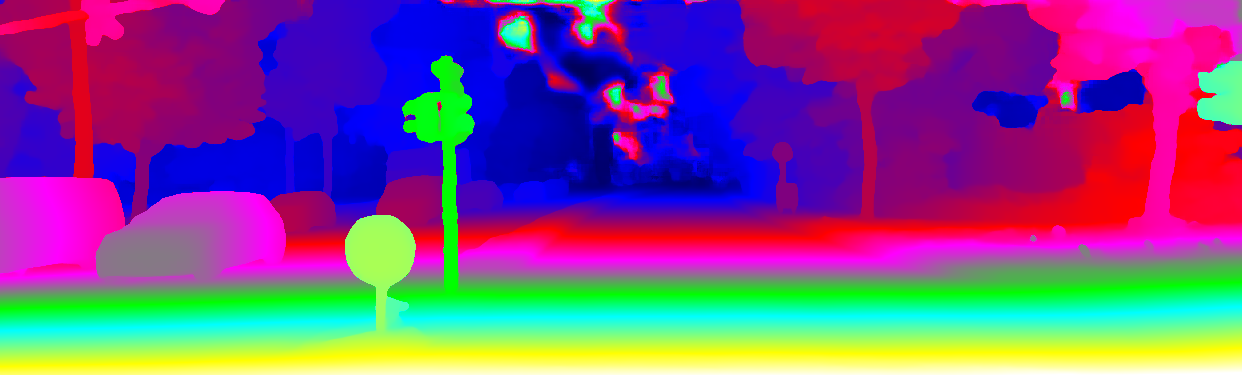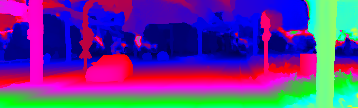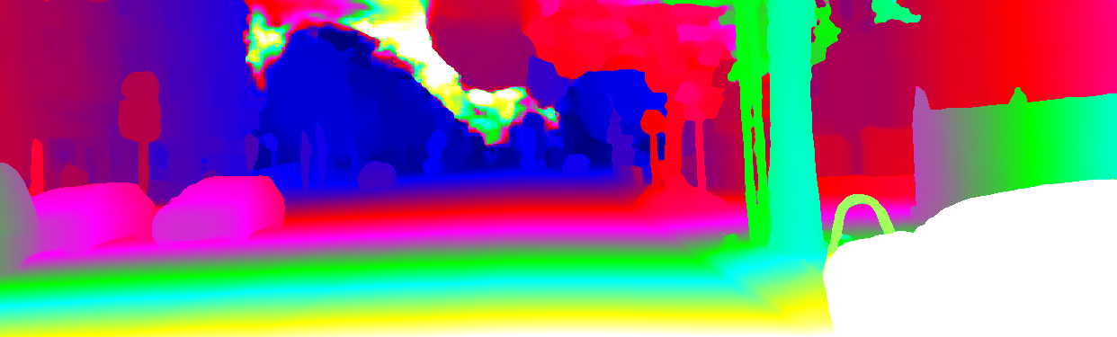 This page provides detailed results for the method(s) selected. For the first 20 test images, the percentage of erroneous pixels is depicted in the table. We use the error metric described in Object Scene Flow for Autonomous Vehicles (CVPR 2015), which considers a pixel to be correctly estimated if the disparity or flow end-point error is <3px or <5% (for scene flow this criterion needs to be fulfilled for both disparity maps and the flow map). Underneath, the left input image, the estimated results and the error maps are shown (for disp_0/disp_1/flow/scene_flow, respectively). The error map uses the log-color scale described in Object Scene Flow for Autonomous Vehicles (CVPR 2015), depicting correct estimates (<3px or <5% error) in blue and wrong estimates in red color tones. Dark regions in the error images denote the occluded pixels which fall outside the image boundaries. The false color maps of the results are scaled to the largest ground truth disparity values / flow magnitudes.