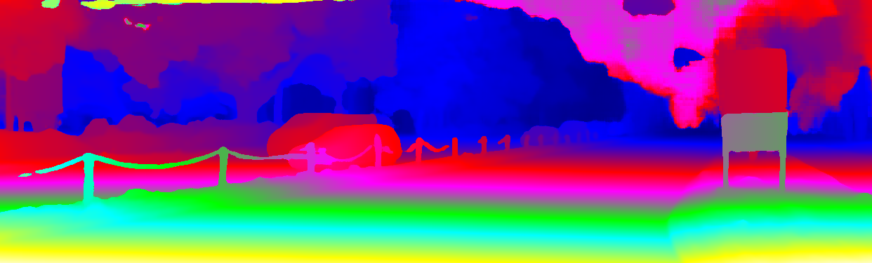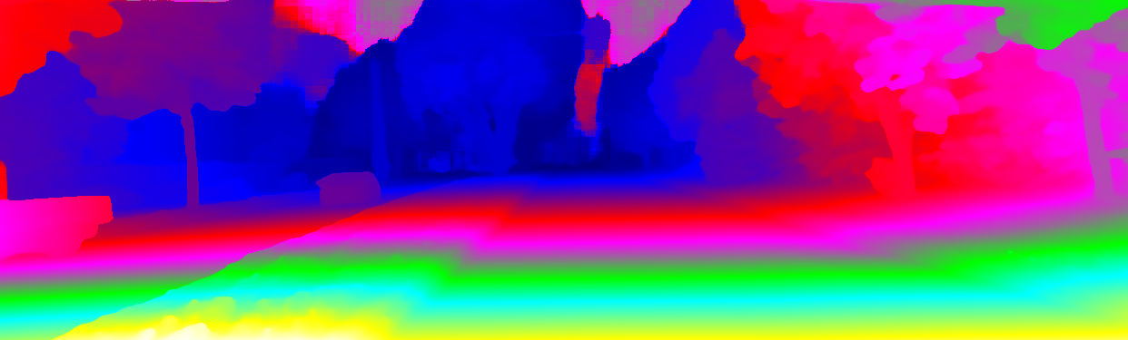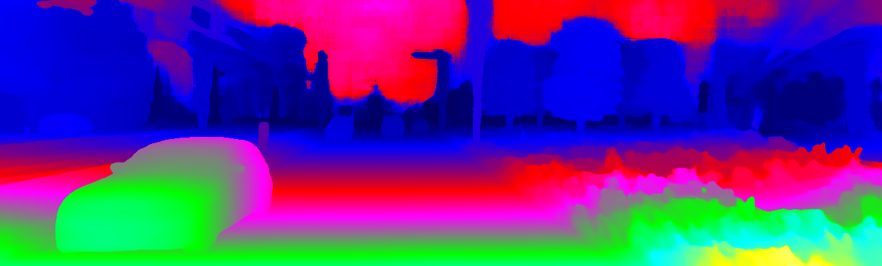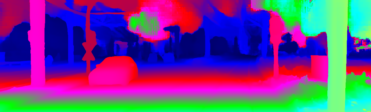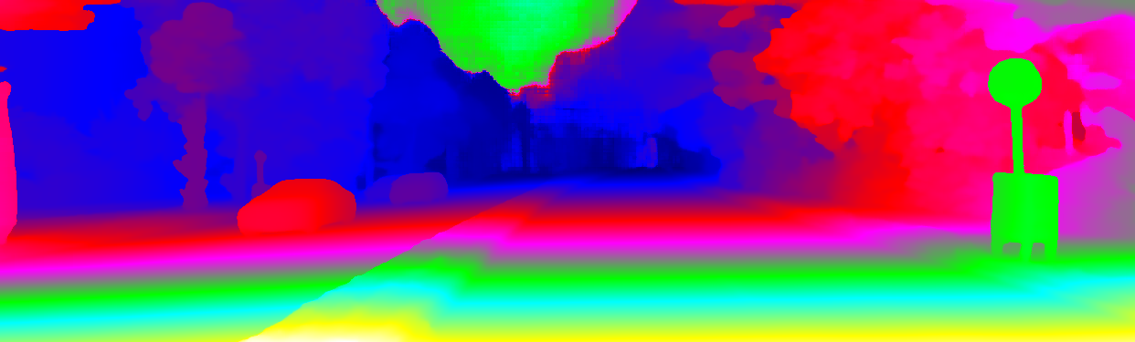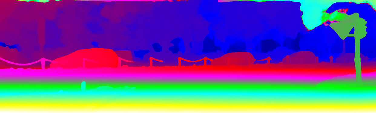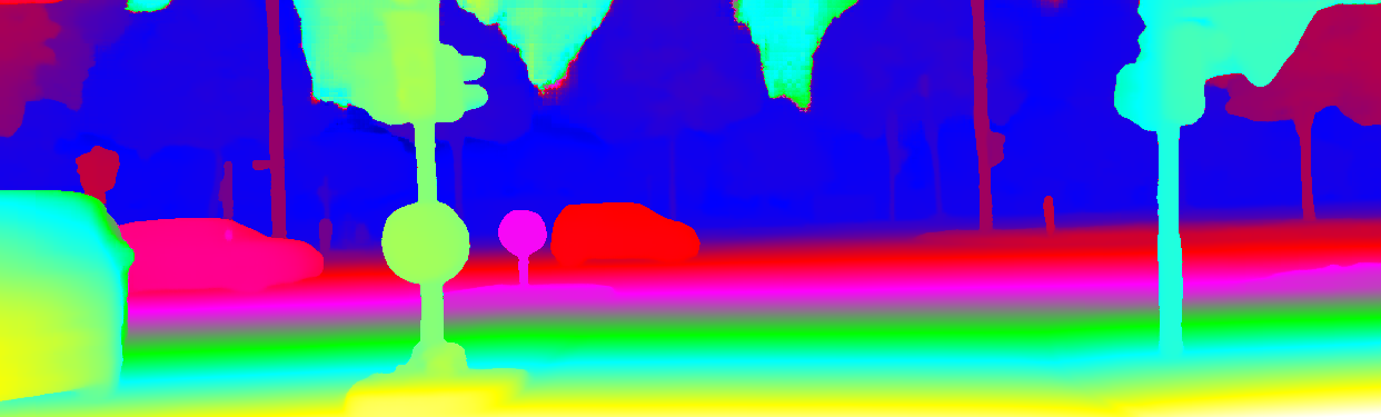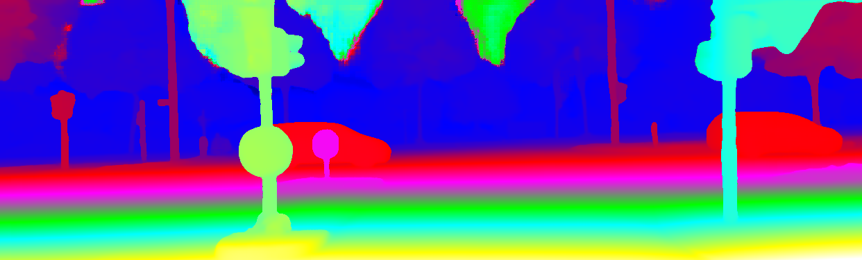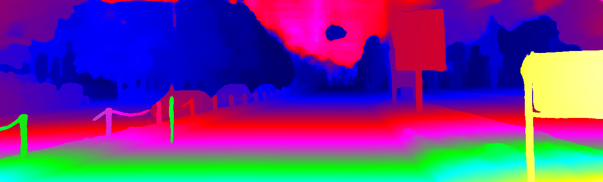 This page provides detailed results for the method(s) selected. For the first 20 test images, the percentage of erroneous pixels is depicted in the table. We use the error metric described in Object Scene Flow for Autonomous Vehicles (CVPR 2015), which considers a pixel to be correctly estimated if the disparity or flow end-point error is <3px or <5% (for scene flow this criterion needs to be fulfilled for both disparity maps and the flow map). Underneath, the left input image, the estimated results and the error maps are shown (for disp_0/disp_1/flow/scene_flow, respectively). The error map uses the log-color scale described in Object Scene Flow for Autonomous Vehicles (CVPR 2015), depicting correct estimates (<3px or <5% error) in blue and wrong estimates in red color tones. Dark regions in the error images denote the occluded pixels which fall outside the image boundaries. The false color maps of the results are scaled to the largest ground truth disparity values / flow magnitudes.
