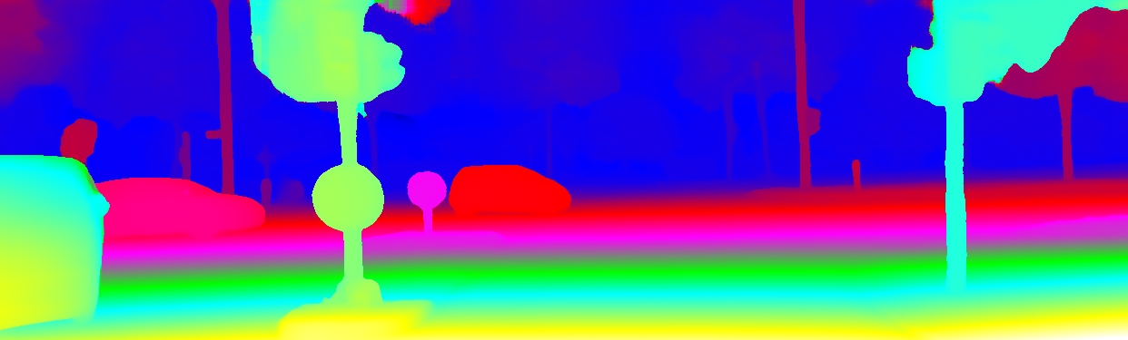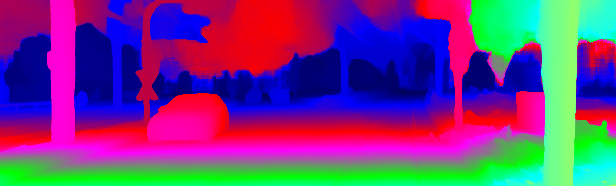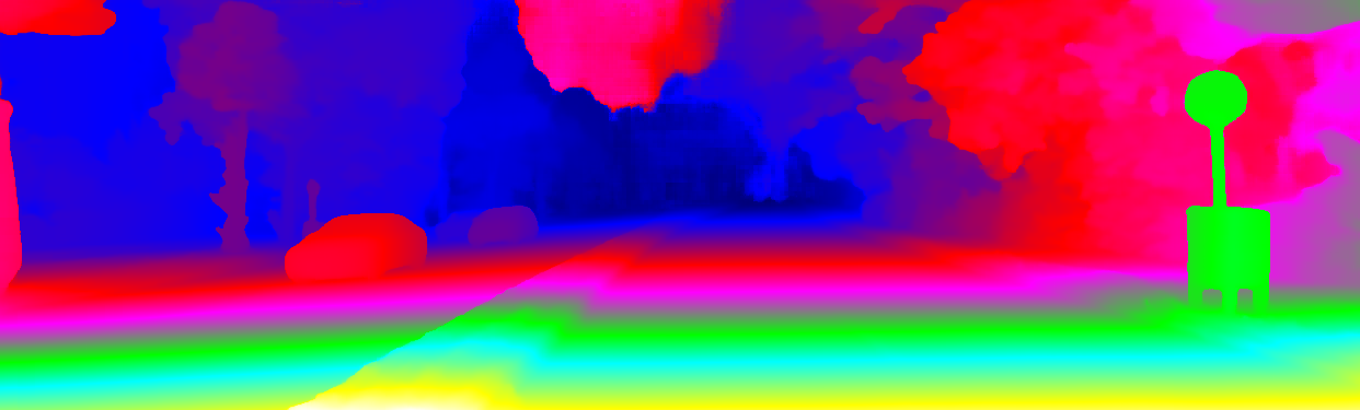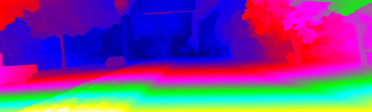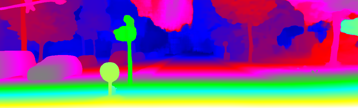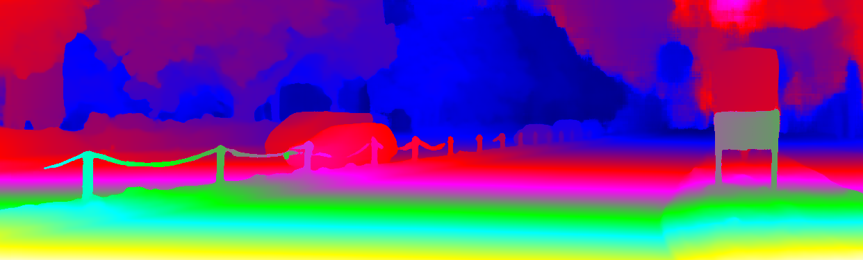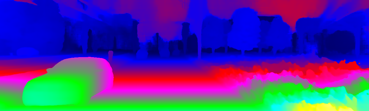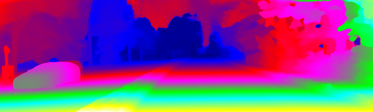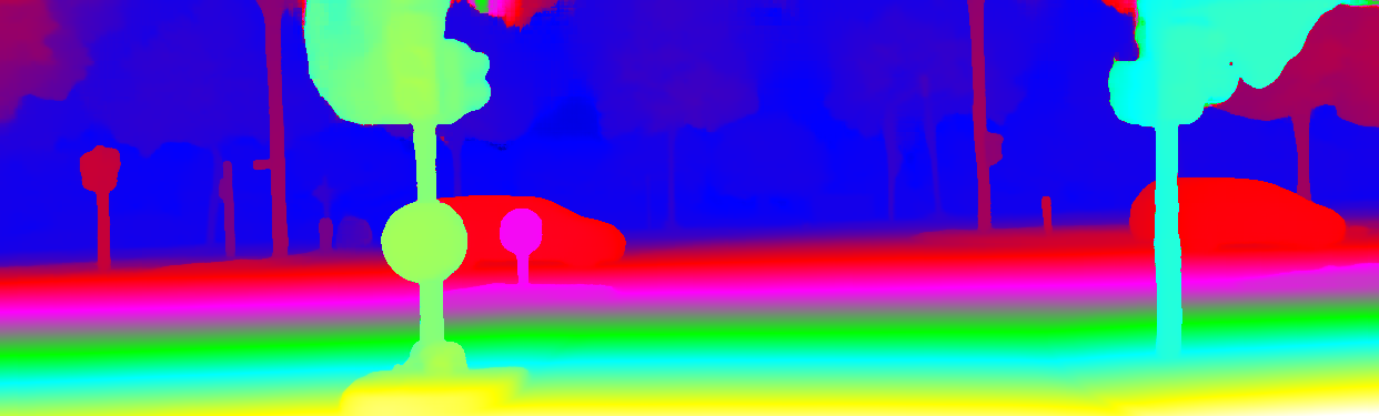 This page provides detailed results for the method(s) selected. For the first 20 test images, the percentage of erroneous pixels is depicted in the table. We use the error metric described in Object Scene Flow for Autonomous Vehicles (CVPR 2015), which considers a pixel to be correctly estimated if the disparity or flow end-point error is <3px or <5% (for scene flow this criterion needs to be fulfilled for both disparity maps and the flow map). Underneath, the left input image, the estimated results and the error maps are shown (for disp_0/disp_1/flow/scene_flow, respectively). The error map uses the log-color scale described in Object Scene Flow for Autonomous Vehicles (CVPR 2015), depicting correct estimates (<3px or <5% error) in blue and wrong estimates in red color tones. Dark regions in the error images denote the occluded pixels which fall outside the image boundaries. The false color maps of the results are scaled to the largest ground truth disparity values / flow magnitudes.