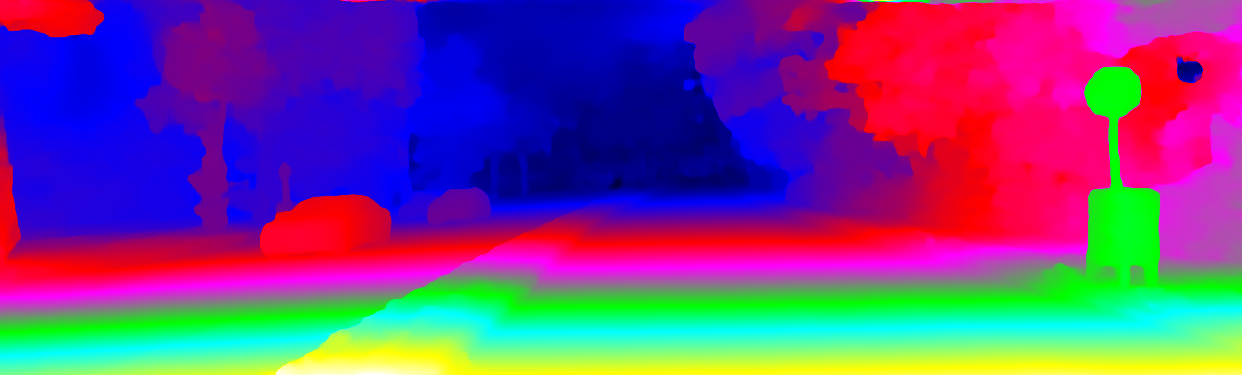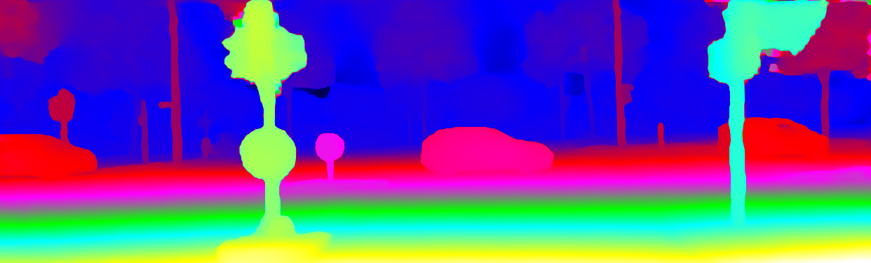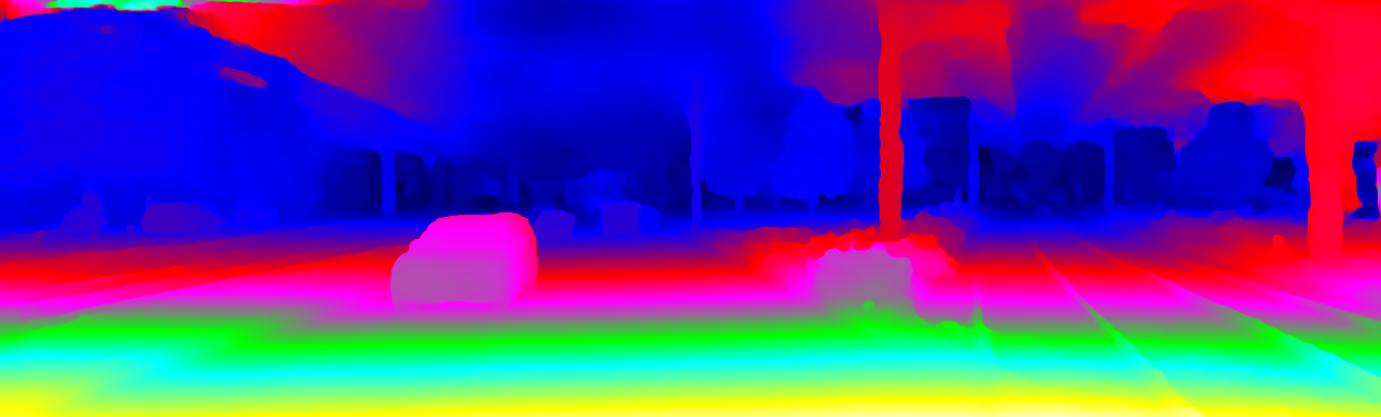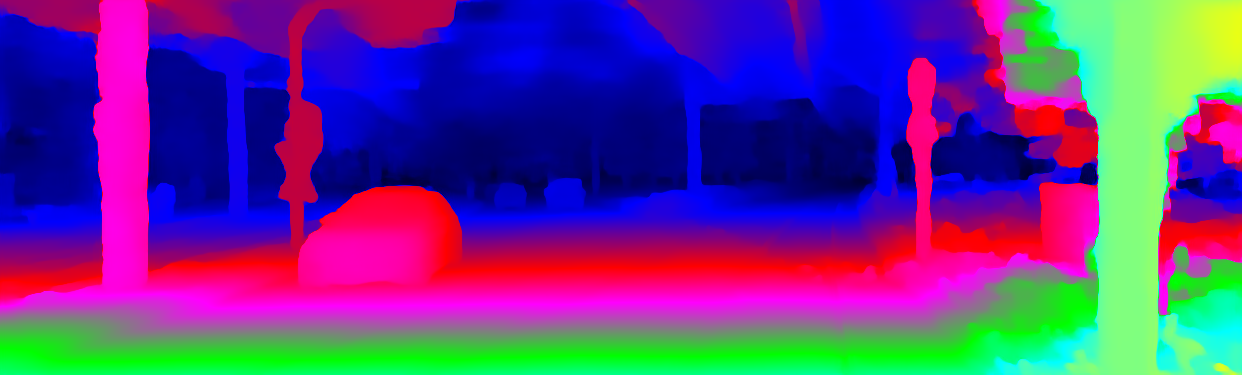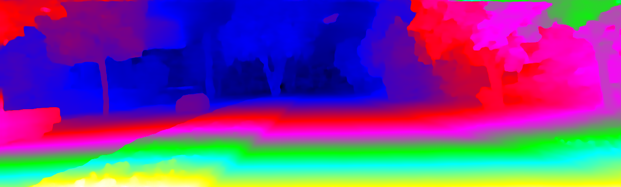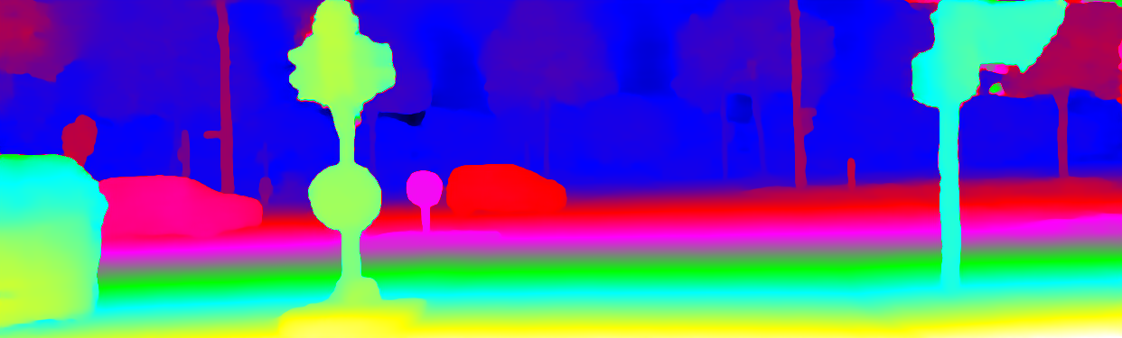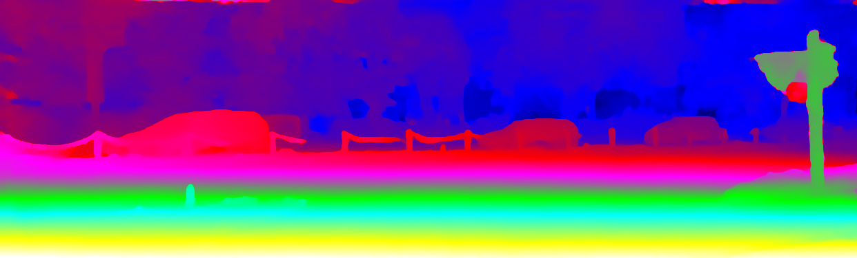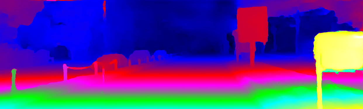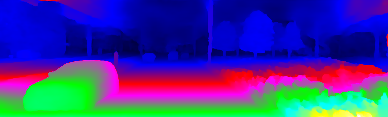 This page provides detailed results for the method(s) selected. For the first 20 test images, the percentage of erroneous pixels is depicted in the table. We use the error metric described in Object Scene Flow for Autonomous Vehicles (CVPR 2015), which considers a pixel to be correctly estimated if the disparity or flow end-point error is <3px or <5% (for scene flow this criterion needs to be fulfilled for both disparity maps and the flow map). Underneath, the left input image, the estimated results and the error maps are shown (for disp_0/disp_1/flow/scene_flow, respectively). The error map uses the log-color scale described in Object Scene Flow for Autonomous Vehicles (CVPR 2015), depicting correct estimates (<3px or <5% error) in blue and wrong estimates in red color tones. Dark regions in the error images denote the occluded pixels which fall outside the image boundaries. The false color maps of the results are scaled to the largest ground truth disparity values / flow magnitudes.