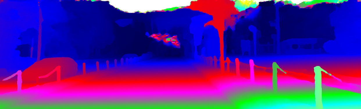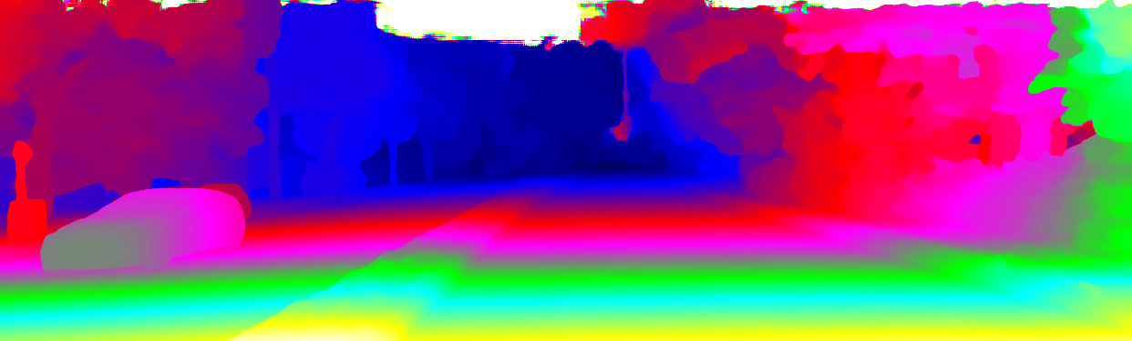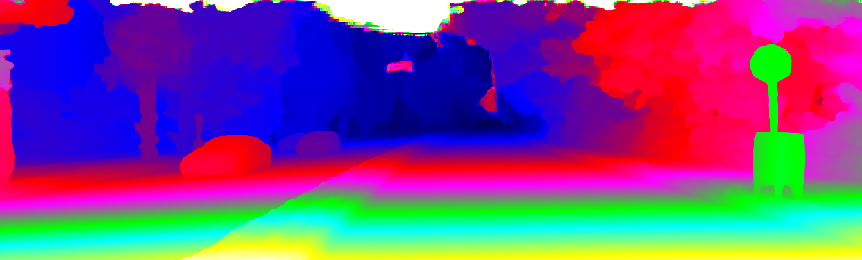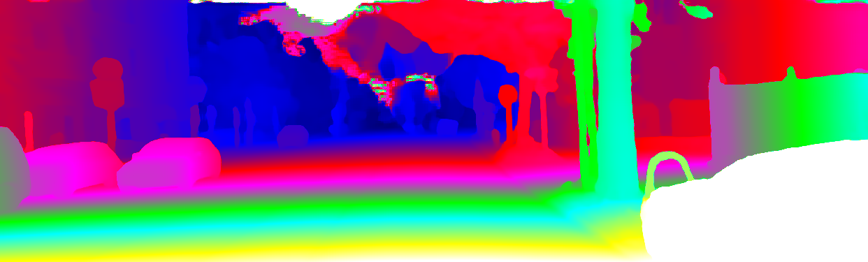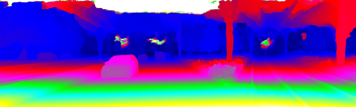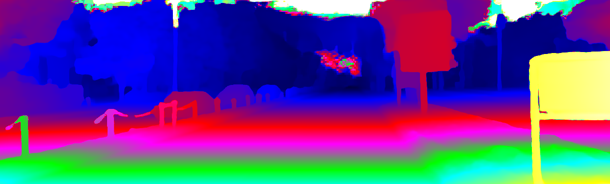 This page provides detailed results for the method(s) selected. For the first 20 test images, the percentage of erroneous pixels is depicted in the table. We use the error metric described in Object Scene Flow for Autonomous Vehicles (CVPR 2015), which considers a pixel to be correctly estimated if the disparity or flow end-point error is <3px or <5% (for scene flow this criterion needs to be fulfilled for both disparity maps and the flow map). Underneath, the left input image, the estimated results and the error maps are shown (for disp_0/disp_1/flow/scene_flow, respectively). The error map uses the log-color scale described in Object Scene Flow for Autonomous Vehicles (CVPR 2015), depicting correct estimates (<3px or <5% error) in blue and wrong estimates in red color tones. Dark regions in the error images denote the occluded pixels which fall outside the image boundaries. The false color maps of the results are scaled to the largest ground truth disparity values / flow magnitudes.