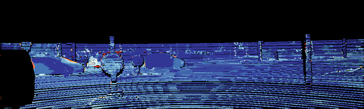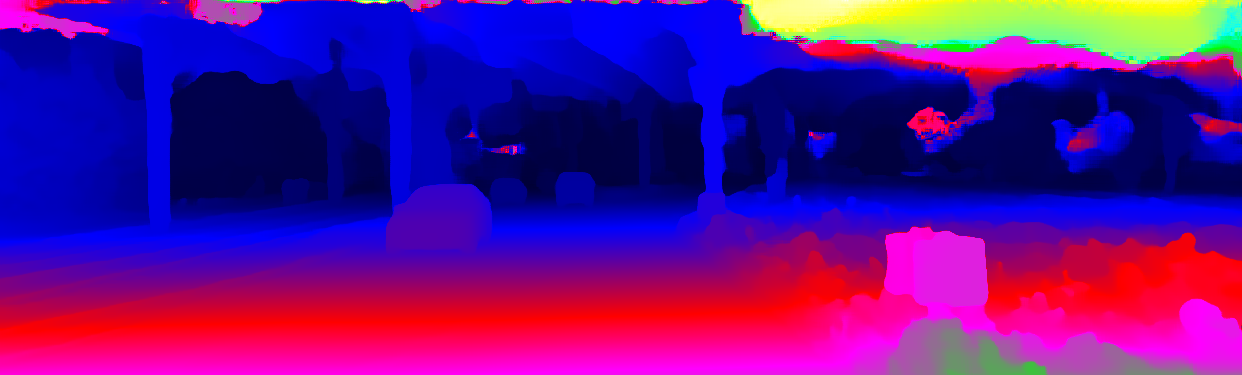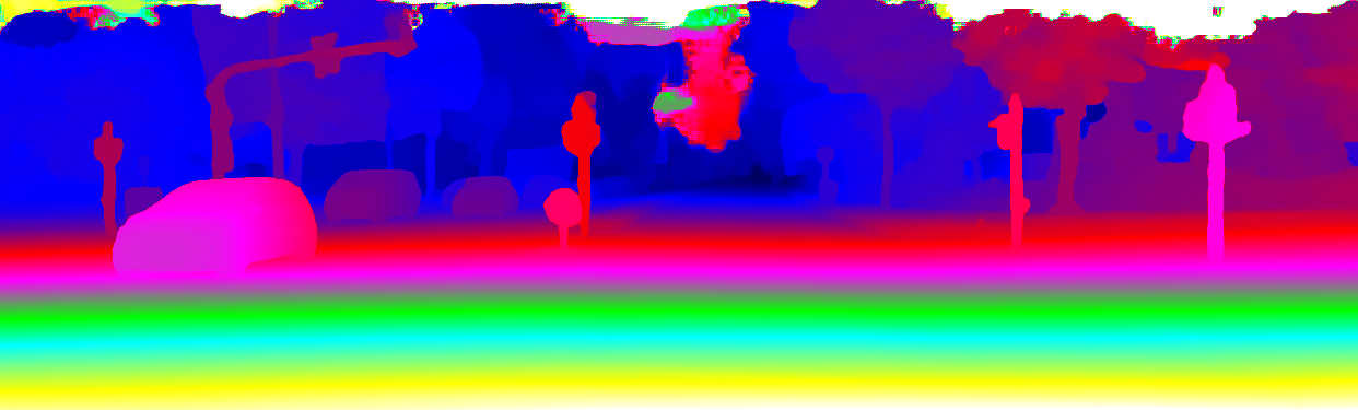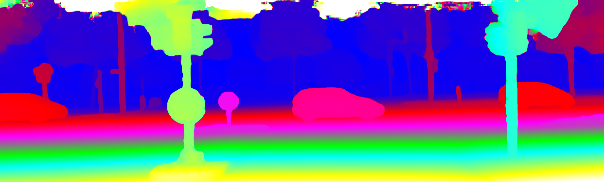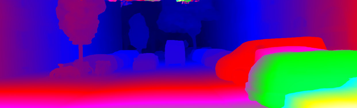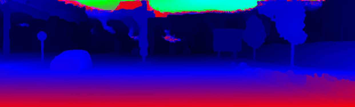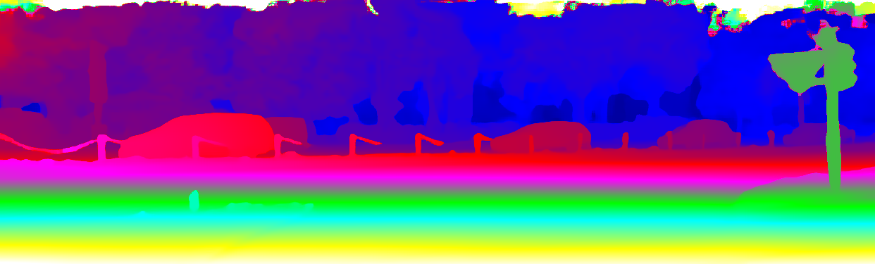 This page provides detailed results for the method(s) selected. For the first 20 test images, the percentage of erroneous pixels is depicted in the table. We use the error metric described in Object Scene Flow for Autonomous Vehicles (CVPR 2015), which considers a pixel to be correctly estimated if the disparity or flow end-point error is <3px or <5% (for scene flow this criterion needs to be fulfilled for both disparity maps and the flow map). Underneath, the left input image, the estimated results and the error maps are shown (for disp_0/disp_1/flow/scene_flow, respectively). The error map uses the log-color scale described in Object Scene Flow for Autonomous Vehicles (CVPR 2015), depicting correct estimates (<3px or <5% error) in blue and wrong estimates in red color tones. Dark regions in the error images denote the occluded pixels which fall outside the image boundaries. The false color maps of the results are scaled to the largest ground truth disparity values / flow magnitudes.