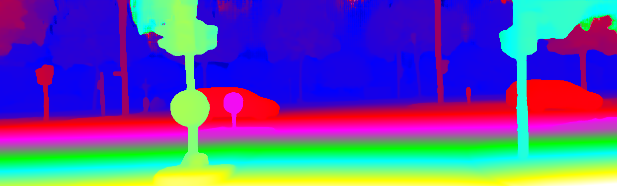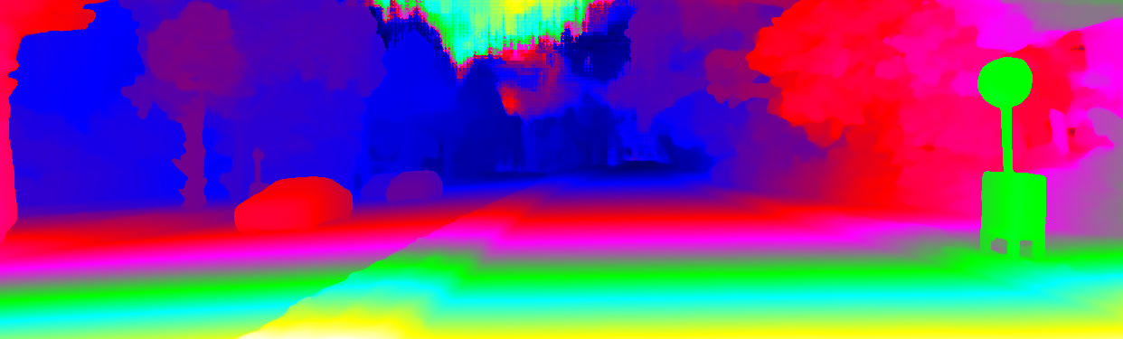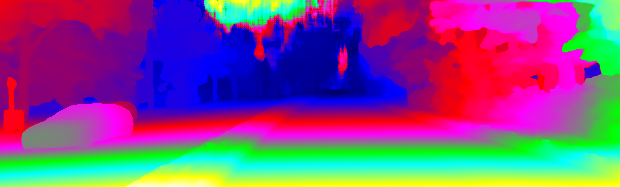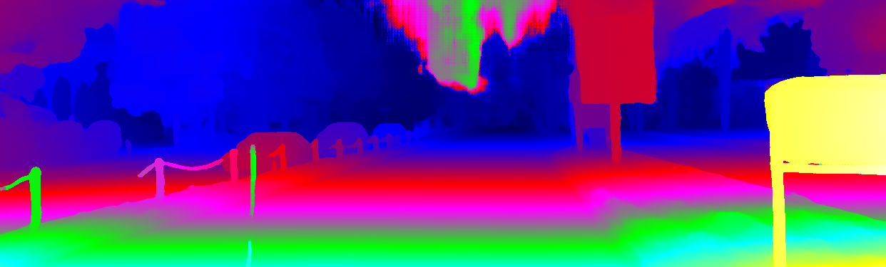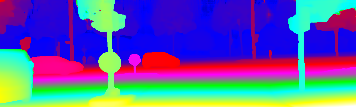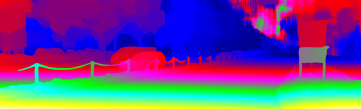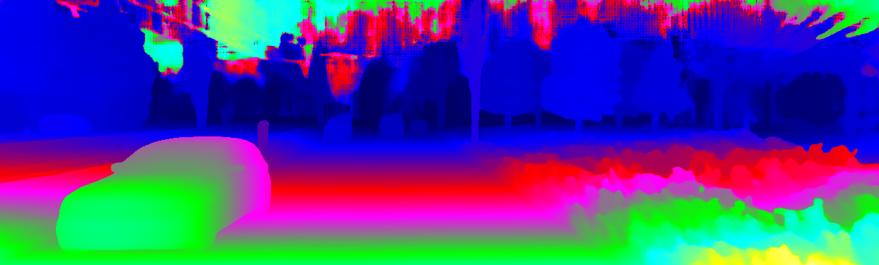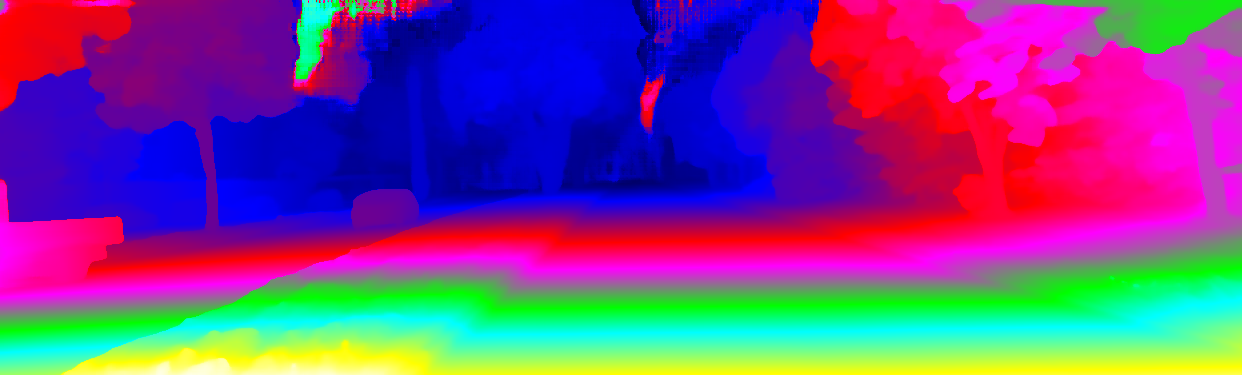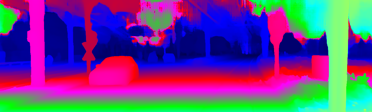 This page provides detailed results for the method(s) selected. For the first 20 test images, the percentage of erroneous pixels is depicted in the table. We use the error metric described in Object Scene Flow for Autonomous Vehicles (CVPR 2015), which considers a pixel to be correctly estimated if the disparity or flow end-point error is <3px or <5% (for scene flow this criterion needs to be fulfilled for both disparity maps and the flow map). Underneath, the left input image, the estimated results and the error maps are shown (for disp_0/disp_1/flow/scene_flow, respectively). The error map uses the log-color scale described in Object Scene Flow for Autonomous Vehicles (CVPR 2015), depicting correct estimates (<3px or <5% error) in blue and wrong estimates in red color tones. Dark regions in the error images denote the occluded pixels which fall outside the image boundaries. The false color maps of the results are scaled to the largest ground truth disparity values / flow magnitudes.