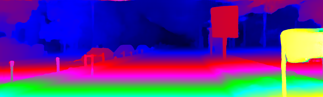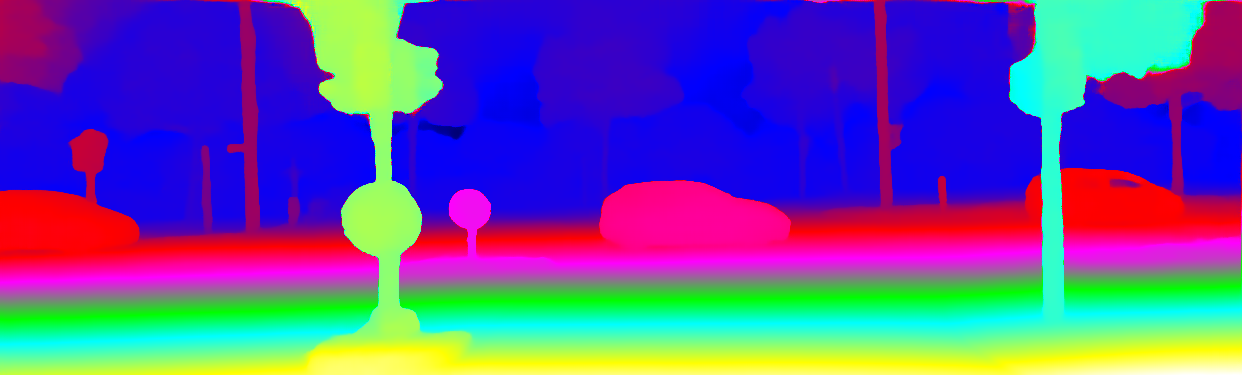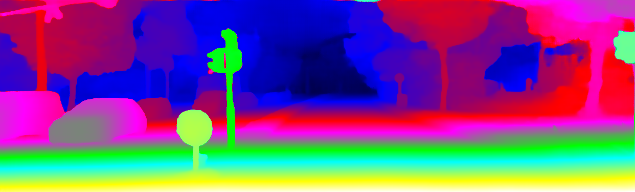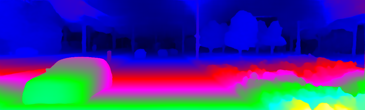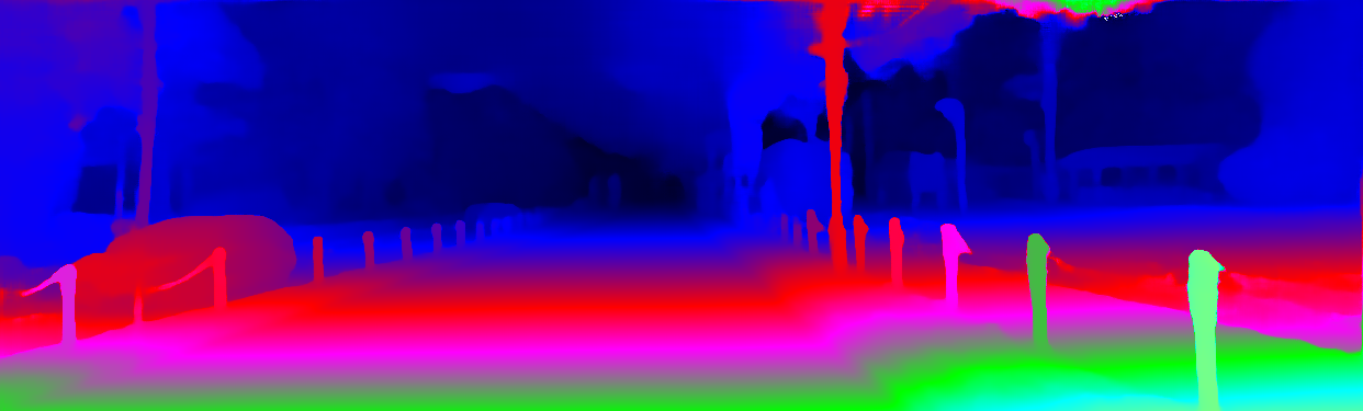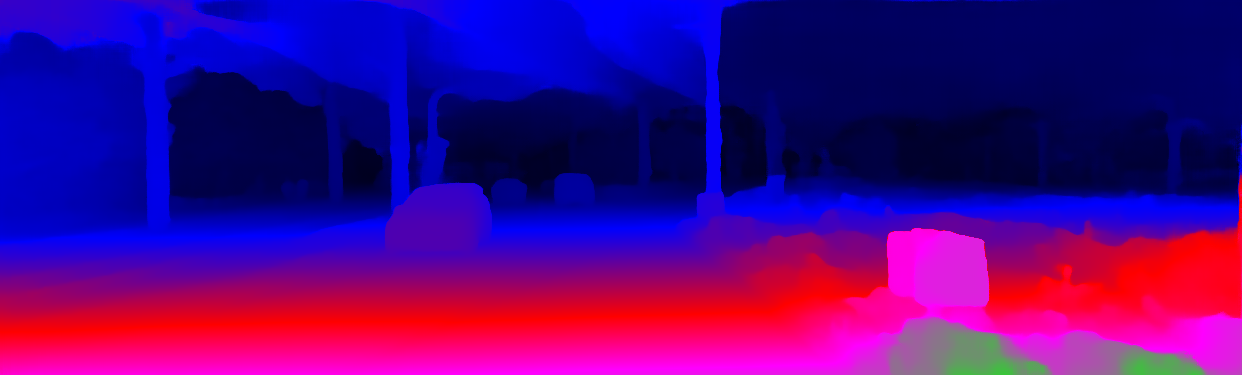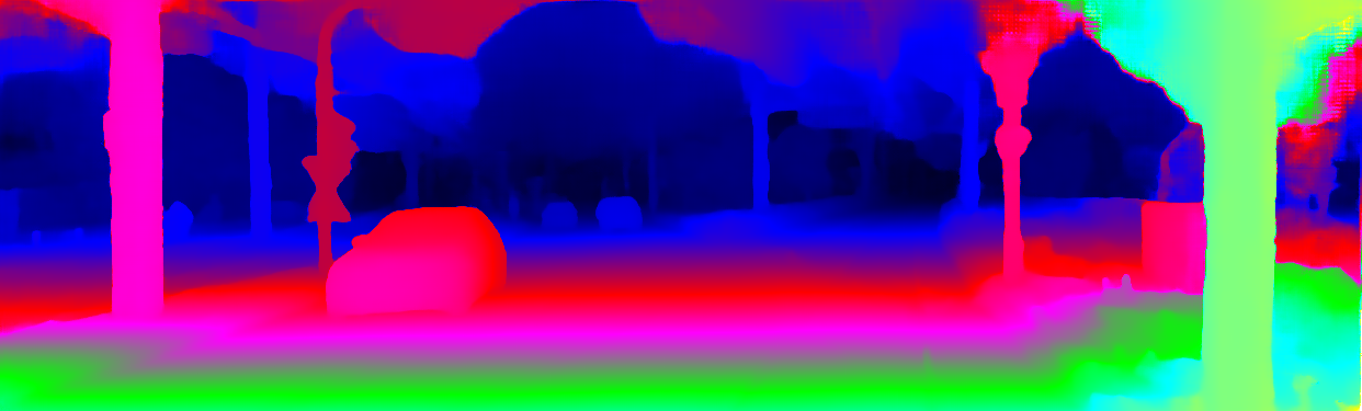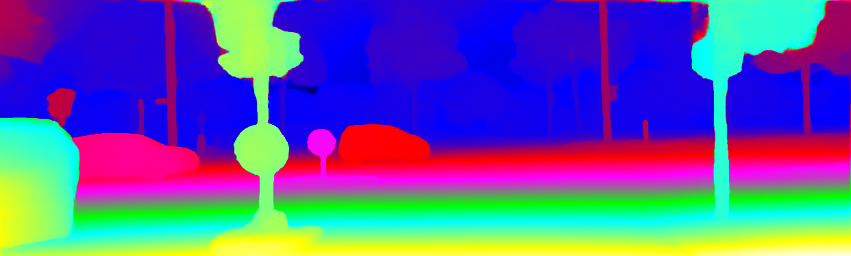 This page provides detailed results for the method(s) selected. For the first 20 test images, the percentage of erroneous pixels is depicted in the table. We use the error metric described in Object Scene Flow for Autonomous Vehicles (CVPR 2015), which considers a pixel to be correctly estimated if the disparity or flow end-point error is <3px or <5% (for scene flow this criterion needs to be fulfilled for both disparity maps and the flow map). Underneath, the left input image, the estimated results and the error maps are shown (for disp_0/disp_1/flow/scene_flow, respectively). The error map uses the log-color scale described in Object Scene Flow for Autonomous Vehicles (CVPR 2015), depicting correct estimates (<3px or <5% error) in blue and wrong estimates in red color tones. Dark regions in the error images denote the occluded pixels which fall outside the image boundaries. The false color maps of the results are scaled to the largest ground truth disparity values / flow magnitudes.