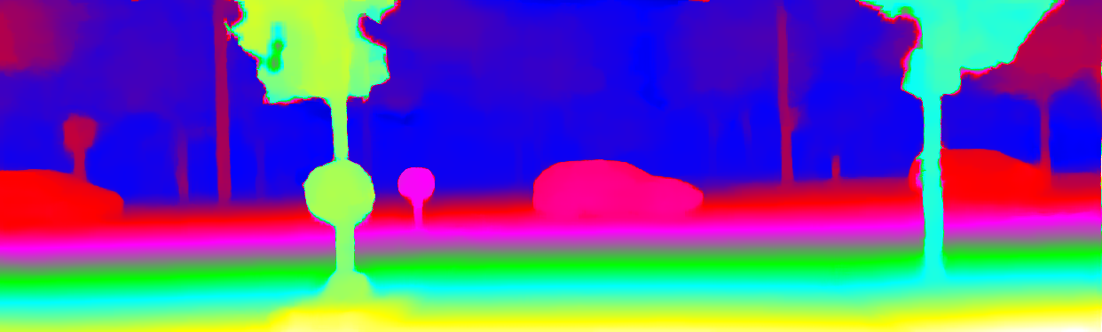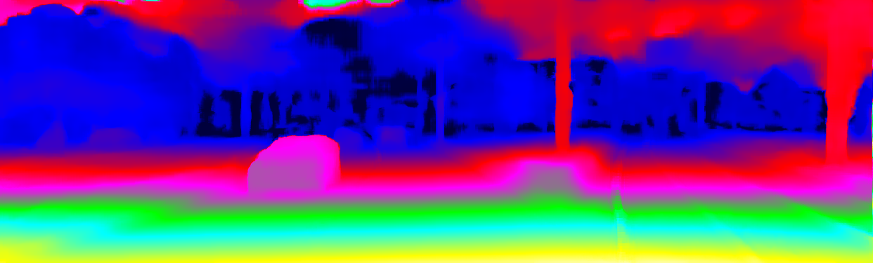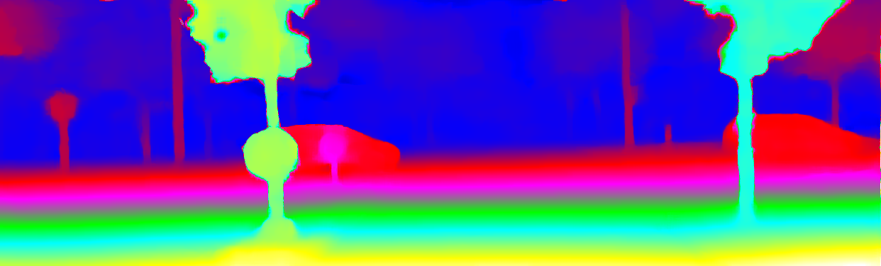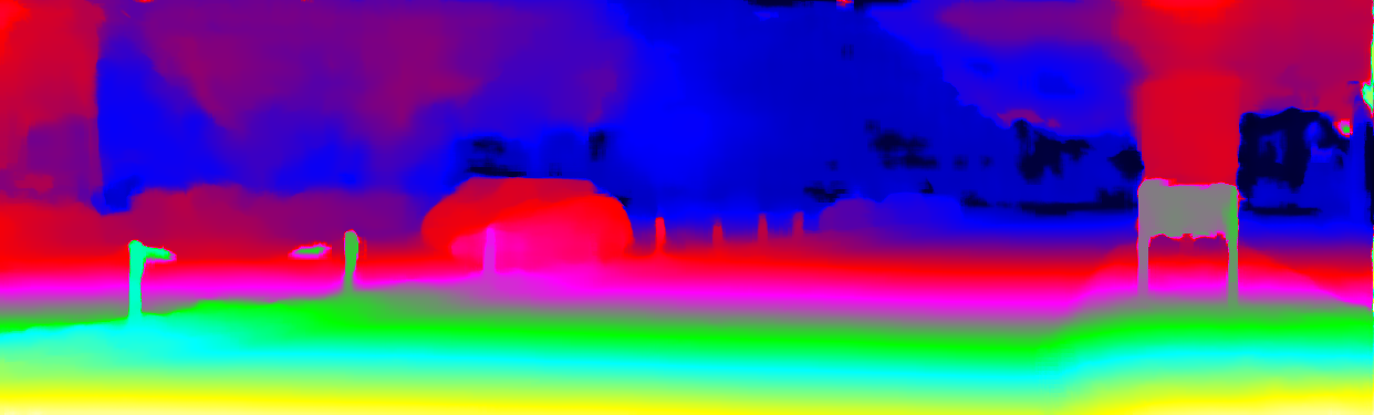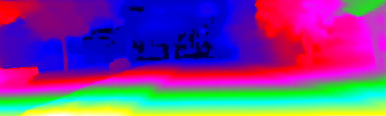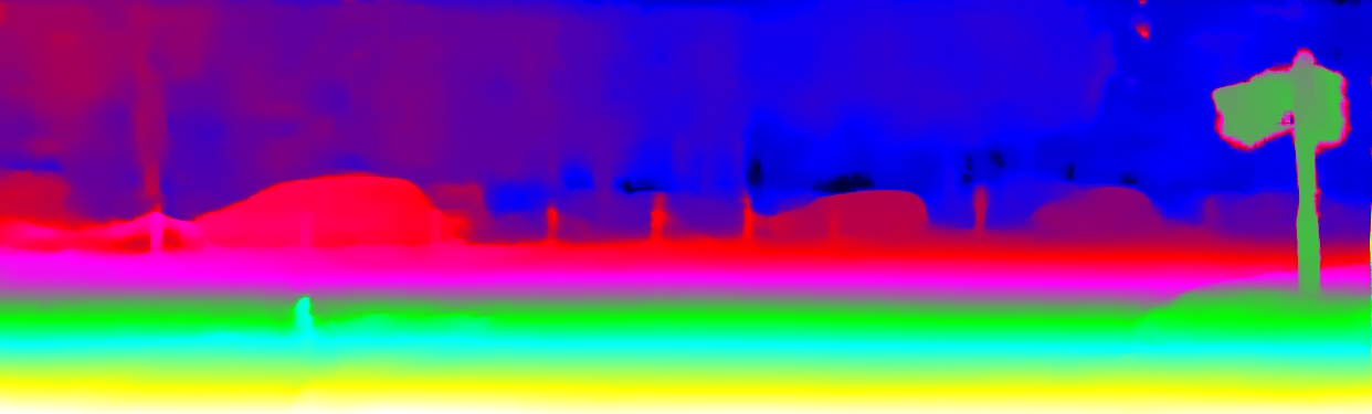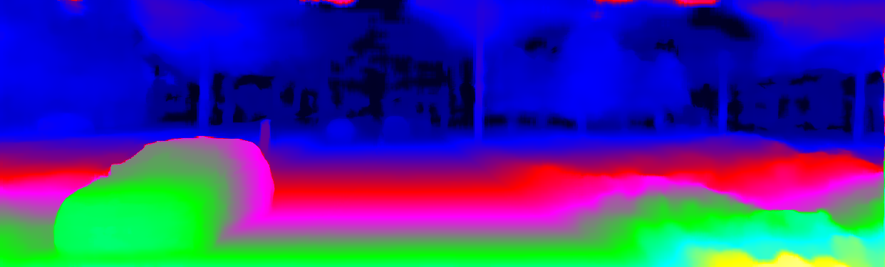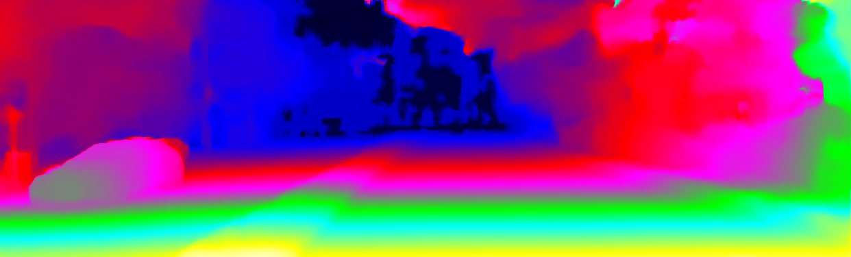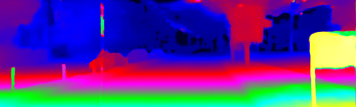 This page provides detailed results for the method(s) selected. For the first 20 test images, the percentage of erroneous pixels is depicted in the table. We use the error metric described in Object Scene Flow for Autonomous Vehicles (CVPR 2015), which considers a pixel to be correctly estimated if the disparity or flow end-point error is <3px or <5% (for scene flow this criterion needs to be fulfilled for both disparity maps and the flow map). Underneath, the left input image, the estimated results and the error maps are shown (for disp_0/disp_1/flow/scene_flow, respectively). The error map uses the log-color scale described in Object Scene Flow for Autonomous Vehicles (CVPR 2015), depicting correct estimates (<3px or <5% error) in blue and wrong estimates in red color tones. Dark regions in the error images denote the occluded pixels which fall outside the image boundaries. The false color maps of the results are scaled to the largest ground truth disparity values / flow magnitudes.