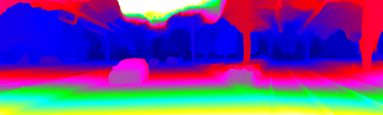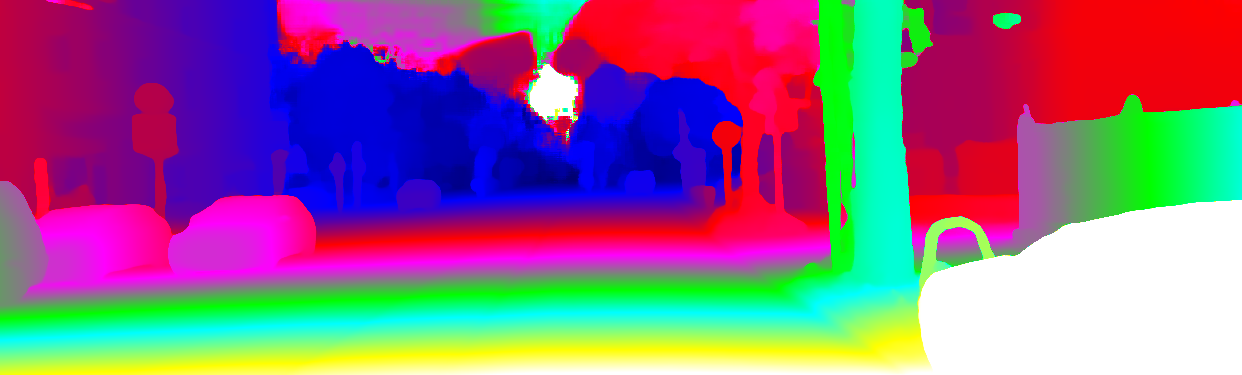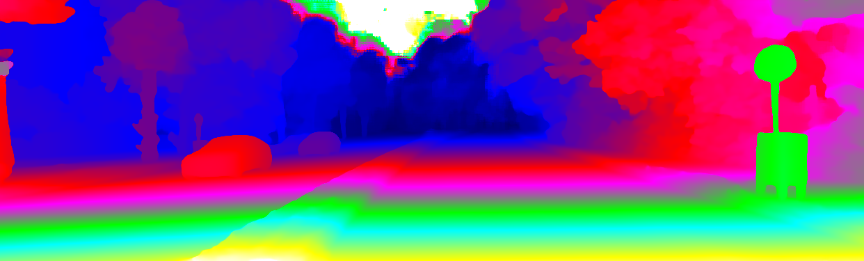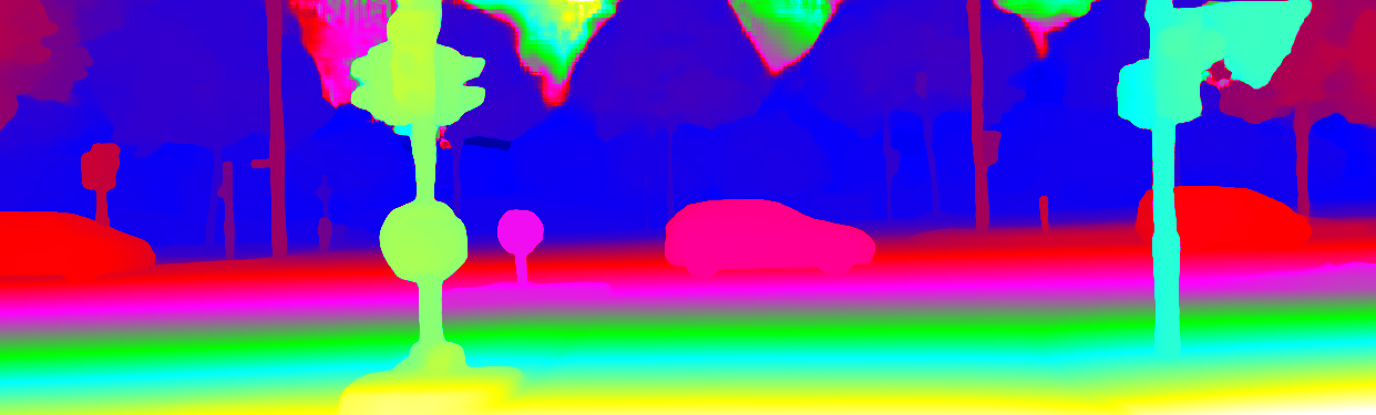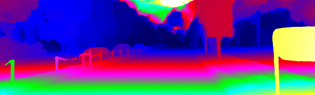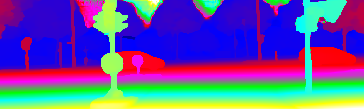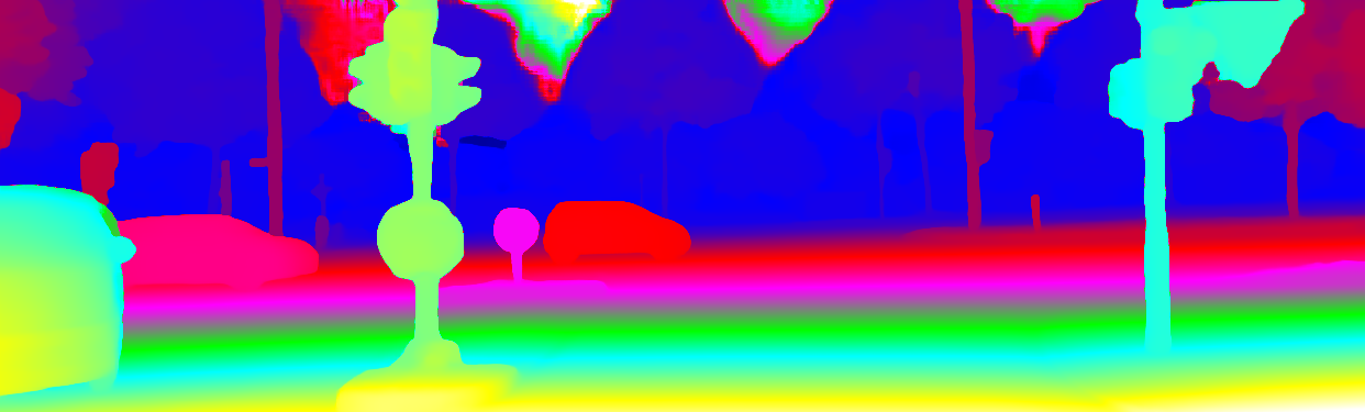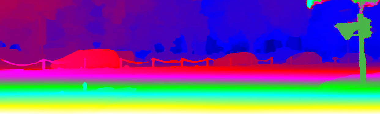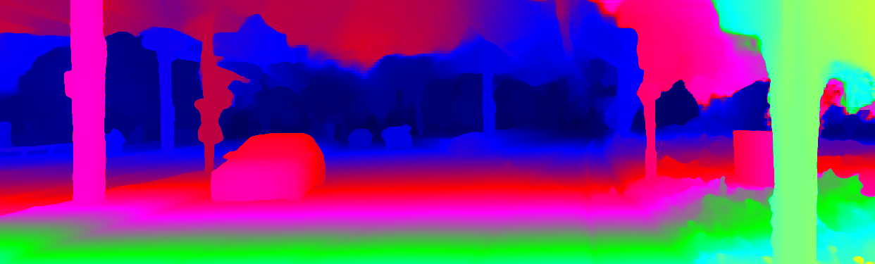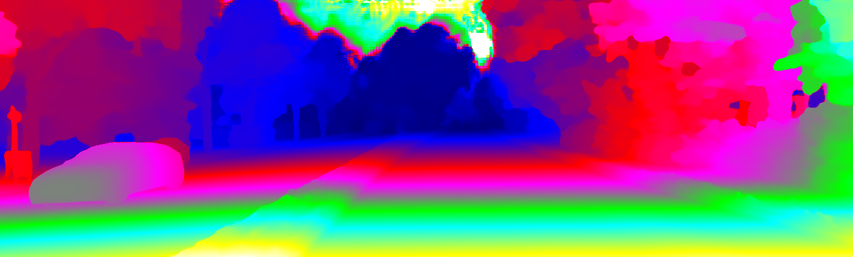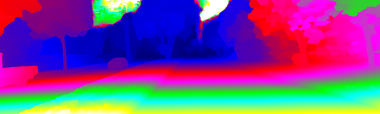This page provides detailed results for the method(s) selected. For the first 20 test images, the percentage of erroneous pixels is depicted in the table. We use the error metric described in Object Scene Flow for Autonomous Vehicles (CVPR 2015), which considers a pixel to be correctly estimated if the disparity or flow end-point error is <3px or <5% (for scene flow this criterion needs to be fulfilled for both disparity maps and the flow map). Underneath, the left input image, the estimated results and the error maps are shown (for disp_0/disp_1/flow/scene_flow, respectively). The error map uses the log-color scale described in Object Scene Flow for Autonomous Vehicles (CVPR 2015), depicting correct estimates (<3px or <5% error) in blue and wrong estimates in red color tones. Dark regions in the error images denote the occluded pixels which fall outside the image boundaries. The false color maps of the results are scaled to the largest ground truth disparity values / flow magnitudes.