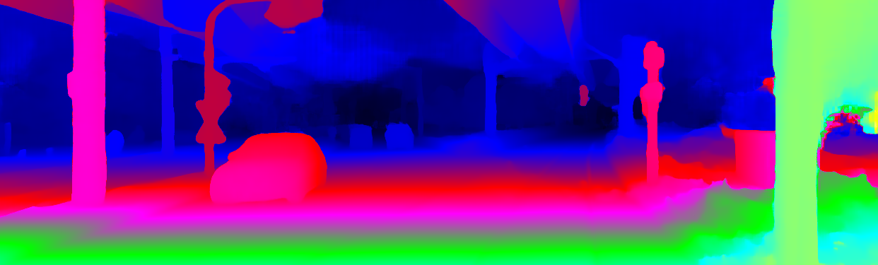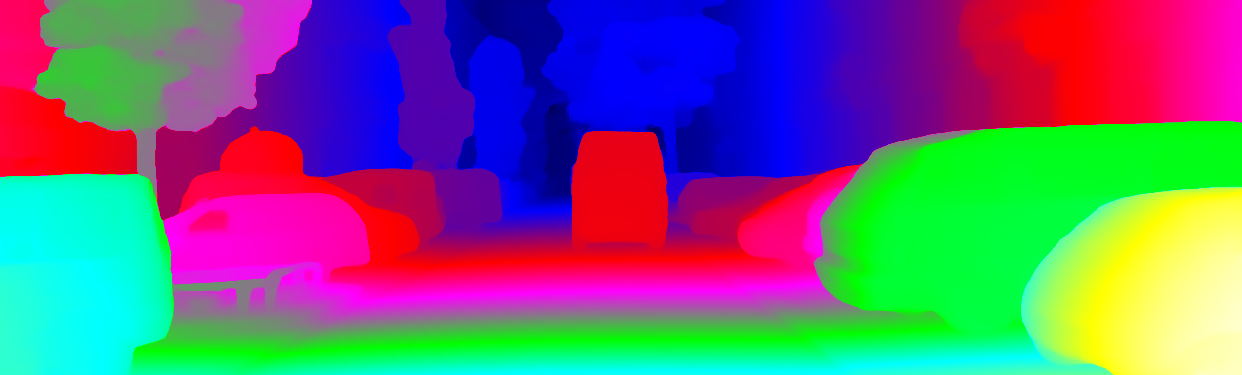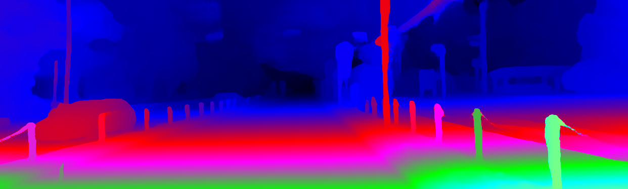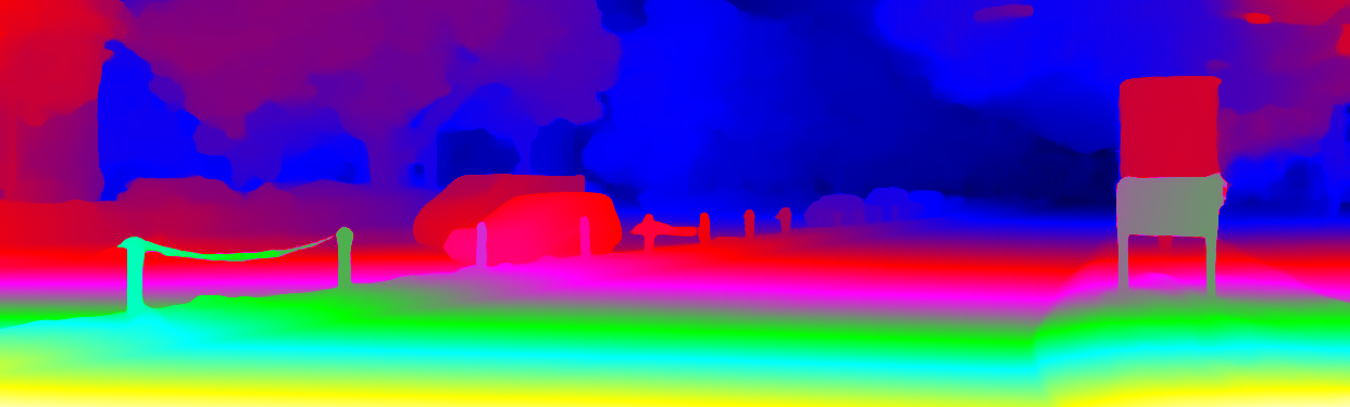 This page provides detailed results for the method(s) selected. For the first 20 test images, the percentage of erroneous pixels is depicted in the table. We use the error metric described in Object Scene Flow for Autonomous Vehicles (CVPR 2015), which considers a pixel to be correctly estimated if the disparity or flow end-point error is <3px or <5% (for scene flow this criterion needs to be fulfilled for both disparity maps and the flow map). Underneath, the left input image, the estimated results and the error maps are shown (for disp_0/disp_1/flow/scene_flow, respectively). The error map uses the log-color scale described in Object Scene Flow for Autonomous Vehicles (CVPR 2015), depicting correct estimates (<3px or <5% error) in blue and wrong estimates in red color tones. Dark regions in the error images denote the occluded pixels which fall outside the image boundaries. The false color maps of the results are scaled to the largest ground truth disparity values / flow magnitudes.