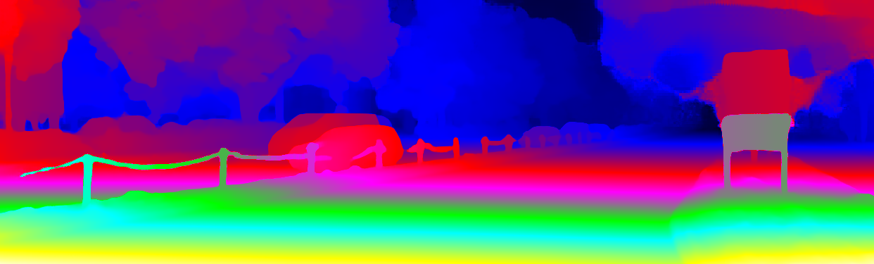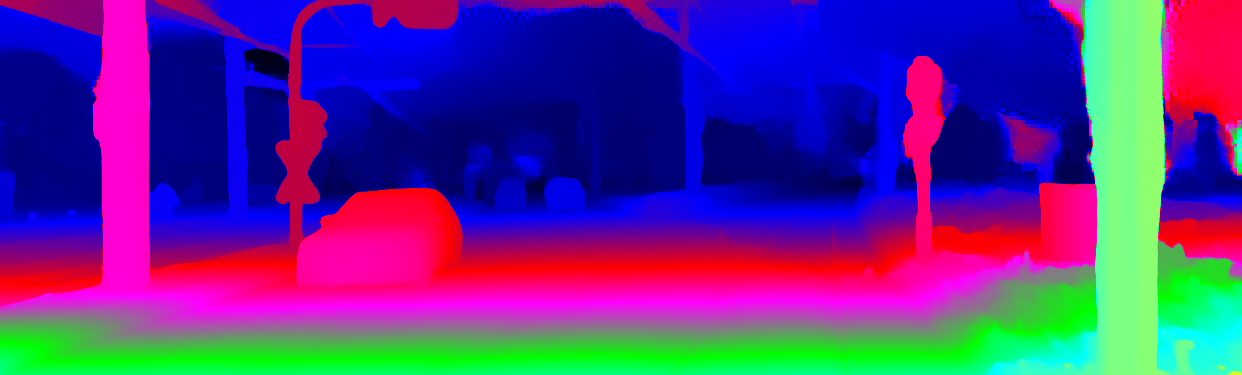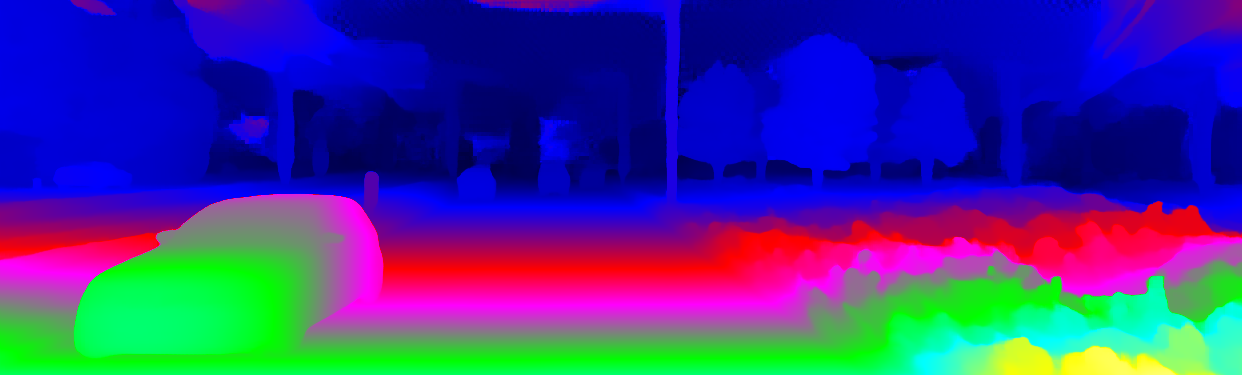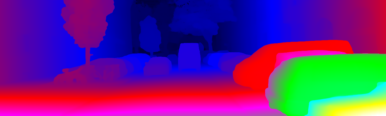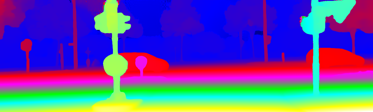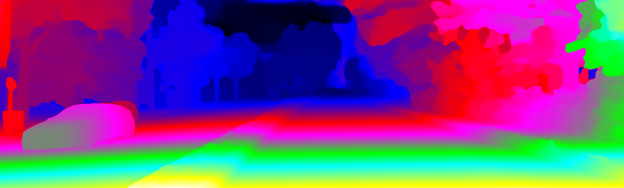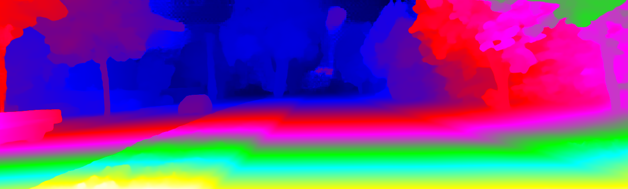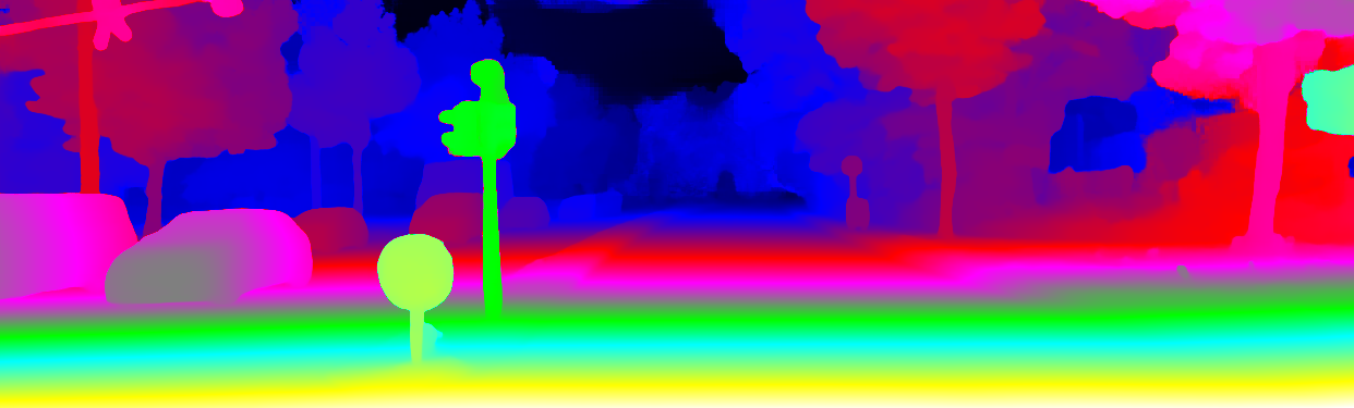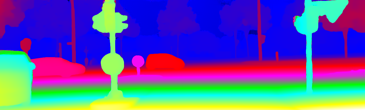 This page provides detailed results for the method(s) selected. For the first 20 test images, the percentage of erroneous pixels is depicted in the table. We use the error metric described in Object Scene Flow for Autonomous Vehicles (CVPR 2015), which considers a pixel to be correctly estimated if the disparity or flow end-point error is <3px or <5% (for scene flow this criterion needs to be fulfilled for both disparity maps and the flow map). Underneath, the left input image, the estimated results and the error maps are shown (for disp_0/disp_1/flow/scene_flow, respectively). The error map uses the log-color scale described in Object Scene Flow for Autonomous Vehicles (CVPR 2015), depicting correct estimates (<3px or <5% error) in blue and wrong estimates in red color tones. Dark regions in the error images denote the occluded pixels which fall outside the image boundaries. The false color maps of the results are scaled to the largest ground truth disparity values / flow magnitudes.