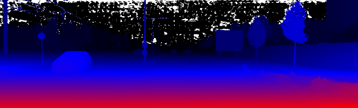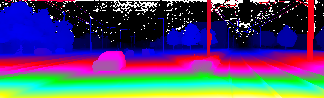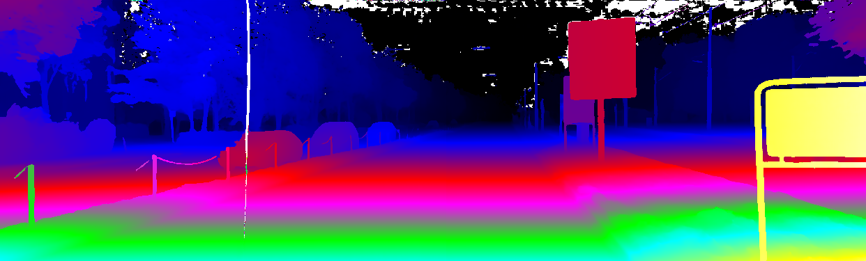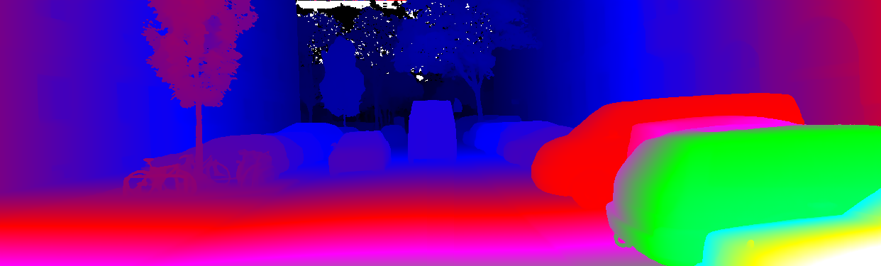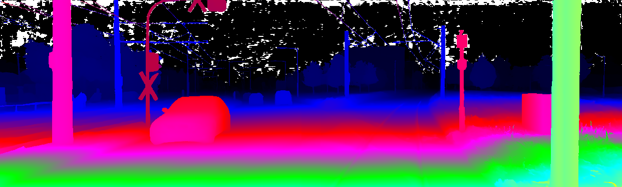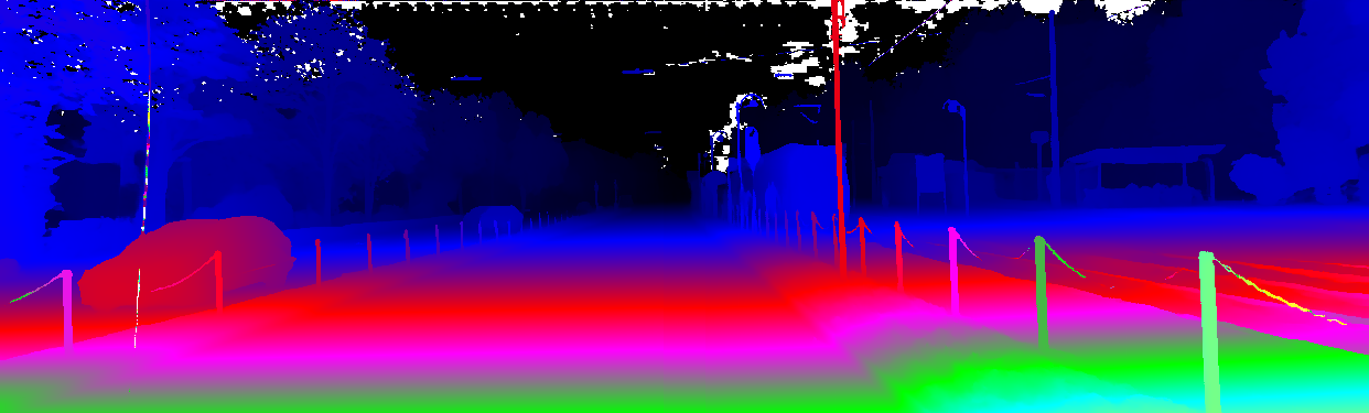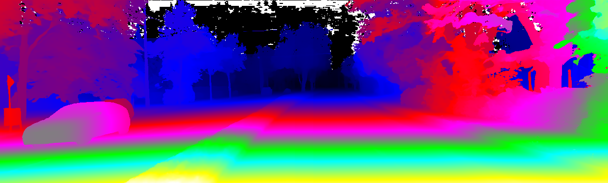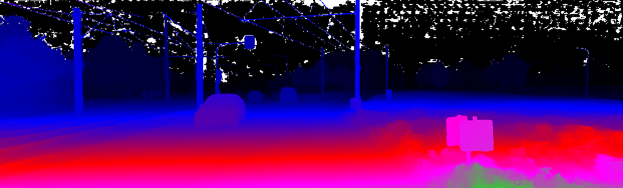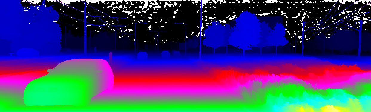 This page provides detailed results for the method(s) selected. For the first 20 test images, the percentage of erroneous pixels is depicted in the table. We use the error metric described in Object Scene Flow for Autonomous Vehicles (CVPR 2015), which considers a pixel to be correctly estimated if the disparity or flow end-point error is <3px or <5% (for scene flow this criterion needs to be fulfilled for both disparity maps and the flow map). Underneath, the left input image, the estimated results and the error maps are shown (for disp_0/disp_1/flow/scene_flow, respectively). The error map uses the log-color scale described in Object Scene Flow for Autonomous Vehicles (CVPR 2015), depicting correct estimates (<3px or <5% error) in blue and wrong estimates in red color tones. Dark regions in the error images denote the occluded pixels which fall outside the image boundaries. The false color maps of the results are scaled to the largest ground truth disparity values / flow magnitudes.
