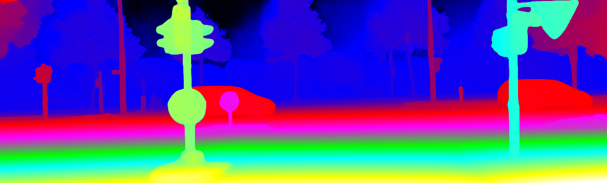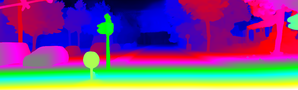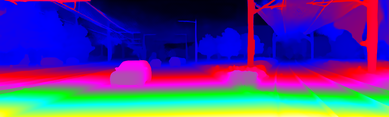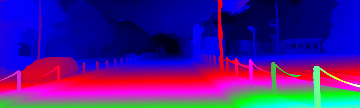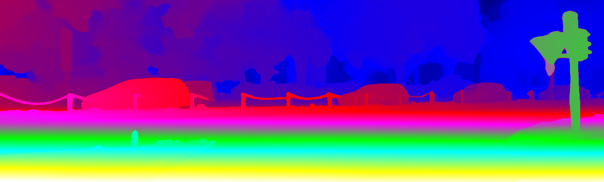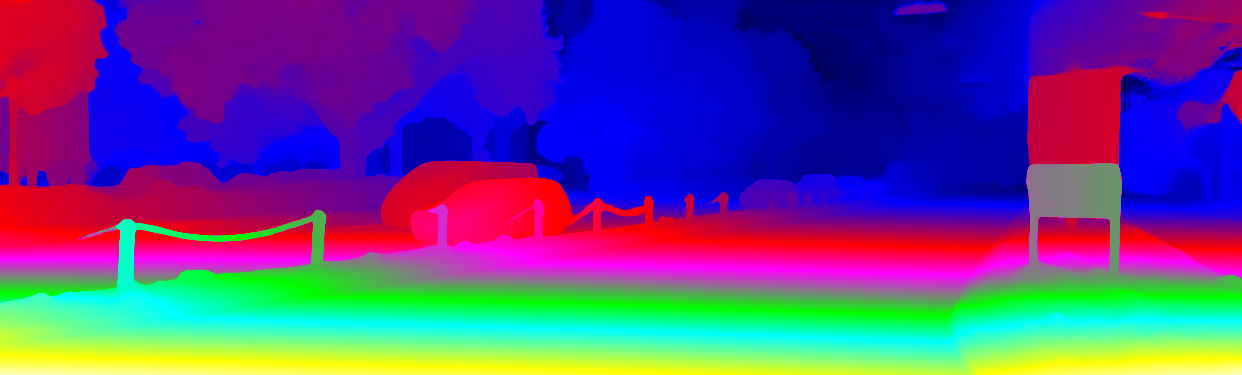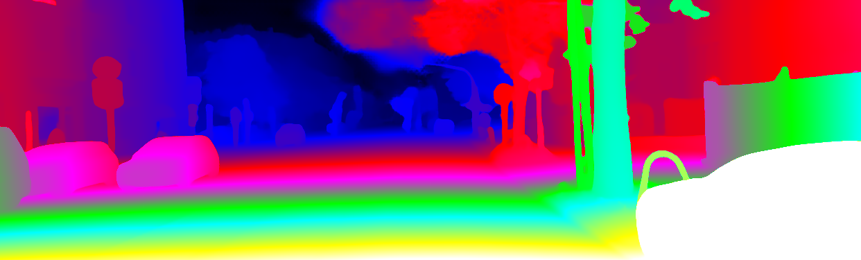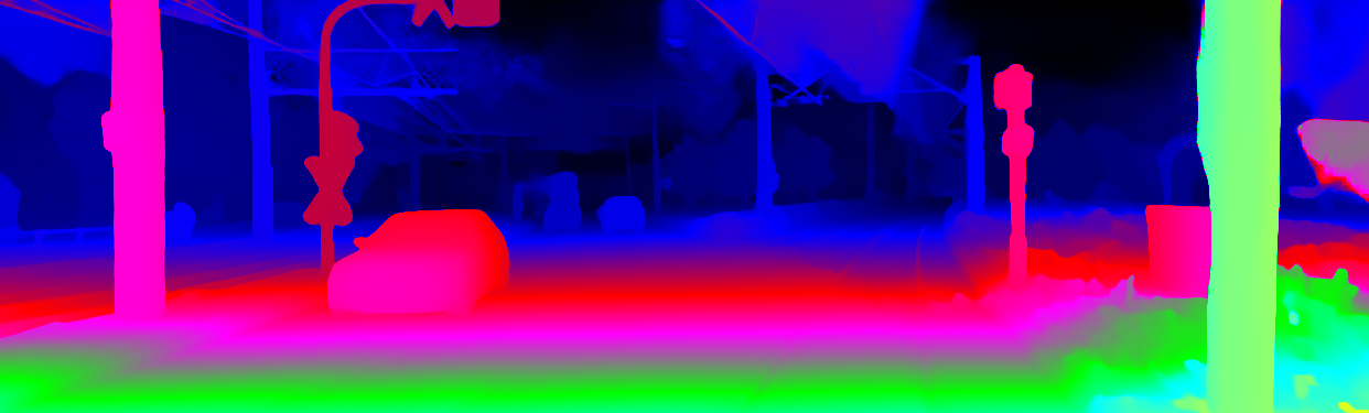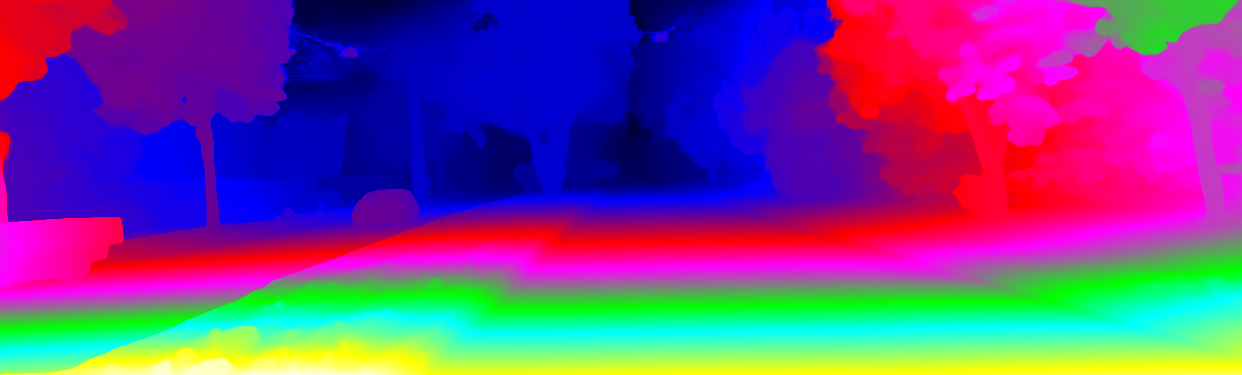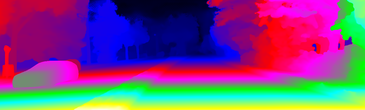 This page provides detailed results for the method(s) selected. For the first 20 test images, the percentage of erroneous pixels is depicted in the table. We use the error metric described in Object Scene Flow for Autonomous Vehicles (CVPR 2015), which considers a pixel to be correctly estimated if the disparity or flow end-point error is <3px or <5% (for scene flow this criterion needs to be fulfilled for both disparity maps and the flow map). Underneath, the left input image, the estimated results and the error maps are shown (for disp_0/disp_1/flow/scene_flow, respectively). The error map uses the log-color scale described in Object Scene Flow for Autonomous Vehicles (CVPR 2015), depicting correct estimates (<3px or <5% error) in blue and wrong estimates in red color tones. Dark regions in the error images denote the occluded pixels which fall outside the image boundaries. The false color maps of the results are scaled to the largest ground truth disparity values / flow magnitudes.