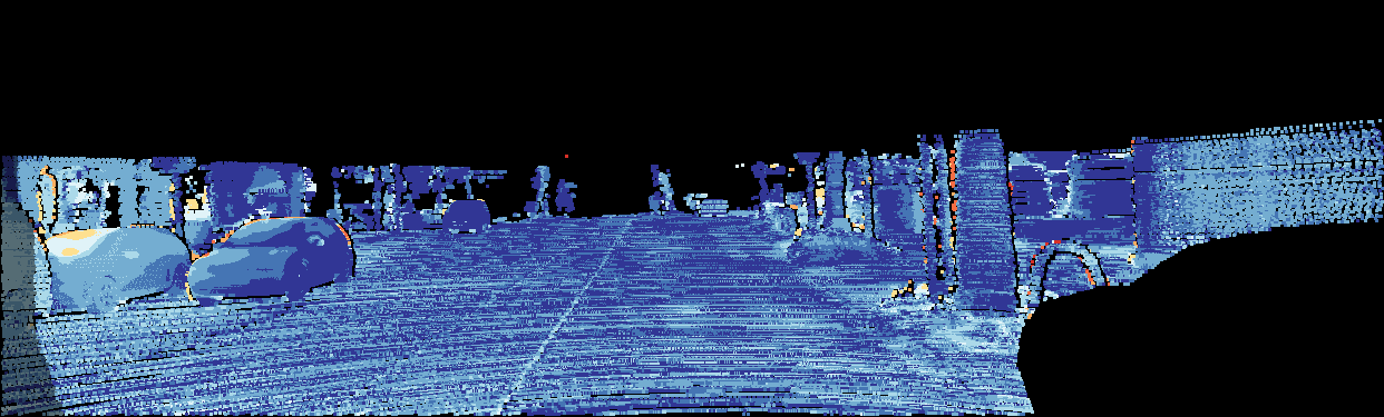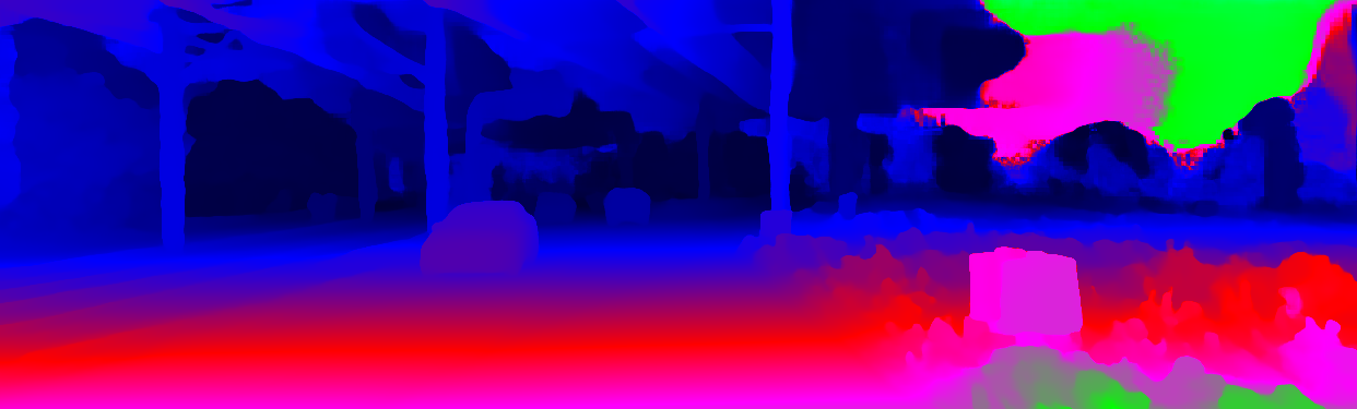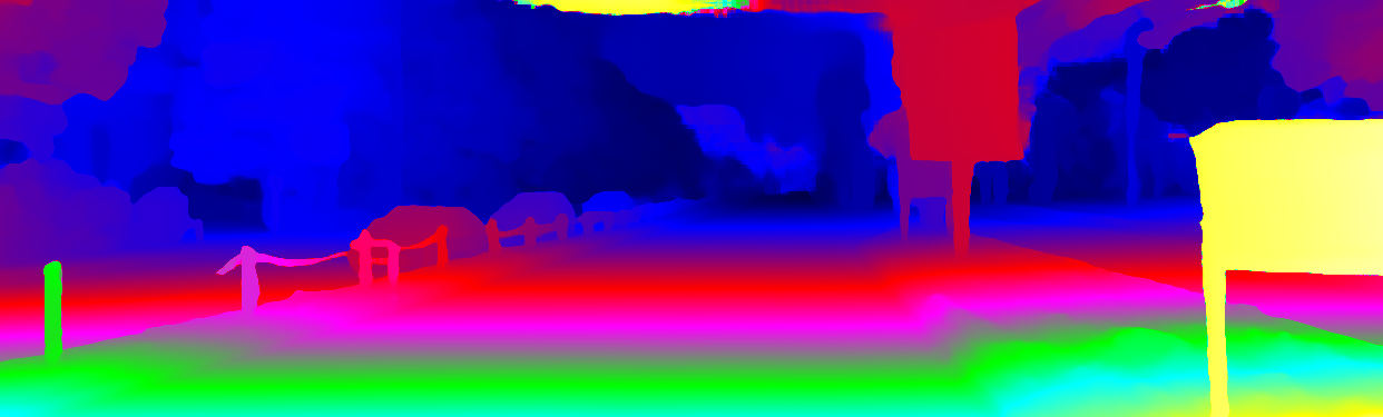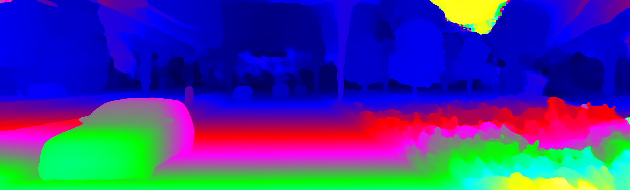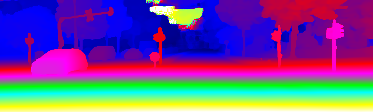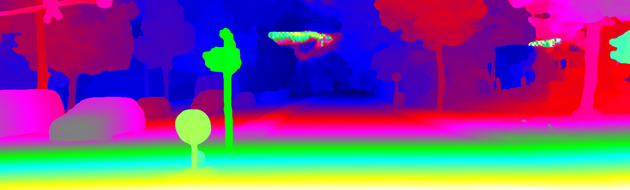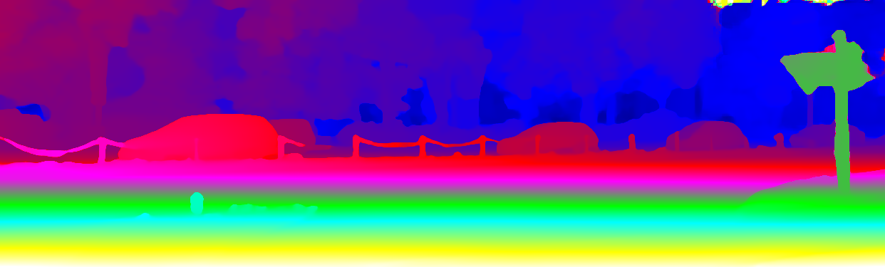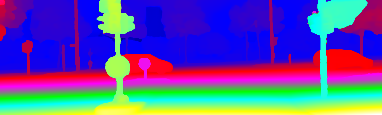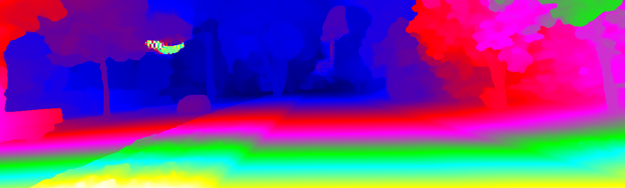 This page provides detailed results for the method(s) selected. For the first 20 test images, the percentage of erroneous pixels is depicted in the table. We use the error metric described in Object Scene Flow for Autonomous Vehicles (CVPR 2015), which considers a pixel to be correctly estimated if the disparity or flow end-point error is <3px or <5% (for scene flow this criterion needs to be fulfilled for both disparity maps and the flow map). Underneath, the left input image, the estimated results and the error maps are shown (for disp_0/disp_1/flow/scene_flow, respectively). The error map uses the log-color scale described in Object Scene Flow for Autonomous Vehicles (CVPR 2015), depicting correct estimates (<3px or <5% error) in blue and wrong estimates in red color tones. Dark regions in the error images denote the occluded pixels which fall outside the image boundaries. The false color maps of the results are scaled to the largest ground truth disparity values / flow magnitudes.
