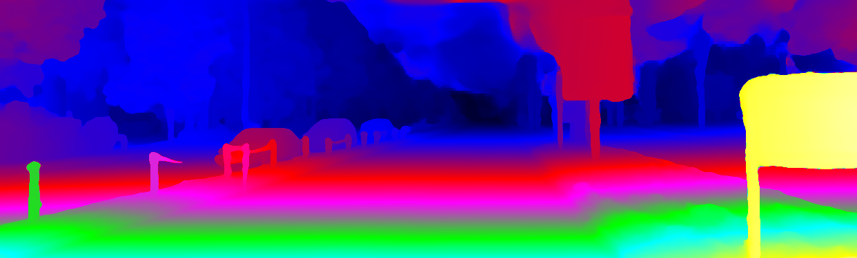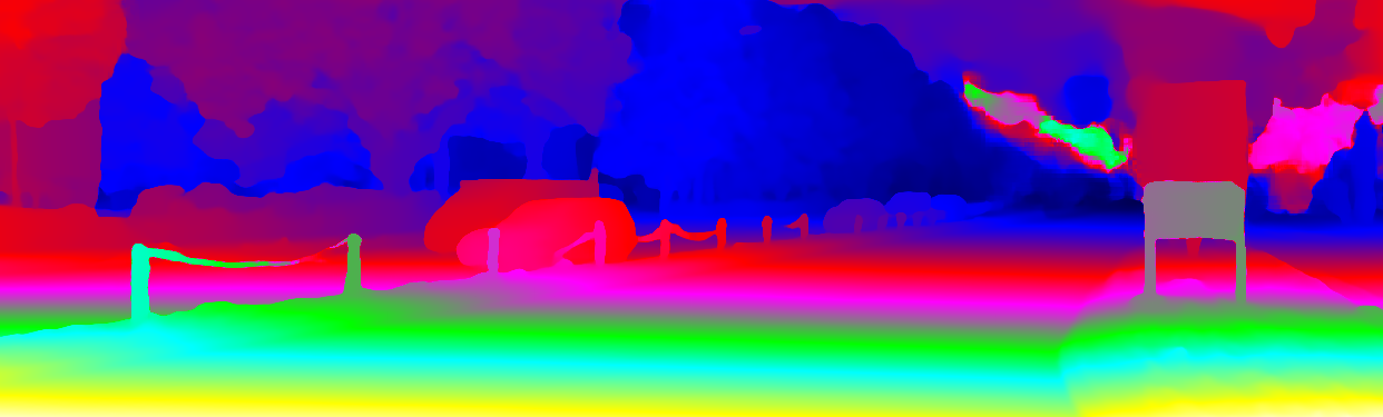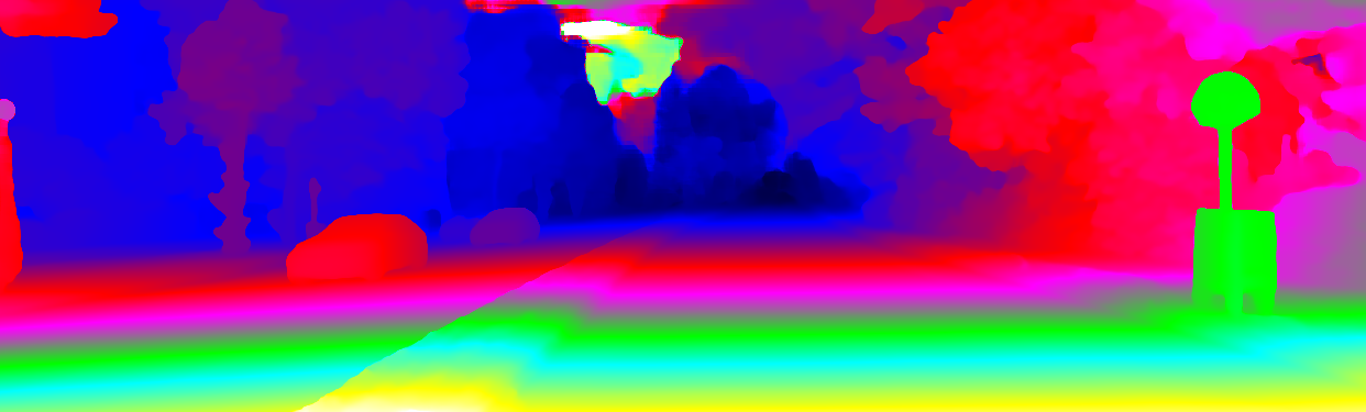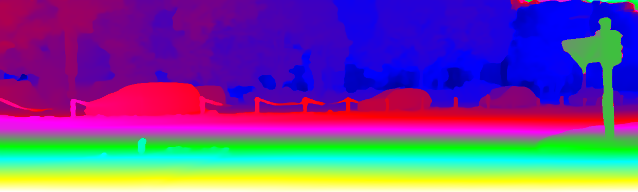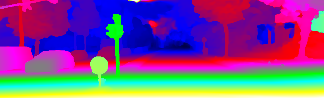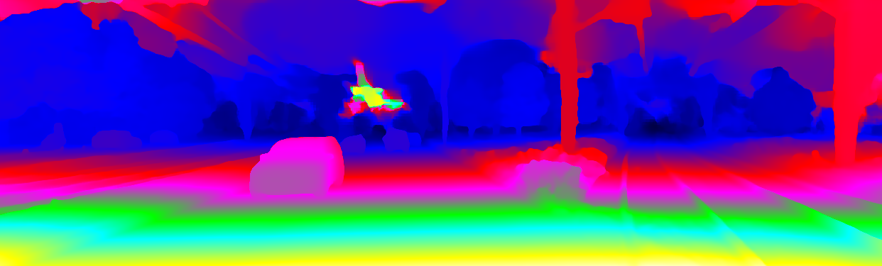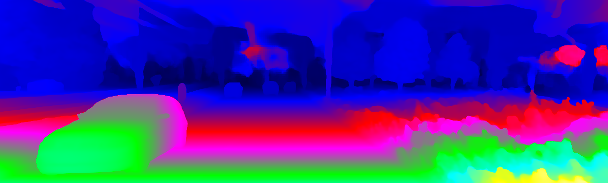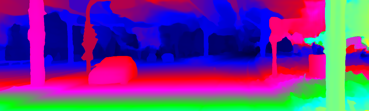 This page provides detailed results for the method(s) selected. For the first 20 test images, the percentage of erroneous pixels is depicted in the table. We use the error metric described in Object Scene Flow for Autonomous Vehicles (CVPR 2015), which considers a pixel to be correctly estimated if the disparity or flow end-point error is <3px or <5% (for scene flow this criterion needs to be fulfilled for both disparity maps and the flow map). Underneath, the left input image, the estimated results and the error maps are shown (for disp_0/disp_1/flow/scene_flow, respectively). The error map uses the log-color scale described in Object Scene Flow for Autonomous Vehicles (CVPR 2015), depicting correct estimates (<3px or <5% error) in blue and wrong estimates in red color tones. Dark regions in the error images denote the occluded pixels which fall outside the image boundaries. The false color maps of the results are scaled to the largest ground truth disparity values / flow magnitudes.