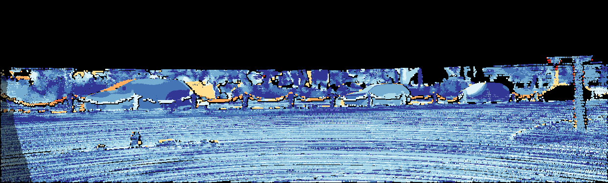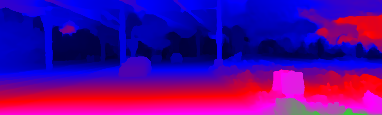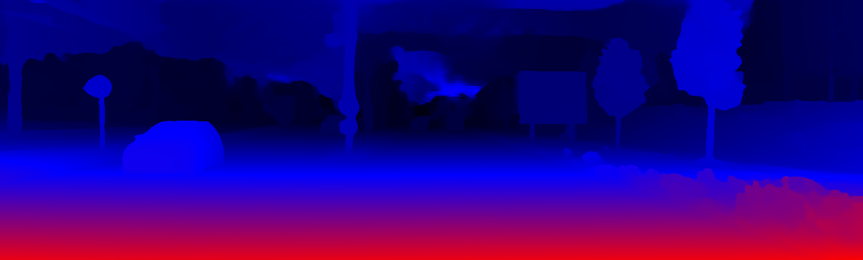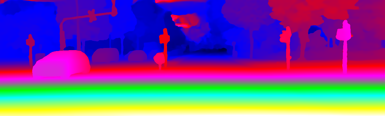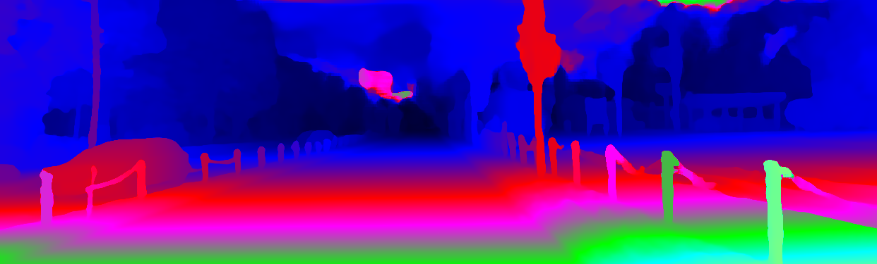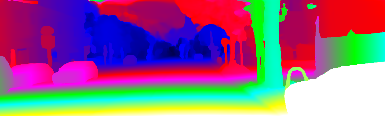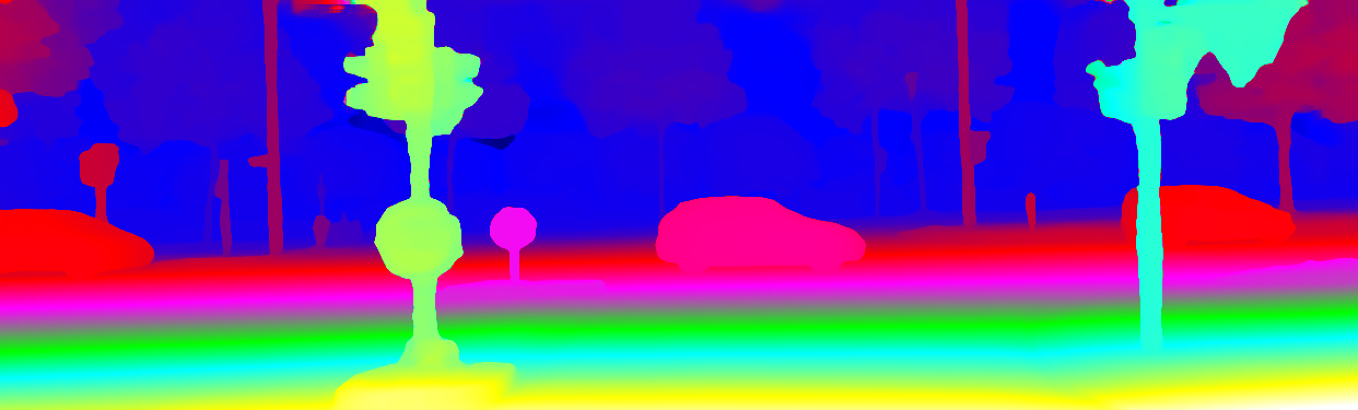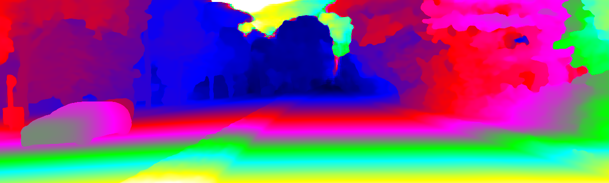 This page provides detailed results for the method(s) selected. For the first 20 test images, the percentage of erroneous pixels is depicted in the table. We use the error metric described in Object Scene Flow for Autonomous Vehicles (CVPR 2015), which considers a pixel to be correctly estimated if the disparity or flow end-point error is <3px or <5% (for scene flow this criterion needs to be fulfilled for both disparity maps and the flow map). Underneath, the left input image, the estimated results and the error maps are shown (for disp_0/disp_1/flow/scene_flow, respectively). The error map uses the log-color scale described in Object Scene Flow for Autonomous Vehicles (CVPR 2015), depicting correct estimates (<3px or <5% error) in blue and wrong estimates in red color tones. Dark regions in the error images denote the occluded pixels which fall outside the image boundaries. The false color maps of the results are scaled to the largest ground truth disparity values / flow magnitudes.