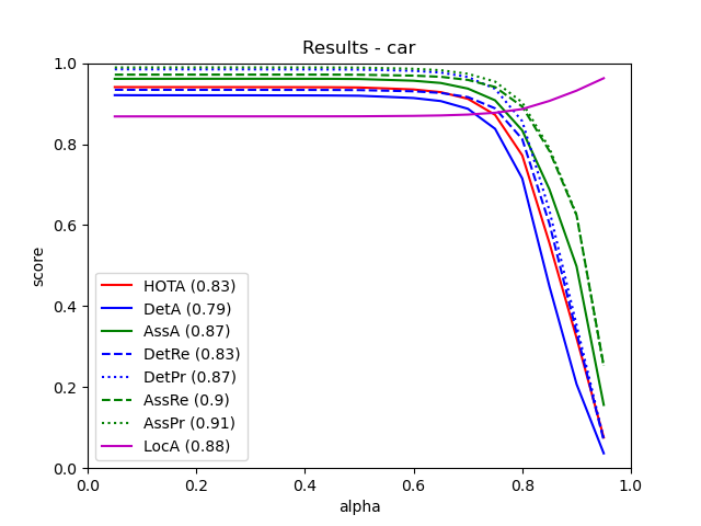From all 29 test sequences, our benchmark computes the HOTA tracking metrics (HOTA, DetA, AssA, DetRe, DetPr, AssRe, AssPr, LocA) [1] as well as the CLEARMOT, MT/PT/ML, identity switches, and fragmentation [2,3] metrics.
