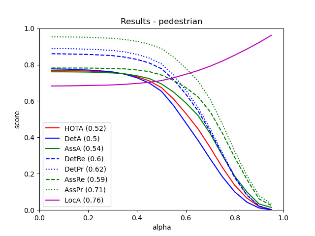 From all 29 test sequences, our benchmark computes the HOTA tracking metrics (HOTA, DetA, AssA, DetRe, DetPr, AssRe, AssPr, LocA) [1] as well as the CLEARMOT, MT/PT/ML, identity switches, and fragmentation [2,3] metrics.