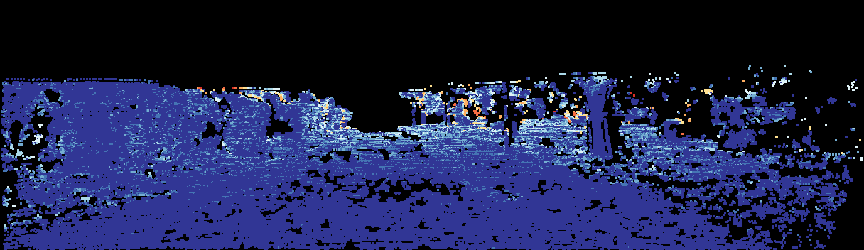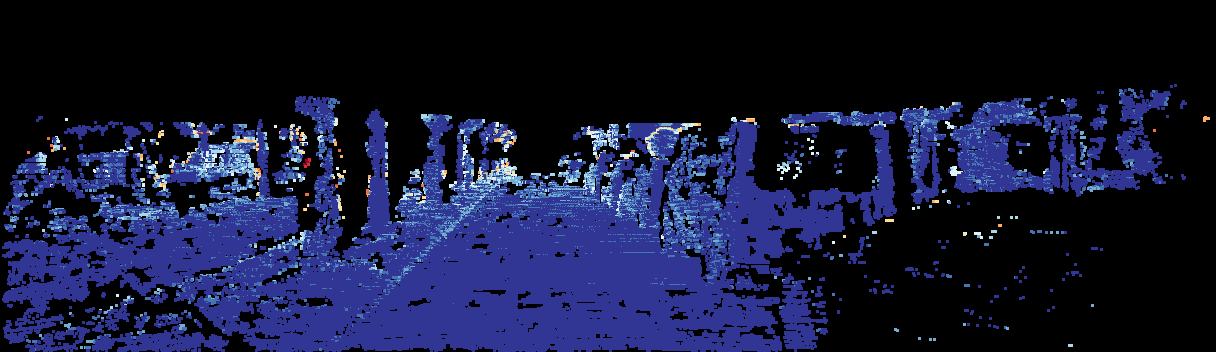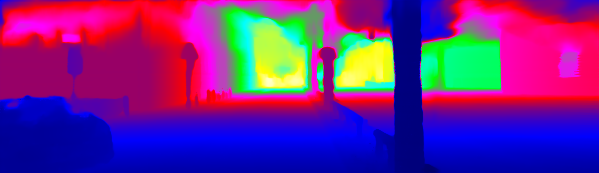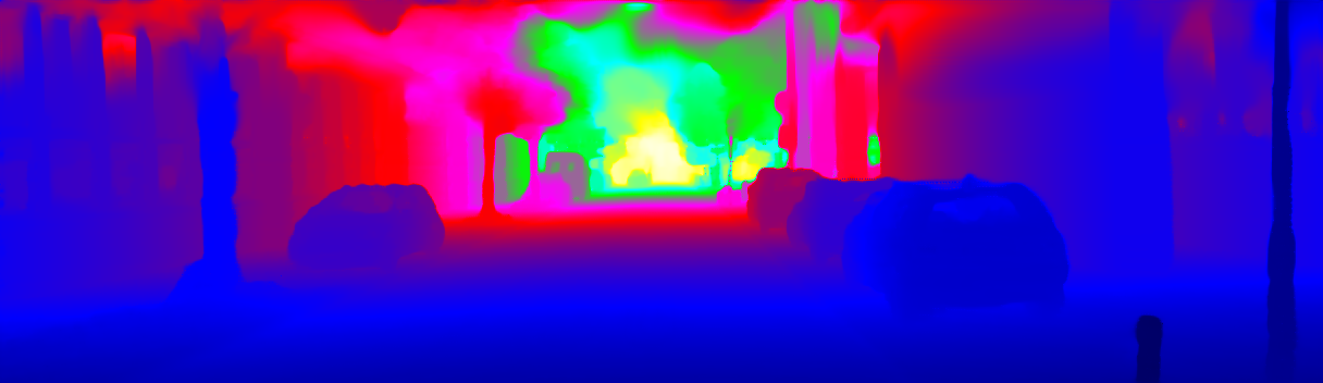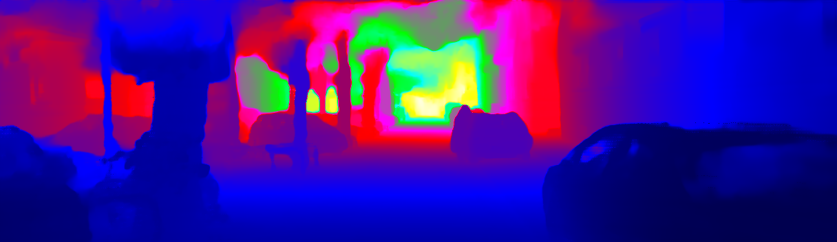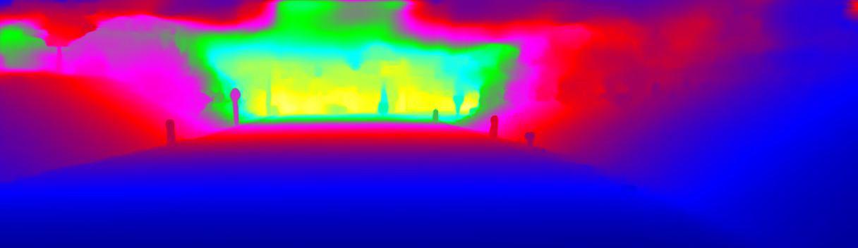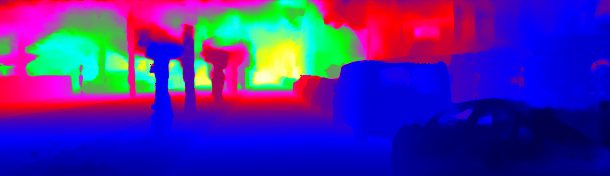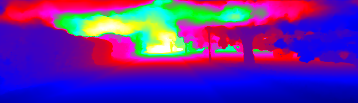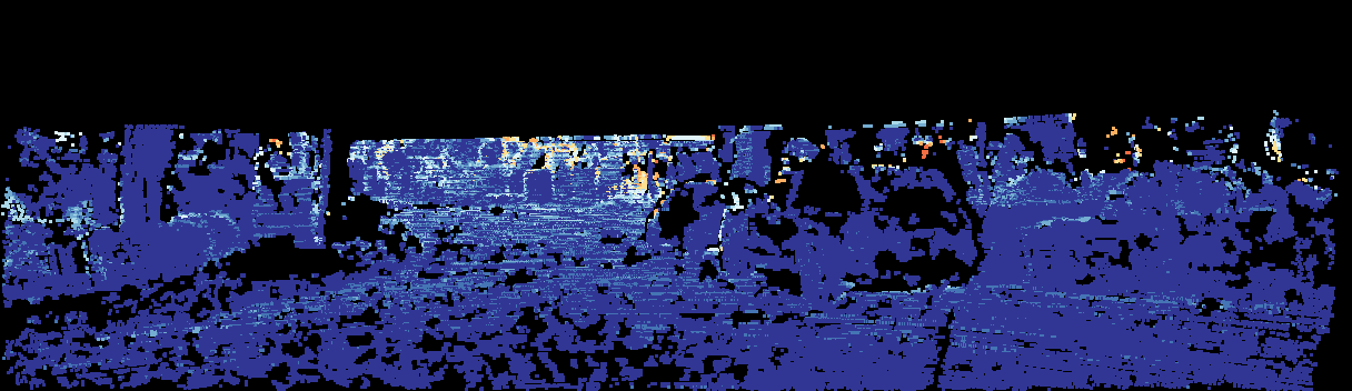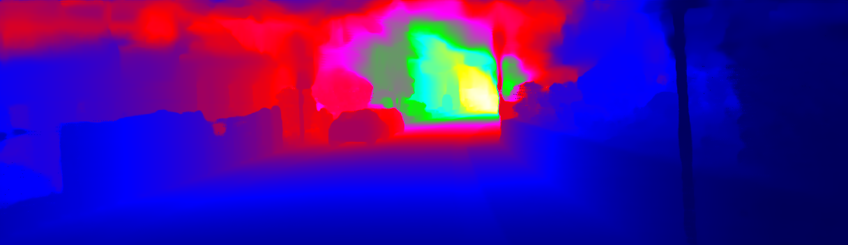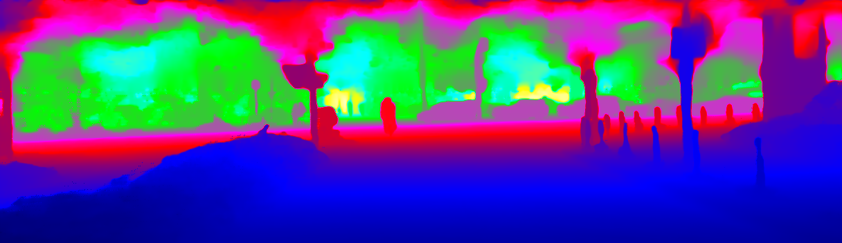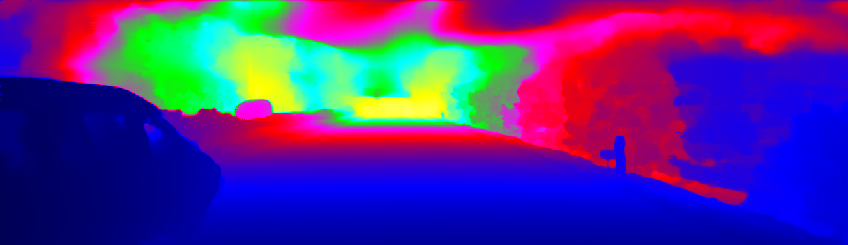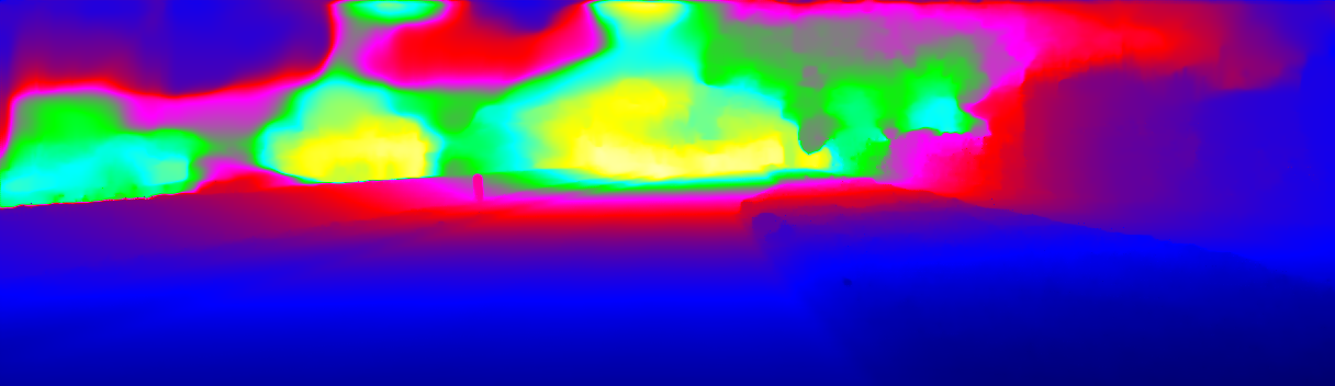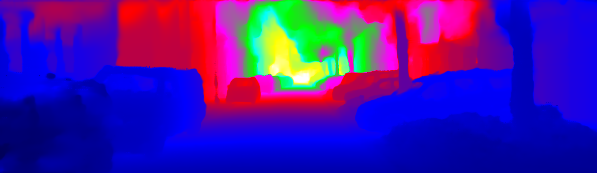 This page provides detailed results for the method(s) selected. For the first 20 test images, the percentage of erroneous pixels is depicted in the table. We use the error metric described in Sparsity Invariant CNNs (THREEDV 2017), which considers a pixel to be correctly estimated if the disparity or flow end-point error is <3px or <5% (for scene flow this criterion needs to be fulfilled for both disparity maps and the flow map). Underneath, the left input image, the estimated results and the error maps are shown (for disp_0/disp_1/flow/scene_flow, respectively). The error map uses the log-color scale described in Sparsity Invariant CNNs (THREEDV 2017), depicting correct estimates (<3px or <5% error) in blue and wrong estimates in red color tones. Dark regions in the error images denote the occluded pixels which fall outside the image boundaries. The false color maps of the results are scaled to the largest ground truth disparity values / flow magnitudes.