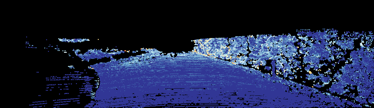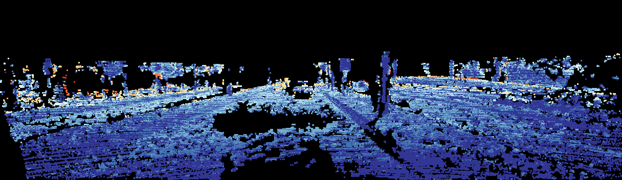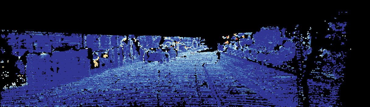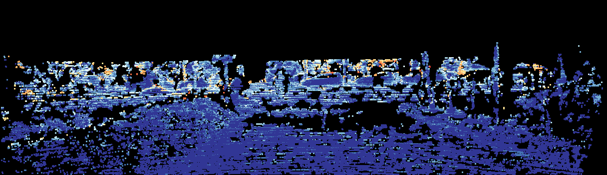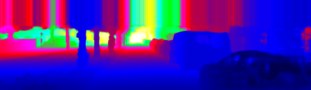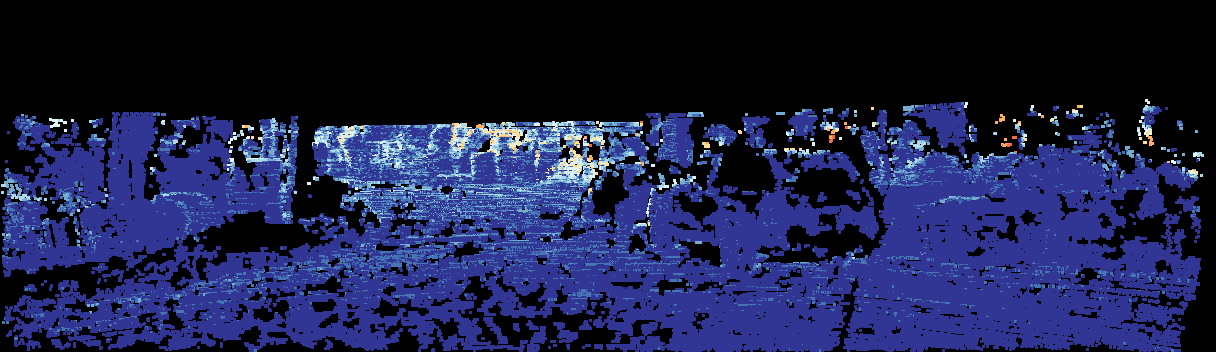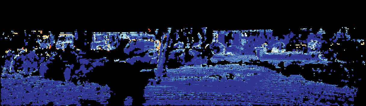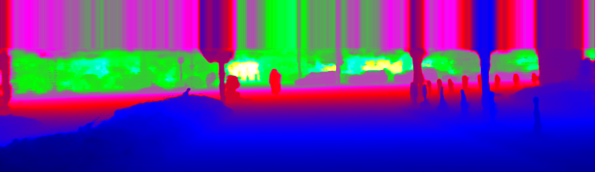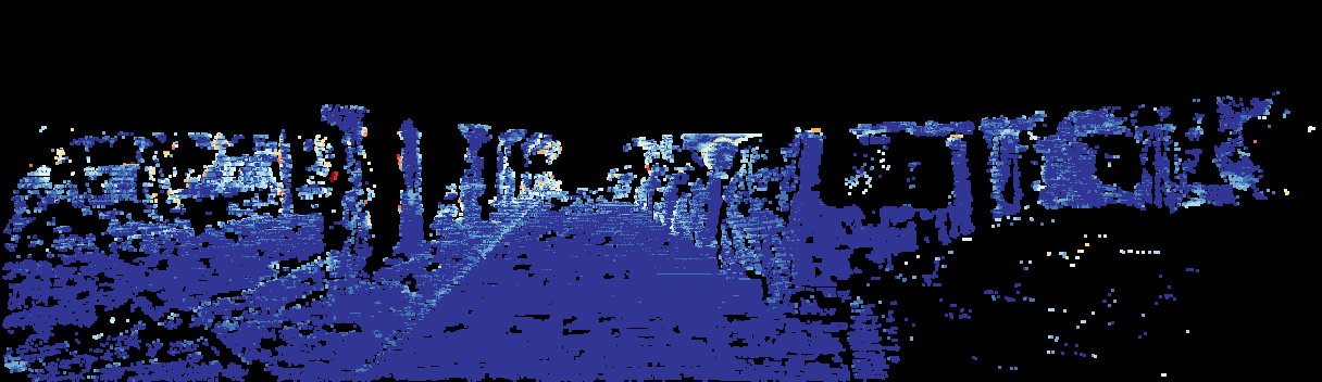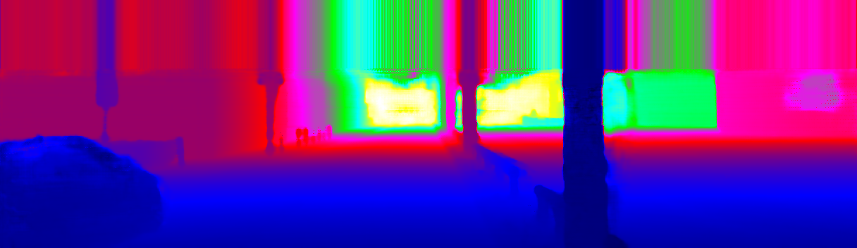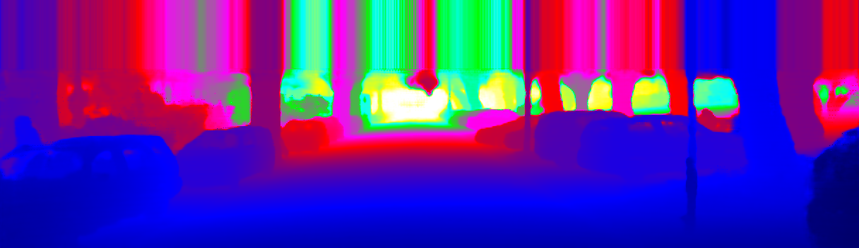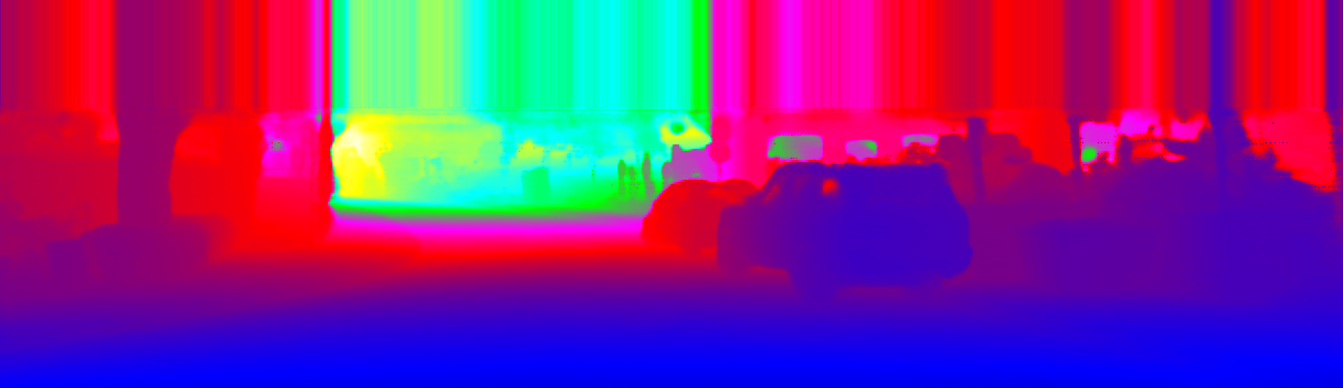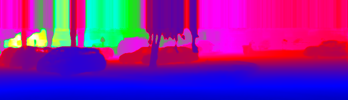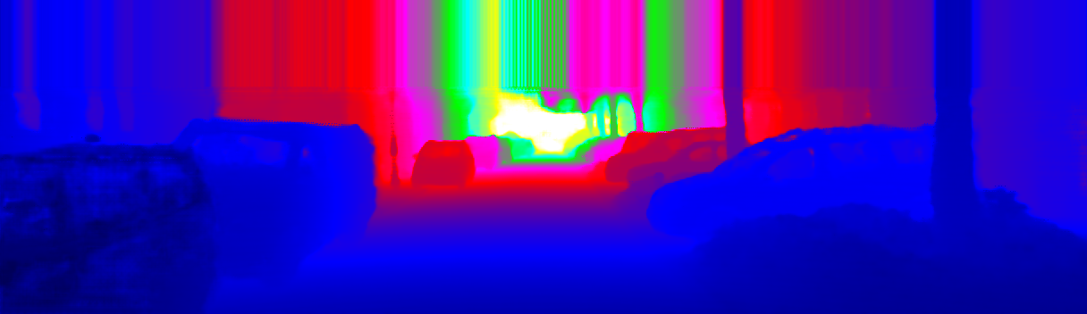 This page provides detailed results for the method(s) selected. For the first 20 test images, the percentage of erroneous pixels is depicted in the table. We use the error metric described in Sparsity Invariant CNNs (THREEDV 2017), which considers a pixel to be correctly estimated if the disparity or flow end-point error is <3px or <5% (for scene flow this criterion needs to be fulfilled for both disparity maps and the flow map). Underneath, the left input image, the estimated results and the error maps are shown (for disp_0/disp_1/flow/scene_flow, respectively). The error map uses the log-color scale described in Sparsity Invariant CNNs (THREEDV 2017), depicting correct estimates (<3px or <5% error) in blue and wrong estimates in red color tones. Dark regions in the error images denote the occluded pixels which fall outside the image boundaries. The false color maps of the results are scaled to the largest ground truth disparity values / flow magnitudes.