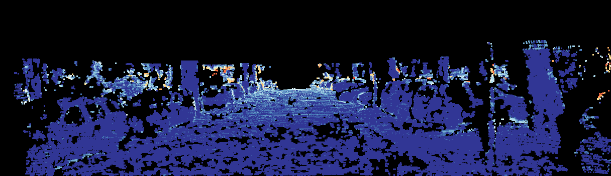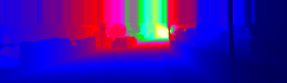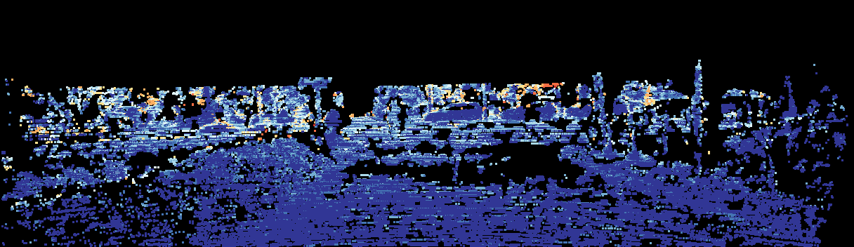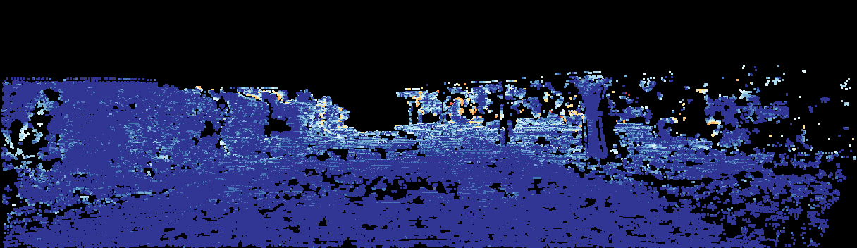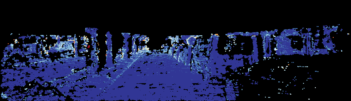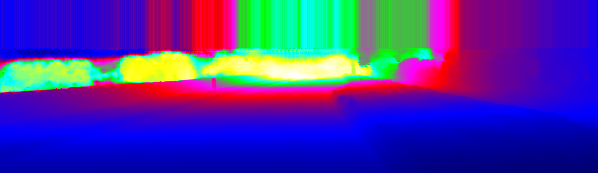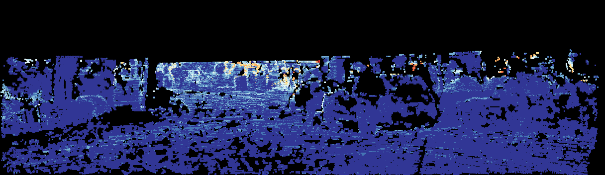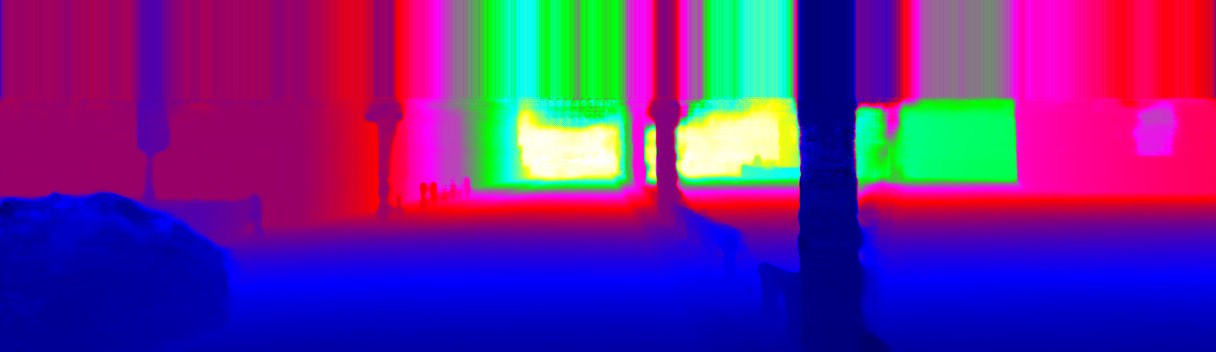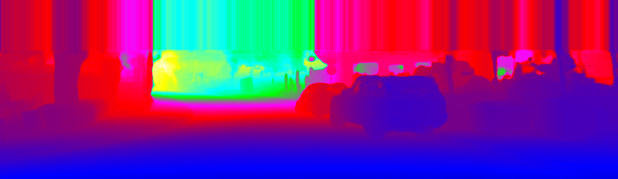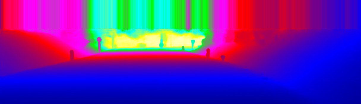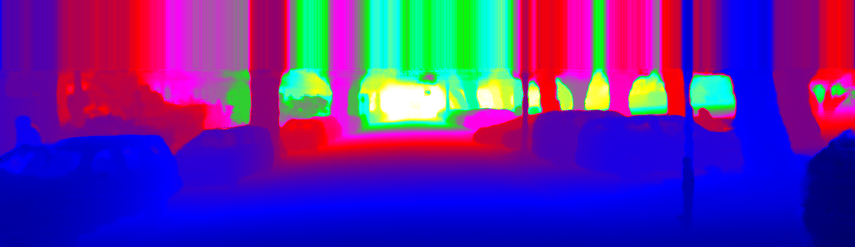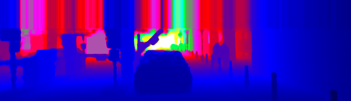 This page provides detailed results for the method(s) selected. For the first 20 test images, the percentage of erroneous pixels is depicted in the table. We use the error metric described in Sparsity Invariant CNNs (THREEDV 2017), which considers a pixel to be correctly estimated if the disparity or flow end-point error is <3px or <5% (for scene flow this criterion needs to be fulfilled for both disparity maps and the flow map). Underneath, the left input image, the estimated results and the error maps are shown (for disp_0/disp_1/flow/scene_flow, respectively). The error map uses the log-color scale described in Sparsity Invariant CNNs (THREEDV 2017), depicting correct estimates (<3px or <5% error) in blue and wrong estimates in red color tones. Dark regions in the error images denote the occluded pixels which fall outside the image boundaries. The false color maps of the results are scaled to the largest ground truth disparity values / flow magnitudes.