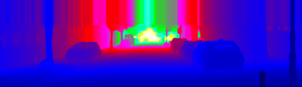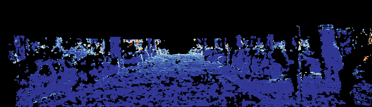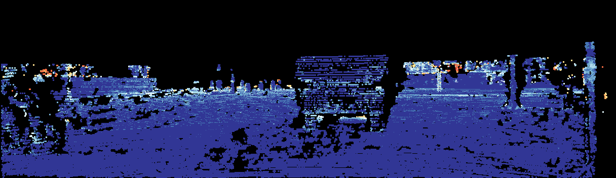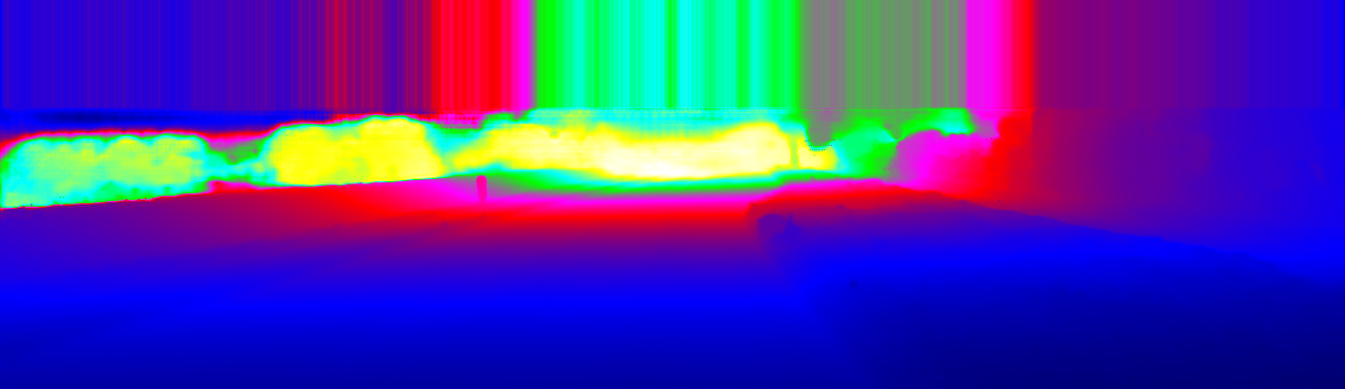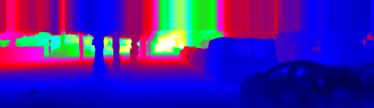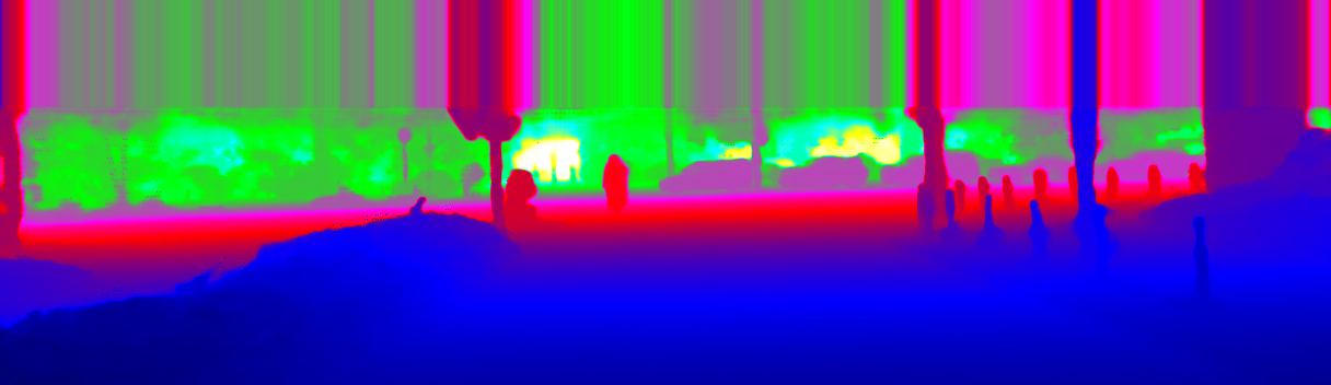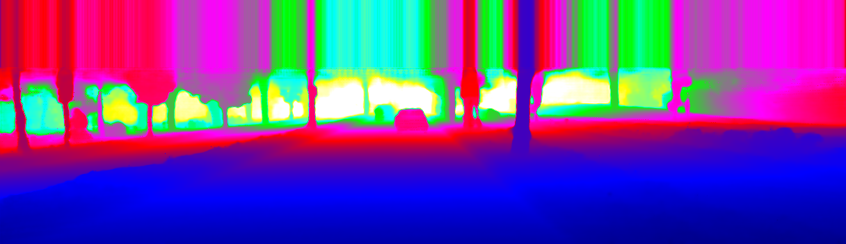 This page provides detailed results for the method(s) selected. For the first 20 test images, the percentage of erroneous pixels is depicted in the table. We use the error metric described in Sparsity Invariant CNNs (THREEDV 2017), which considers a pixel to be correctly estimated if the disparity or flow end-point error is <3px or <5% (for scene flow this criterion needs to be fulfilled for both disparity maps and the flow map). Underneath, the left input image, the estimated results and the error maps are shown (for disp_0/disp_1/flow/scene_flow, respectively). The error map uses the log-color scale described in Sparsity Invariant CNNs (THREEDV 2017), depicting correct estimates (<3px or <5% error) in blue and wrong estimates in red color tones. Dark regions in the error images denote the occluded pixels which fall outside the image boundaries. The false color maps of the results are scaled to the largest ground truth disparity values / flow magnitudes.