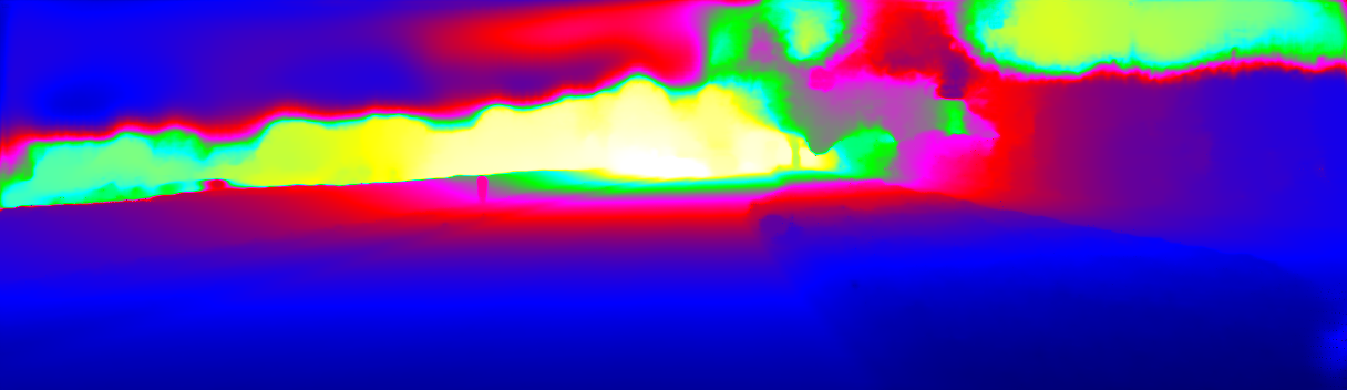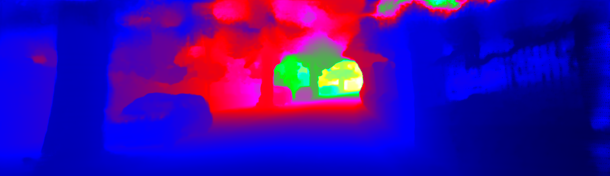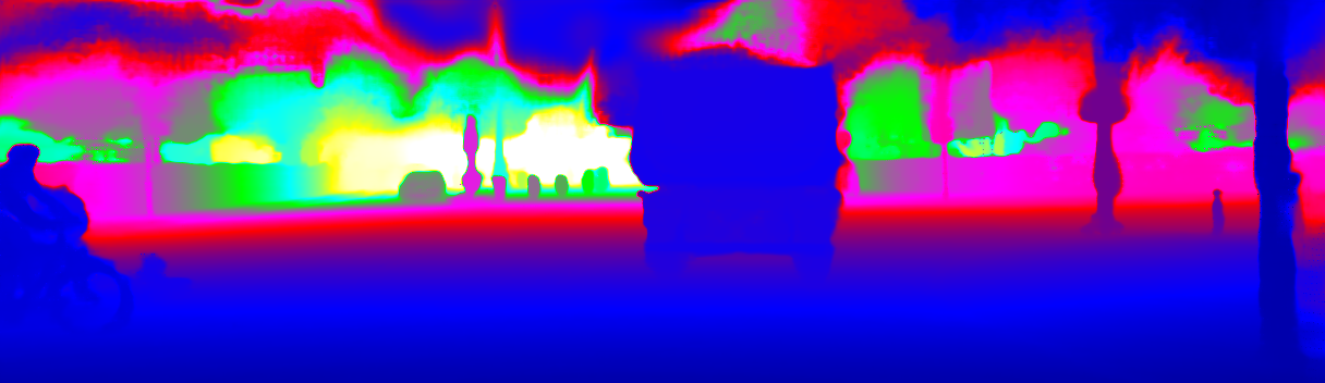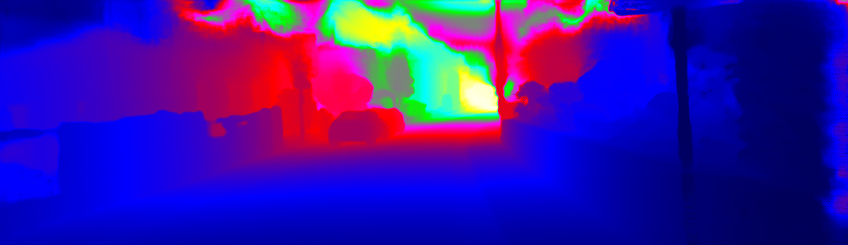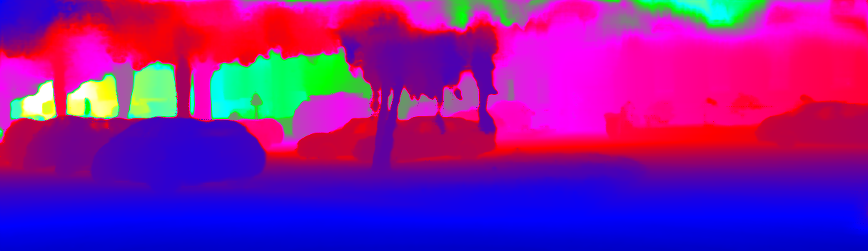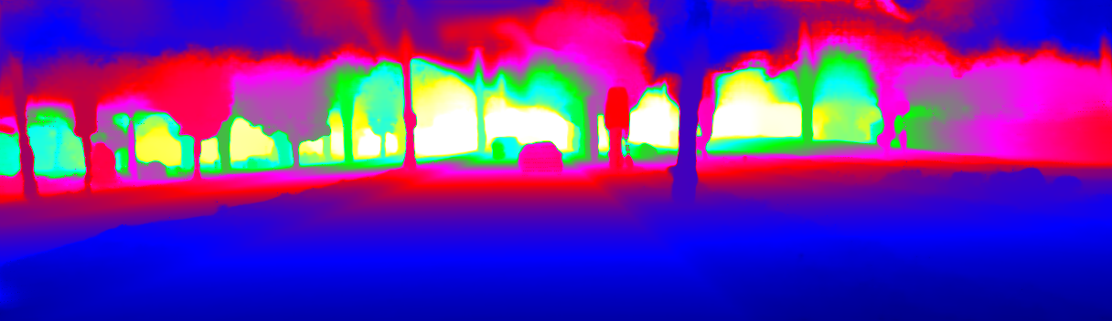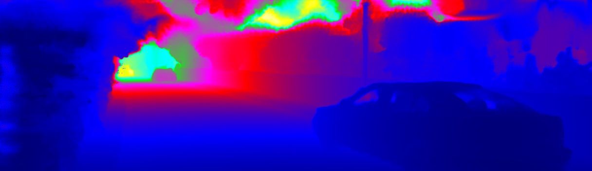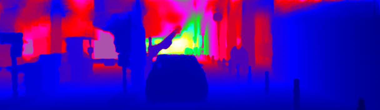 This page provides detailed results for the method(s) selected. For the first 20 test images, the percentage of erroneous pixels is depicted in the table. We use the error metric described in Sparsity Invariant CNNs (THREEDV 2017), which considers a pixel to be correctly estimated if the disparity or flow end-point error is <3px or <5% (for scene flow this criterion needs to be fulfilled for both disparity maps and the flow map). Underneath, the left input image, the estimated results and the error maps are shown (for disp_0/disp_1/flow/scene_flow, respectively). The error map uses the log-color scale described in Sparsity Invariant CNNs (THREEDV 2017), depicting correct estimates (<3px or <5% error) in blue and wrong estimates in red color tones. Dark regions in the error images denote the occluded pixels which fall outside the image boundaries. The false color maps of the results are scaled to the largest ground truth disparity values / flow magnitudes.