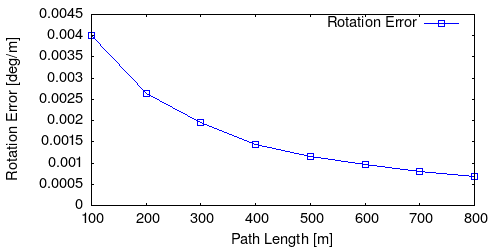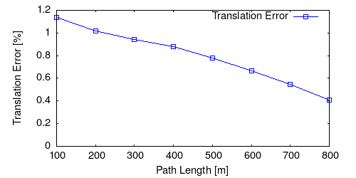 From all test sequences (sequences 11-21), our benchmark computes translational and rotational errors for all possible subsequences of length (5,10,50,100,150,...,400) meters. Our evaluation ranks methods according to the average of those values, where errors are measured in percent (for translation) and in degrees per meter (for rotation). Details for different trajectory lengths and driving speeds can be found in the plots underneath. Furthermore, the first 5 test trajectories and error plots are shown below.