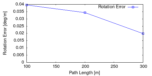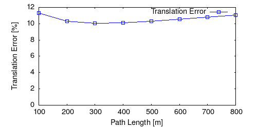 From all test sequences (sequences 11-21), our benchmark computes translational and rotational errors for all possible subsequences of length (5,10,50,100,150,...,400) meters. Our evaluation ranks methods according to the average of those values, where errors are measured in percent (for translation) and in degrees per meter (for rotation). Details for different trajectory lengths and driving speeds can be found in the plots underneath. Furthermore, the first 5 test trajectories and error plots are shown below.