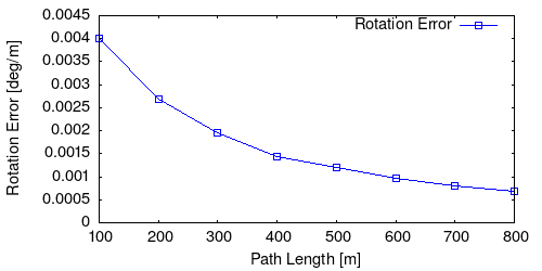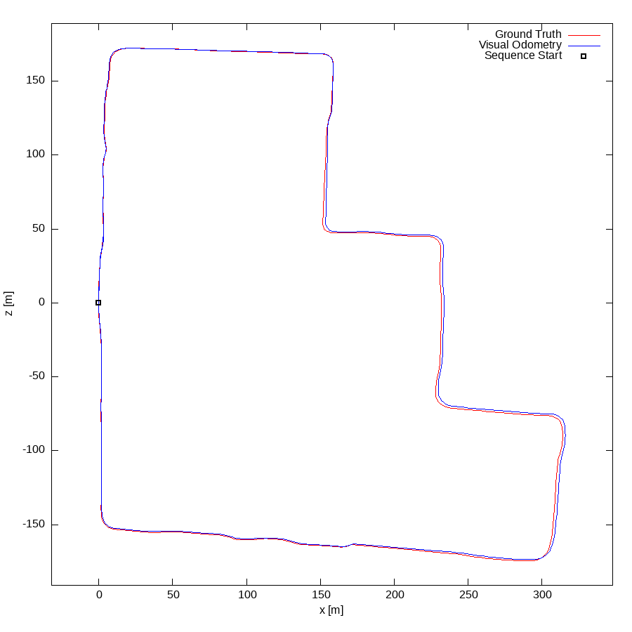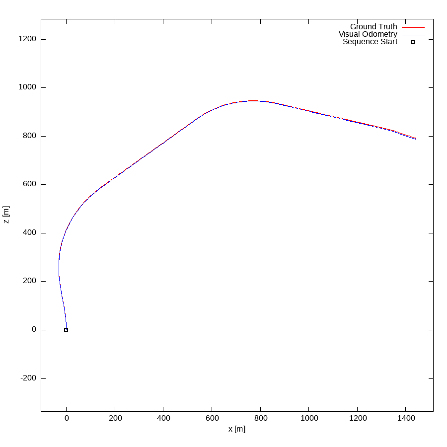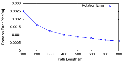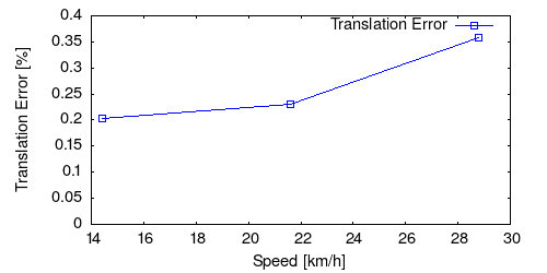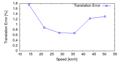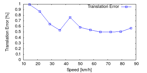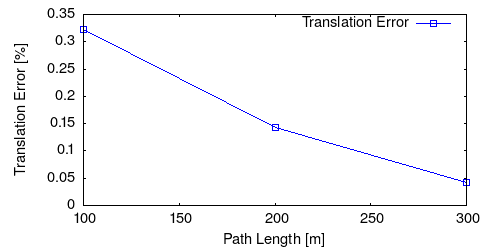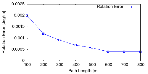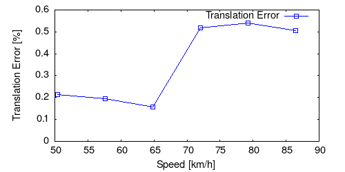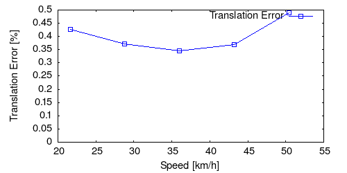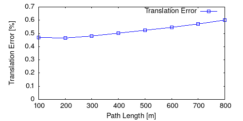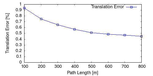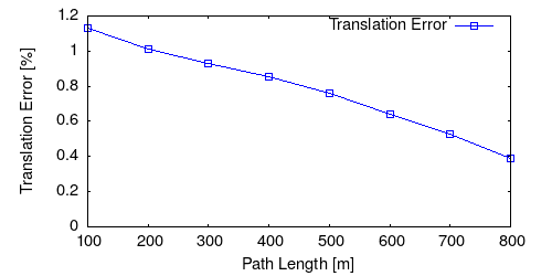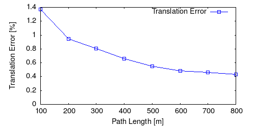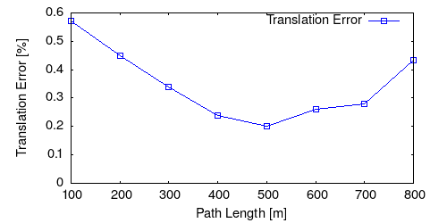 From all test sequences (sequences 11-21), our benchmark computes translational and rotational errors for all possible subsequences of length (5,10,50,100,150,...,400) meters. Our evaluation ranks methods according to the average of those values, where errors are measured in percent (for translation) and in degrees per meter (for rotation). Details for different trajectory lengths and driving speeds can be found in the plots underneath. Furthermore, the first 5 test trajectories and error plots are shown below.