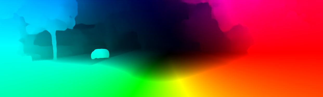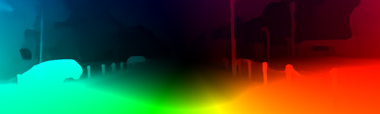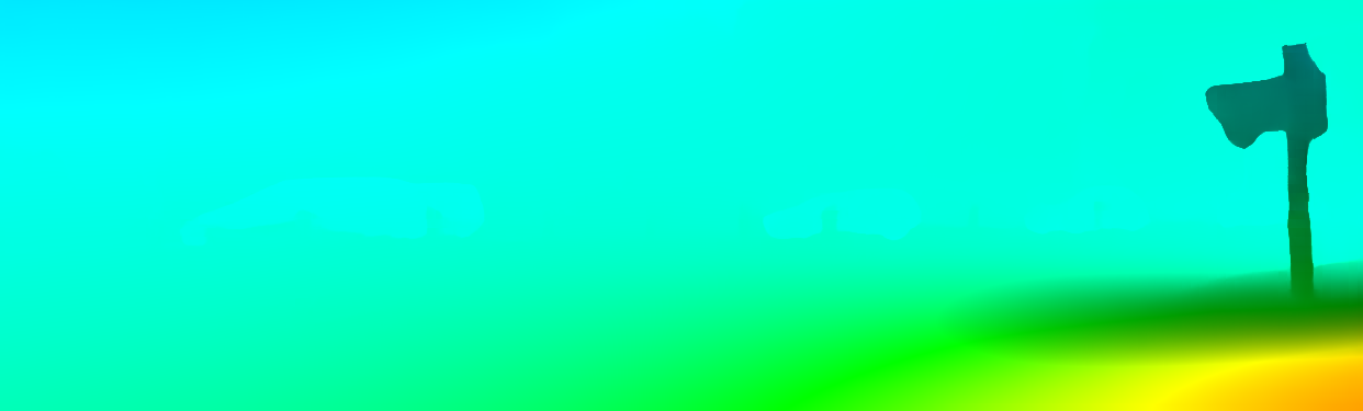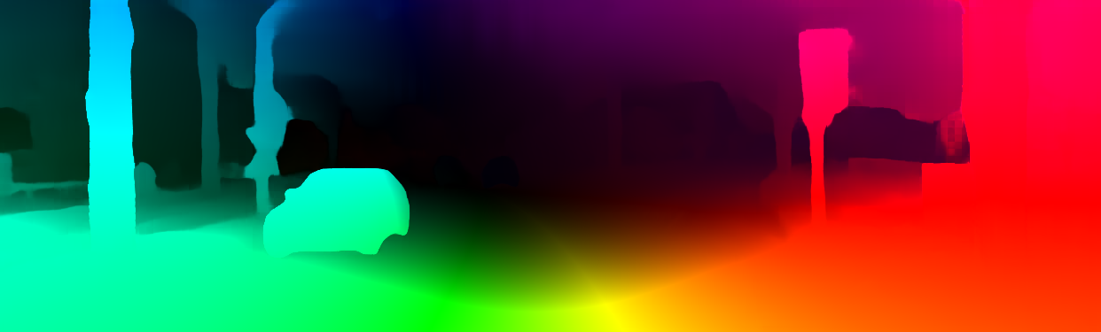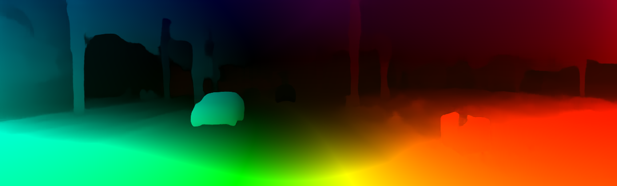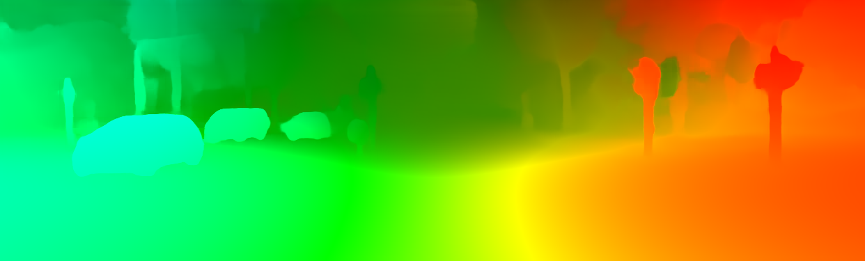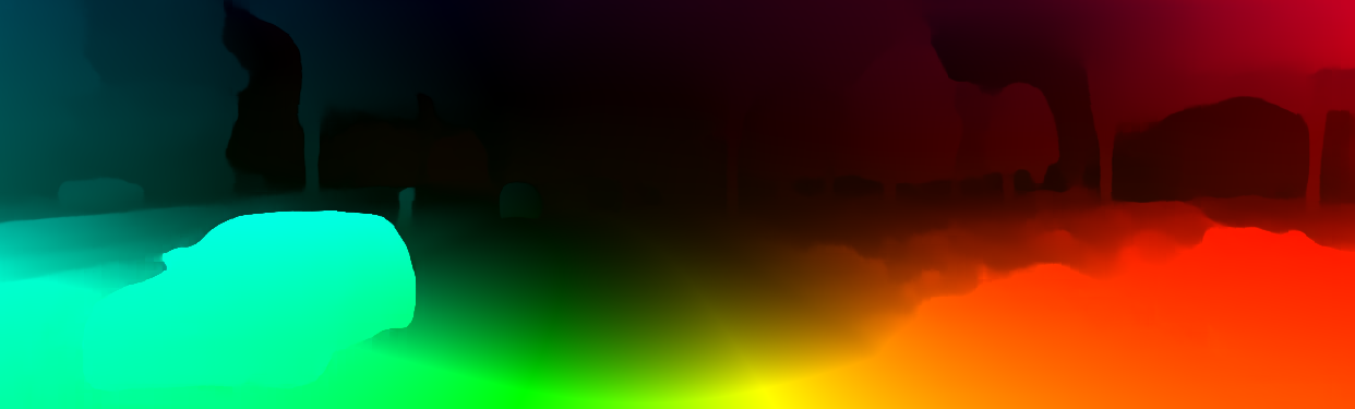 This page provides detailed results for the method(s) selected. For the first 20 test images, the percentage of erroneous pixels is depicted in the table. We use the error metric described in Object Scene Flow for Autonomous Vehicles (CVPR 2015), which considers a pixel to be correctly estimated if the disparity or flow end-point error is <3px or <5% (for scene flow this criterion needs to be fulfilled for both disparity maps and the flow map). Underneath, the left input image, the estimated results and the error maps are shown (for disp_0/disp_1/flow/scene_flow, respectively). The error map uses the log-color scale described in Object Scene Flow for Autonomous Vehicles (CVPR 2015), depicting correct estimates (<3px or <5% error) in blue and wrong estimates in red color tones. Dark regions in the error images denote the occluded pixels which fall outside the image boundaries. The false color maps of the results are scaled to the largest ground truth disparity values / flow magnitudes.