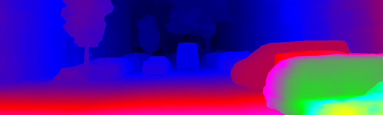 This page provides detailed results for the method(s) selected. For the first 20 test images, the percentage of erroneous pixels is depicted in the table. We use the error metric described in Object Scene Flow for Autonomous Vehicles (CVPR 2015), which considers a pixel to be correctly estimated if the disparity or flow end-point error is <3px or <5% (for scene flow this criterion needs to be fulfilled for both disparity maps and the flow map). Underneath, the left input image, the estimated results and the error maps are shown (for disp_0/disp_1/flow/scene_flow, respectively). The error map uses the log-color scale described in Object Scene Flow for Autonomous Vehicles (CVPR 2015), depicting correct estimates (<3px or <5% error) in blue and wrong estimates in red color tones. Dark regions in the error images denote the occluded pixels which fall outside the image boundaries. The false color maps of the results are scaled to the largest ground truth disparity values / flow magnitudes.