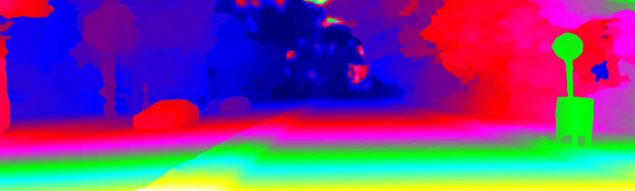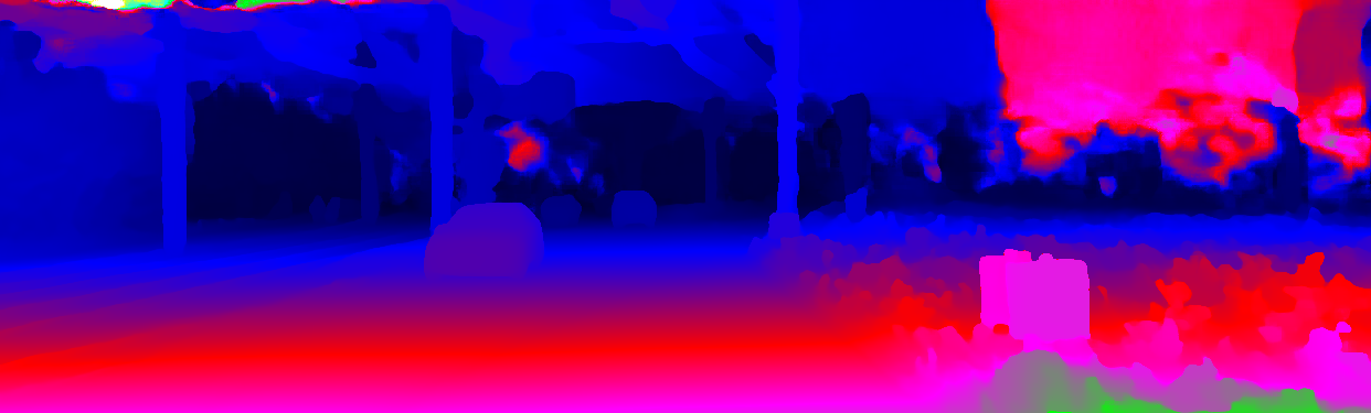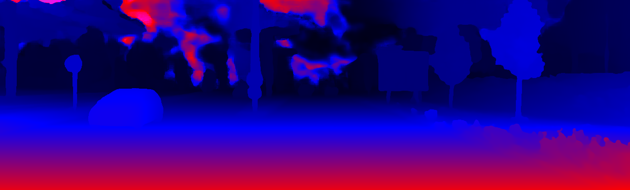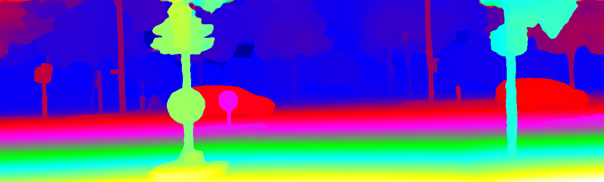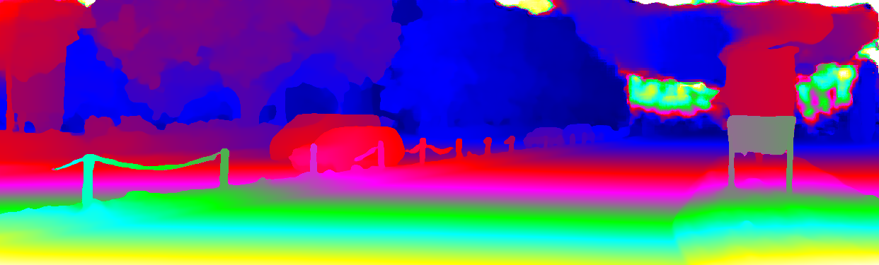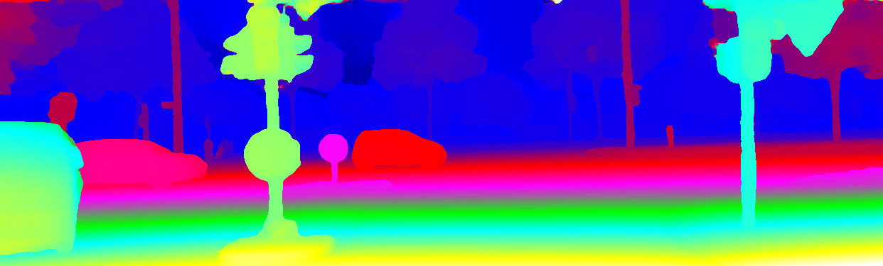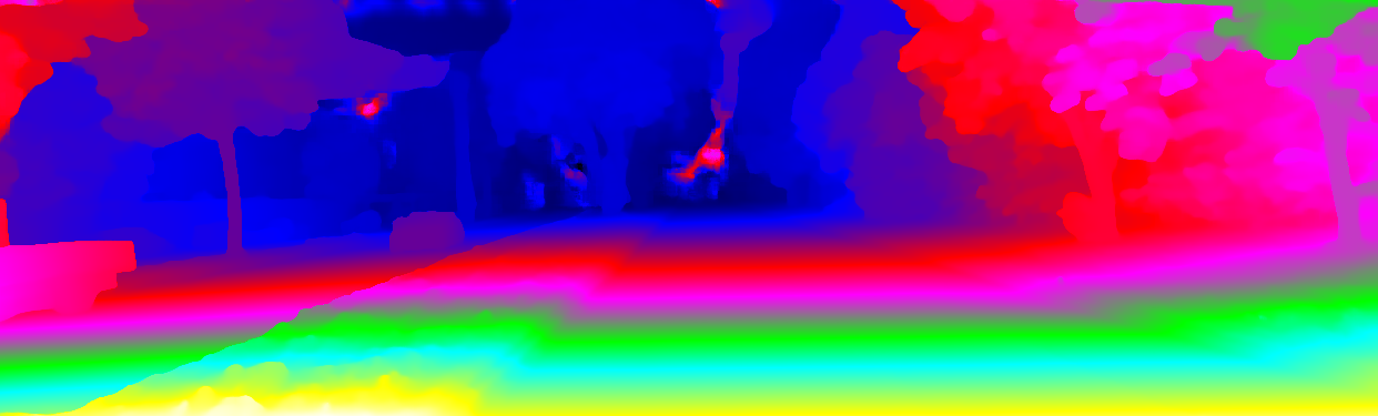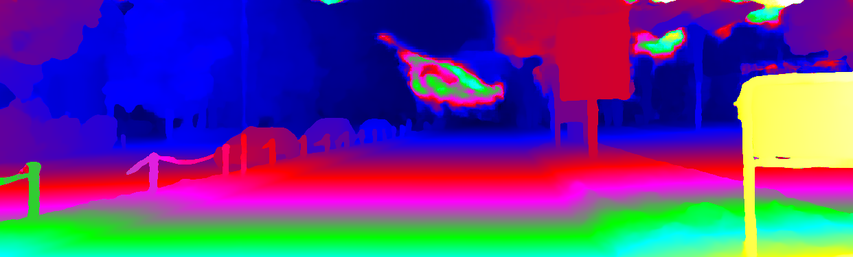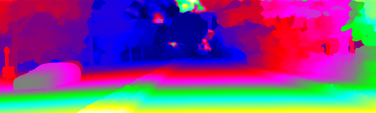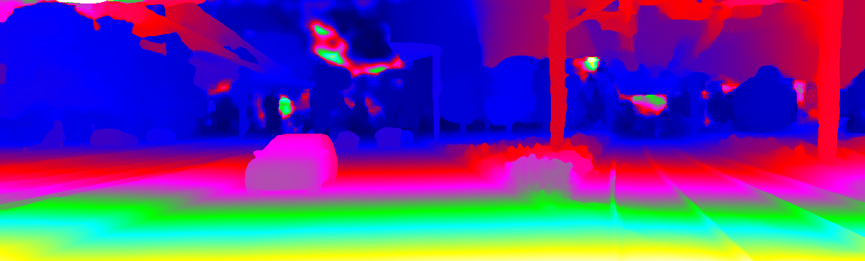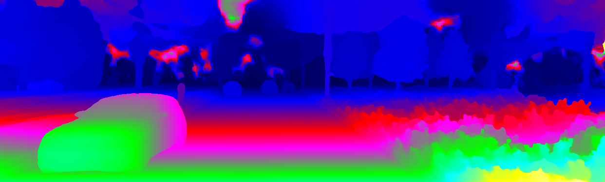 This page provides detailed results for the method(s) selected. For the first 20 test images, the percentage of erroneous pixels is depicted in the table. We use the error metric described in Object Scene Flow for Autonomous Vehicles (CVPR 2015), which considers a pixel to be correctly estimated if the disparity or flow end-point error is <3px or <5% (for scene flow this criterion needs to be fulfilled for both disparity maps and the flow map). Underneath, the left input image, the estimated results and the error maps are shown (for disp_0/disp_1/flow/scene_flow, respectively). The error map uses the log-color scale described in Object Scene Flow for Autonomous Vehicles (CVPR 2015), depicting correct estimates (<3px or <5% error) in blue and wrong estimates in red color tones. Dark regions in the error images denote the occluded pixels which fall outside the image boundaries. The false color maps of the results are scaled to the largest ground truth disparity values / flow magnitudes.