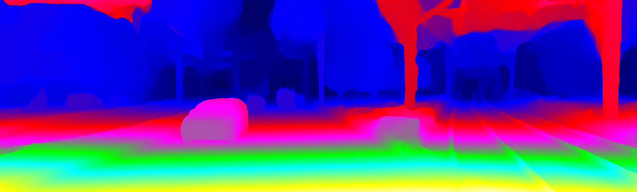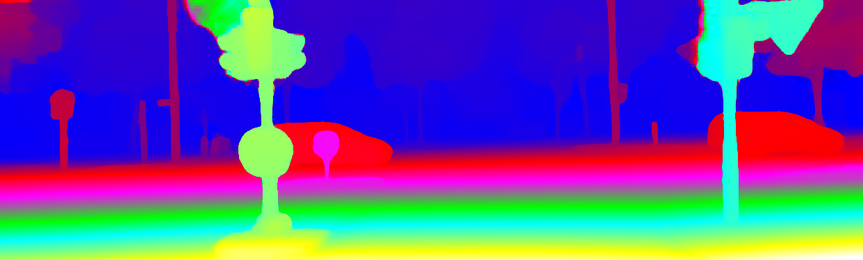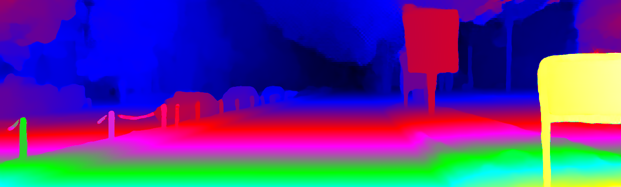 This page provides detailed results for the method(s) selected. For the first 20 test images, the percentage of erroneous pixels is depicted in the table. We use the error metric described in Object Scene Flow for Autonomous Vehicles (CVPR 2015), which considers a pixel to be correctly estimated if the disparity or flow end-point error is <3px or <5% (for scene flow this criterion needs to be fulfilled for both disparity maps and the flow map). Underneath, the left input image, the estimated results and the error maps are shown (for disp_0/disp_1/flow/scene_flow, respectively). The error map uses the log-color scale described in Object Scene Flow for Autonomous Vehicles (CVPR 2015), depicting correct estimates (<3px or <5% error) in blue and wrong estimates in red color tones. Dark regions in the error images denote the occluded pixels which fall outside the image boundaries. The false color maps of the results are scaled to the largest ground truth disparity values / flow magnitudes.