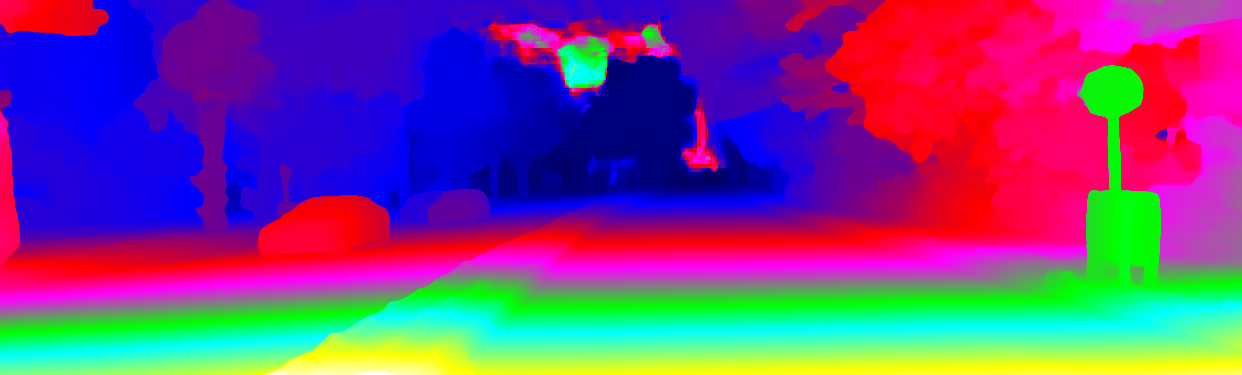 This page provides detailed results for the method(s) selected. For the first 20 test images, the percentage of erroneous pixels is depicted in the table. We use the error metric described in Object Scene Flow for Autonomous Vehicles (CVPR 2015), which considers a pixel to be correctly estimated if the disparity or flow end-point error is <3px or <5% (for scene flow this criterion needs to be fulfilled for both disparity maps and the flow map). Underneath, the left input image, the estimated results and the error maps are shown (for disp_0/disp_1/flow/scene_flow, respectively). The error map uses the log-color scale described in Object Scene Flow for Autonomous Vehicles (CVPR 2015), depicting correct estimates (<3px or <5% error) in blue and wrong estimates in red color tones. Dark regions in the error images denote the occluded pixels which fall outside the image boundaries. The false color maps of the results are scaled to the largest ground truth disparity values / flow magnitudes.