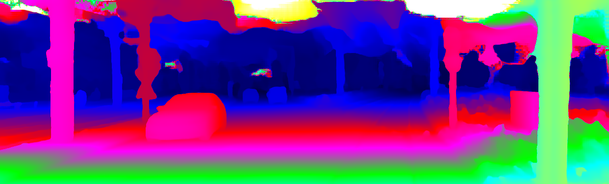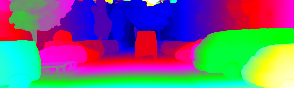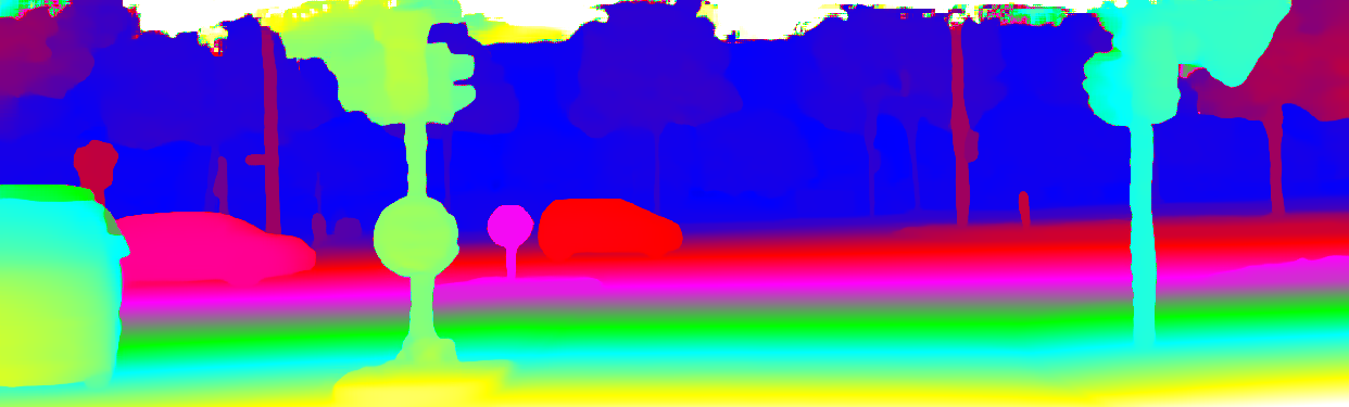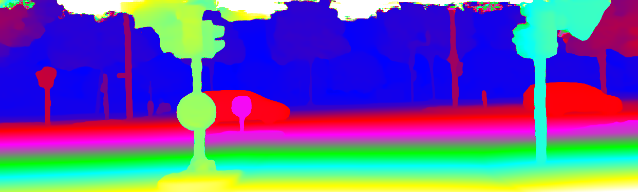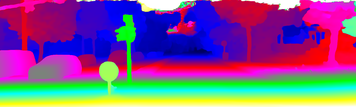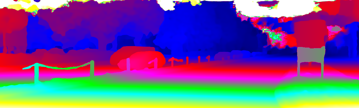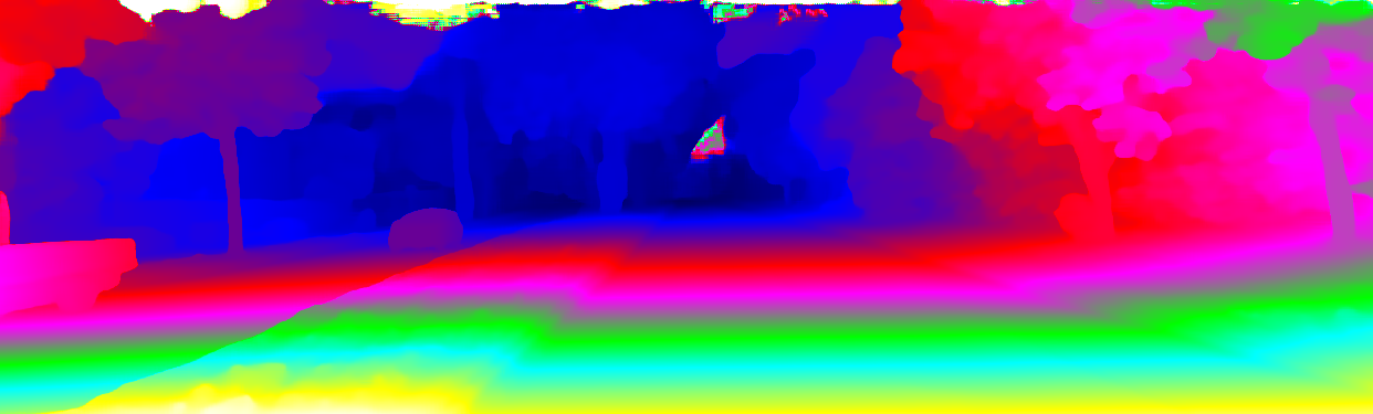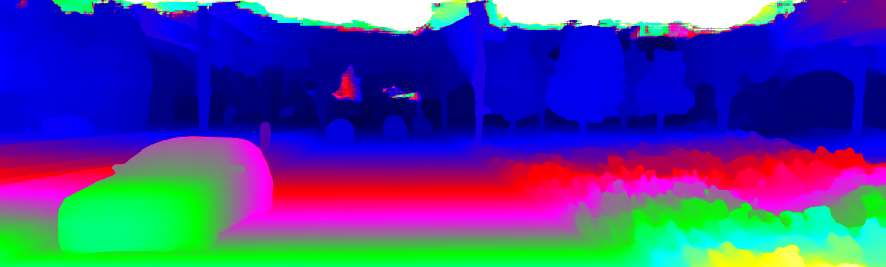 This page provides detailed results for the method(s) selected. For the first 20 test images, the percentage of erroneous pixels is depicted in the table. We use the error metric described in Object Scene Flow for Autonomous Vehicles (CVPR 2015), which considers a pixel to be correctly estimated if the disparity or flow end-point error is <3px or <5% (for scene flow this criterion needs to be fulfilled for both disparity maps and the flow map). Underneath, the left input image, the estimated results and the error maps are shown (for disp_0/disp_1/flow/scene_flow, respectively). The error map uses the log-color scale described in Object Scene Flow for Autonomous Vehicles (CVPR 2015), depicting correct estimates (<3px or <5% error) in blue and wrong estimates in red color tones. Dark regions in the error images denote the occluded pixels which fall outside the image boundaries. The false color maps of the results are scaled to the largest ground truth disparity values / flow magnitudes.
