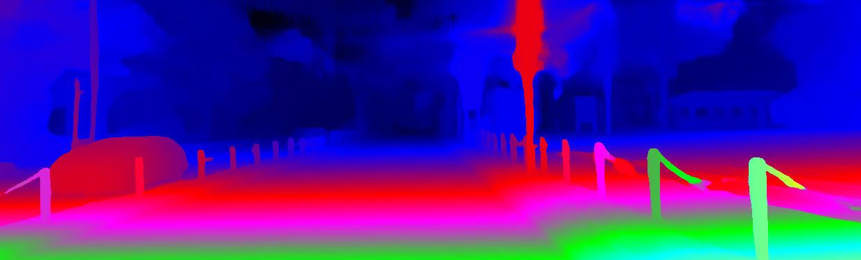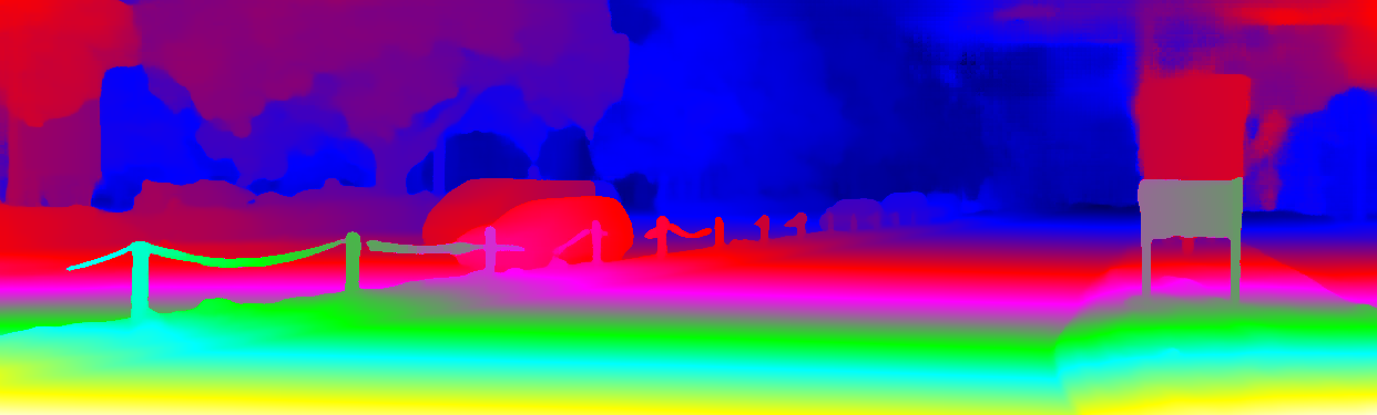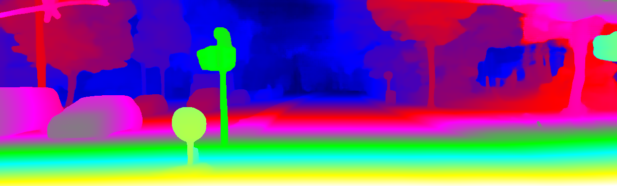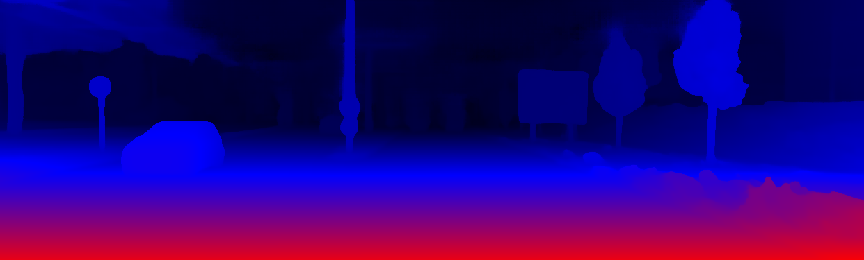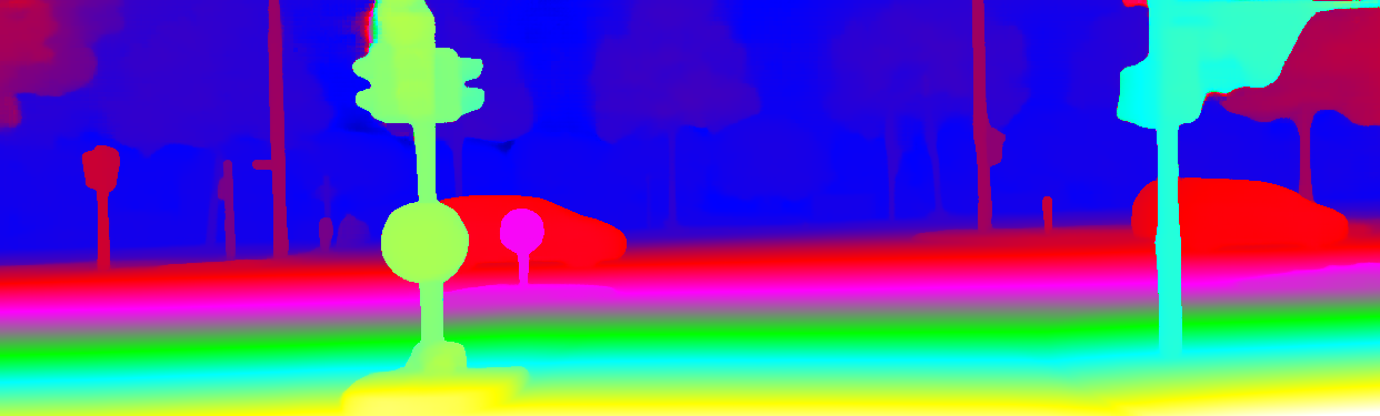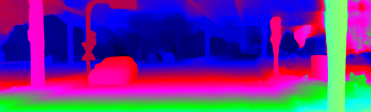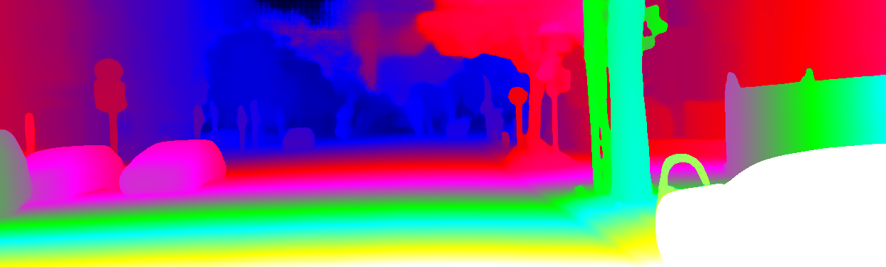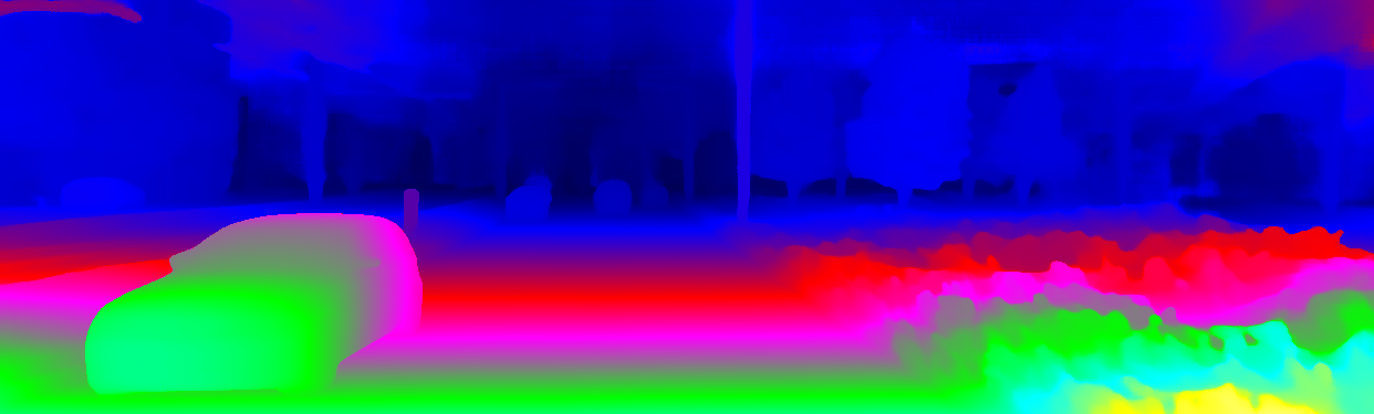This page provides detailed results for the method(s) selected. For the first 20 test images, the percentage of erroneous pixels is depicted in the table. We use the error metric described in Object Scene Flow for Autonomous Vehicles (CVPR 2015), which considers a pixel to be correctly estimated if the disparity or flow end-point error is <3px or <5% (for scene flow this criterion needs to be fulfilled for both disparity maps and the flow map). Underneath, the left input image, the estimated results and the error maps are shown (for disp_0/disp_1/flow/scene_flow, respectively). The error map uses the log-color scale described in Object Scene Flow for Autonomous Vehicles (CVPR 2015), depicting correct estimates (<3px or <5% error) in blue and wrong estimates in red color tones. Dark regions in the error images denote the occluded pixels which fall outside the image boundaries. The false color maps of the results are scaled to the largest ground truth disparity values / flow magnitudes.