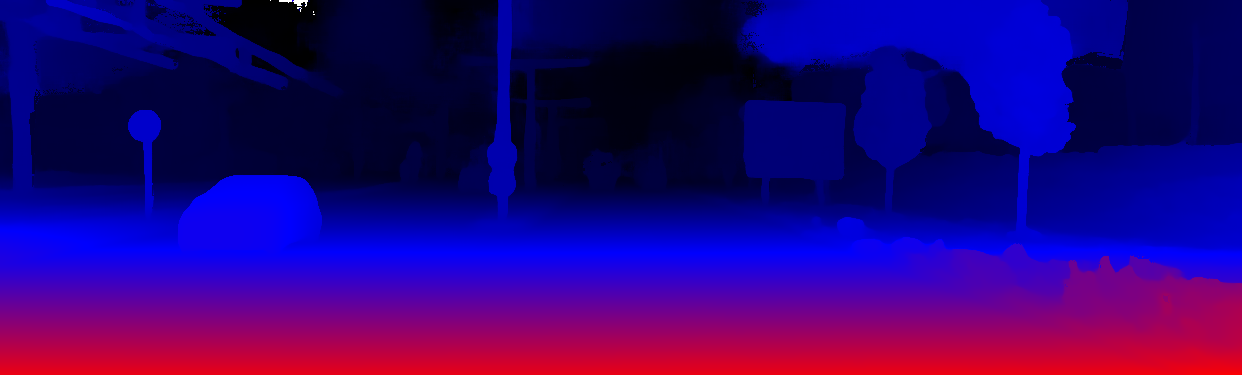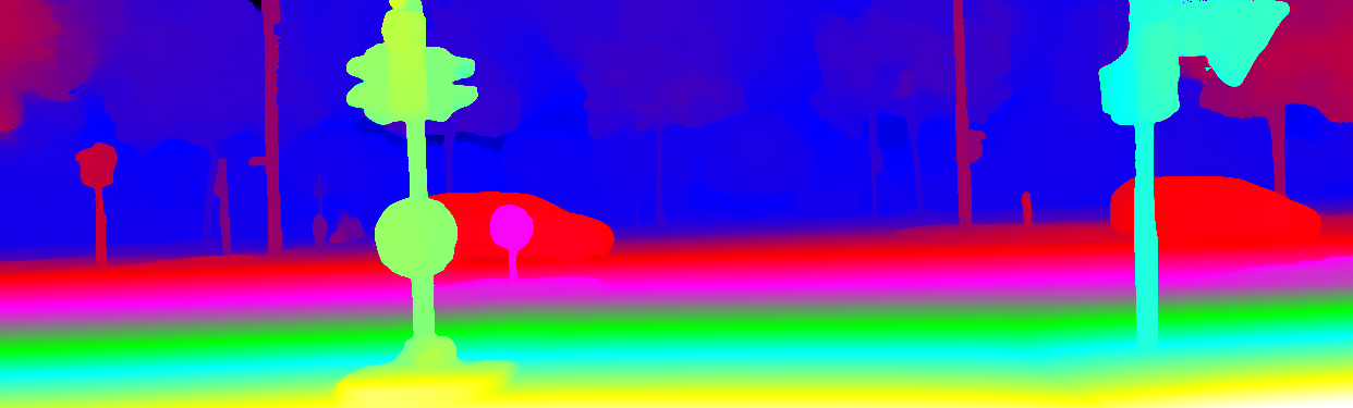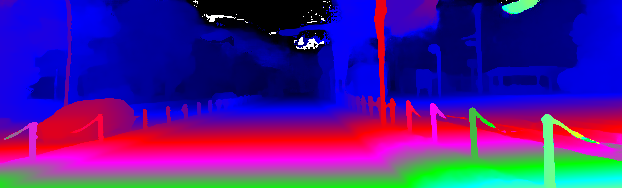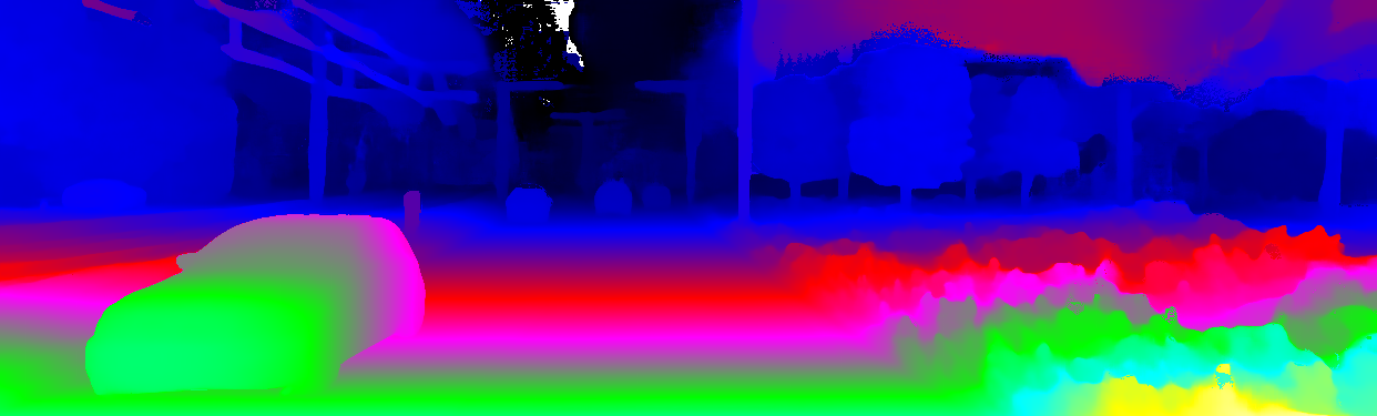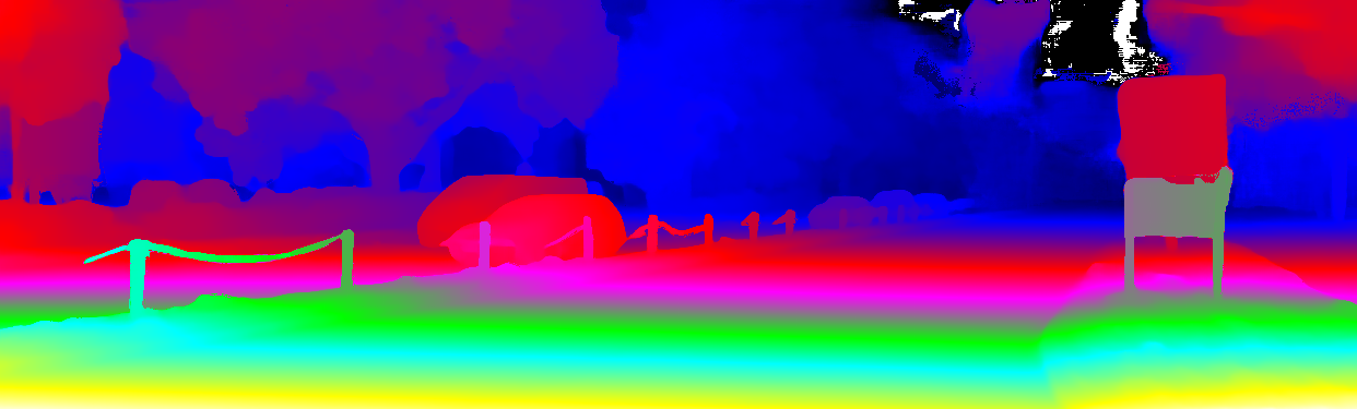 This page provides detailed results for the method(s) selected. For the first 20 test images, the percentage of erroneous pixels is depicted in the table. We use the error metric described in Object Scene Flow for Autonomous Vehicles (CVPR 2015), which considers a pixel to be correctly estimated if the disparity or flow end-point error is <3px or <5% (for scene flow this criterion needs to be fulfilled for both disparity maps and the flow map). Underneath, the left input image, the estimated results and the error maps are shown (for disp_0/disp_1/flow/scene_flow, respectively). The error map uses the log-color scale described in Object Scene Flow for Autonomous Vehicles (CVPR 2015), depicting correct estimates (<3px or <5% error) in blue and wrong estimates in red color tones. Dark regions in the error images denote the occluded pixels which fall outside the image boundaries. The false color maps of the results are scaled to the largest ground truth disparity values / flow magnitudes.