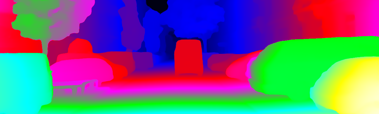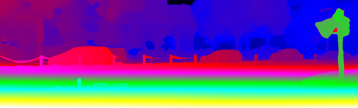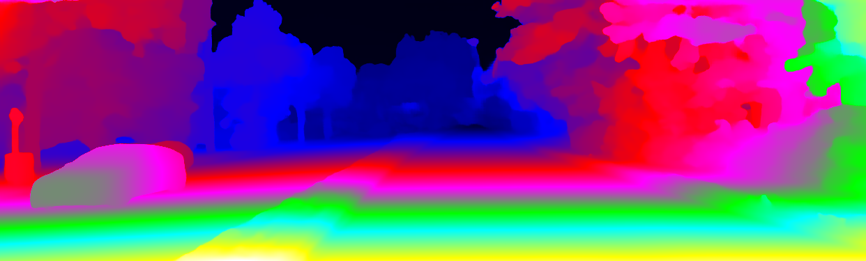 This page provides detailed results for the method(s) selected. For the first 20 test images, the percentage of erroneous pixels is depicted in the table. We use the error metric described in Object Scene Flow for Autonomous Vehicles (CVPR 2015), which considers a pixel to be correctly estimated if the disparity or flow end-point error is <3px or <5% (for scene flow this criterion needs to be fulfilled for both disparity maps and the flow map). Underneath, the left input image, the estimated results and the error maps are shown (for disp_0/disp_1/flow/scene_flow, respectively). The error map uses the log-color scale described in Object Scene Flow for Autonomous Vehicles (CVPR 2015), depicting correct estimates (<3px or <5% error) in blue and wrong estimates in red color tones. Dark regions in the error images denote the occluded pixels which fall outside the image boundaries. The false color maps of the results are scaled to the largest ground truth disparity values / flow magnitudes.