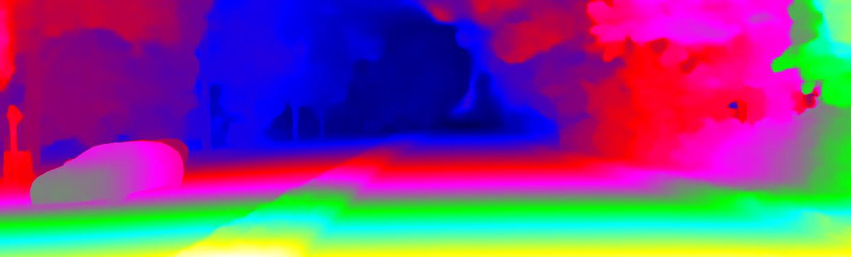 This page provides detailed results for the method(s) selected. For the first 20 test images, the percentage of erroneous pixels is depicted in the table. We use the error metric described in Object Scene Flow for Autonomous Vehicles (CVPR 2015), which considers a pixel to be correctly estimated if the disparity or flow end-point error is <3px or <5% (for scene flow this criterion needs to be fulfilled for both disparity maps and the flow map). Underneath, the left input image, the estimated results and the error maps are shown (for disp_0/disp_1/flow/scene_flow, respectively). The error map uses the log-color scale described in Object Scene Flow for Autonomous Vehicles (CVPR 2015), depicting correct estimates (<3px or <5% error) in blue and wrong estimates in red color tones. Dark regions in the error images denote the occluded pixels which fall outside the image boundaries. The false color maps of the results are scaled to the largest ground truth disparity values / flow magnitudes.