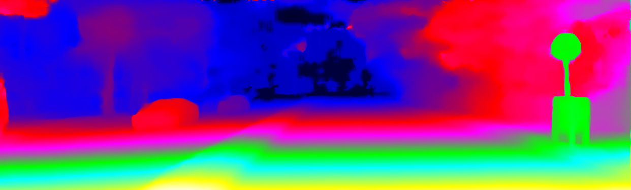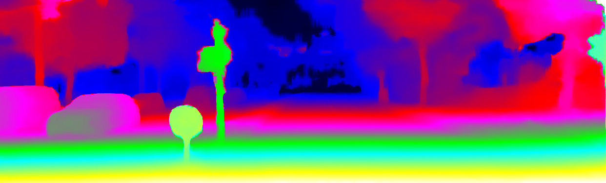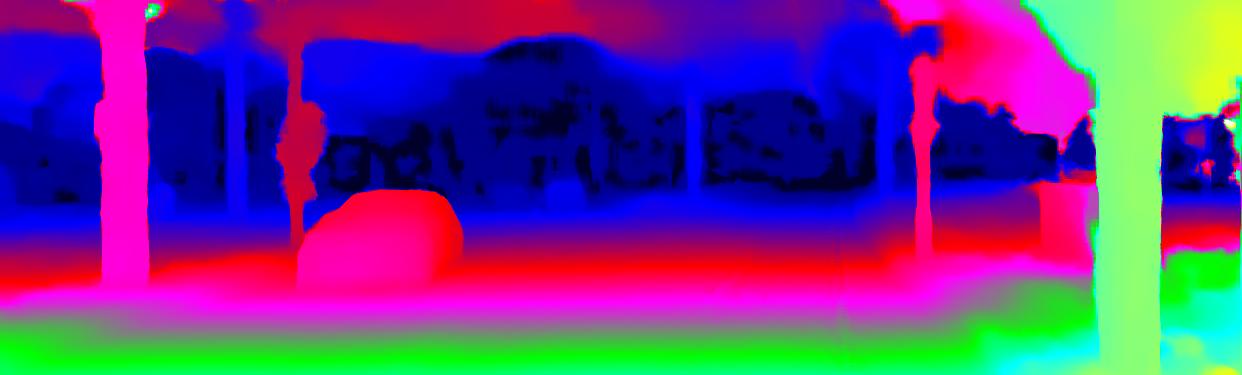 This page provides detailed results for the method(s) selected. For the first 20 test images, the percentage of erroneous pixels is depicted in the table. We use the error metric described in Object Scene Flow for Autonomous Vehicles (CVPR 2015), which considers a pixel to be correctly estimated if the disparity or flow end-point error is <3px or <5% (for scene flow this criterion needs to be fulfilled for both disparity maps and the flow map). Underneath, the left input image, the estimated results and the error maps are shown (for disp_0/disp_1/flow/scene_flow, respectively). The error map uses the log-color scale described in Object Scene Flow for Autonomous Vehicles (CVPR 2015), depicting correct estimates (<3px or <5% error) in blue and wrong estimates in red color tones. Dark regions in the error images denote the occluded pixels which fall outside the image boundaries. The false color maps of the results are scaled to the largest ground truth disparity values / flow magnitudes.